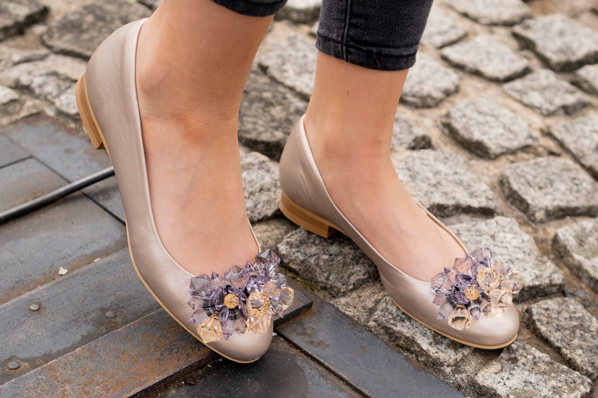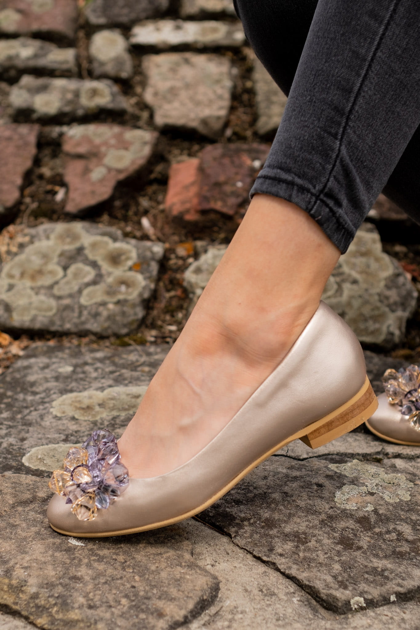 Baleriny model Monique to prostota połączona z przepięknym wyglądem. Prosta cholewka baleriny na klasycznej podeszwie została przyozdobiona przepięknymi kamieniami cudownie odbijającymi światło. Model ten na pewno ozdobi każdą stylizację.
