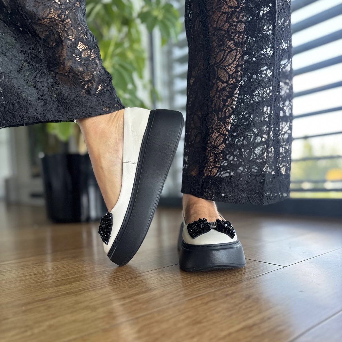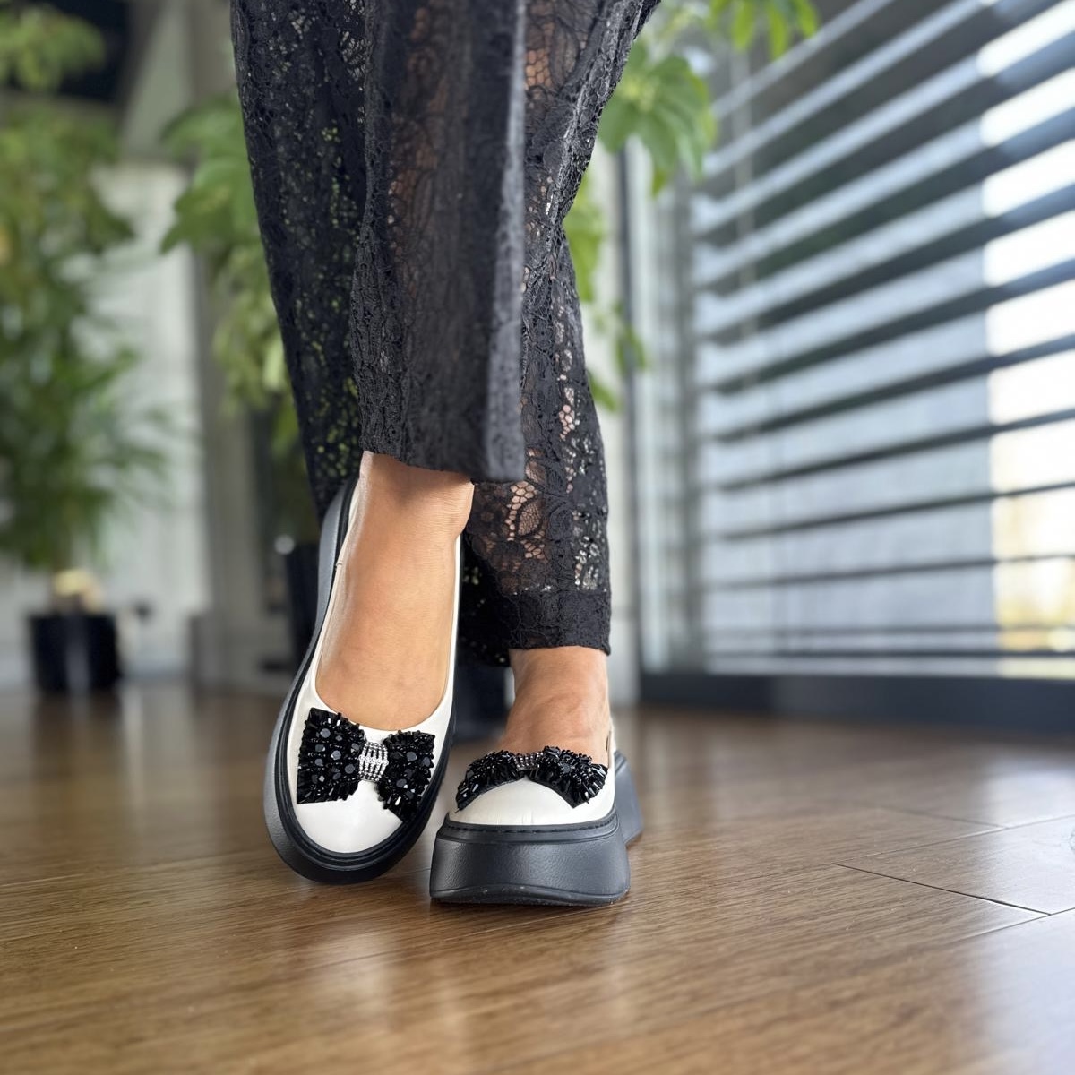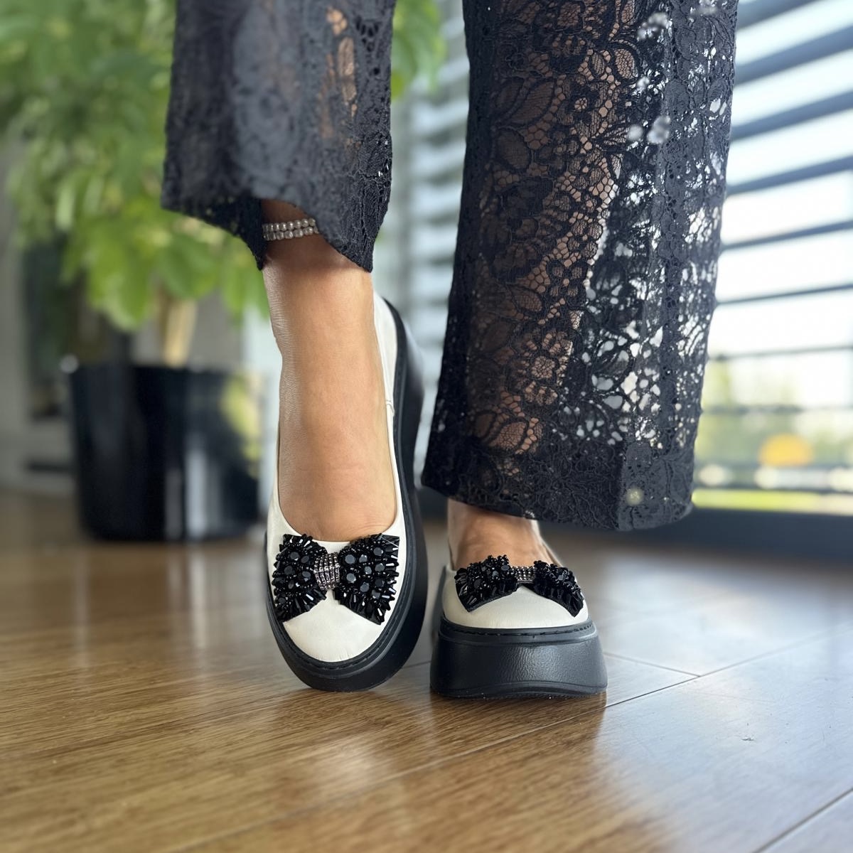 Przepiękny model baleriny Angelique. Klasyczna balerina przyozdobiona przepiękną wykładaną cyrkoniami kokardą. Wzór wykonany jest na bardzo wygodnej podwyższanej podeszwie.