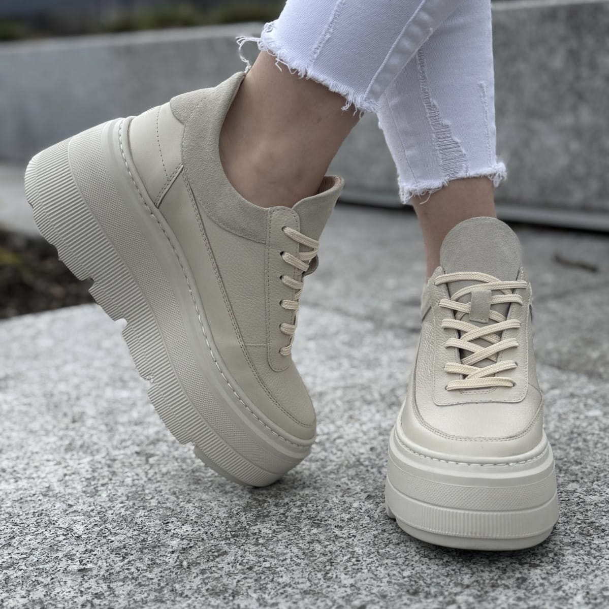 Beżowe Sneakersy Damskie LURSO na platformie model SACILE BEIGE skóra naturalna