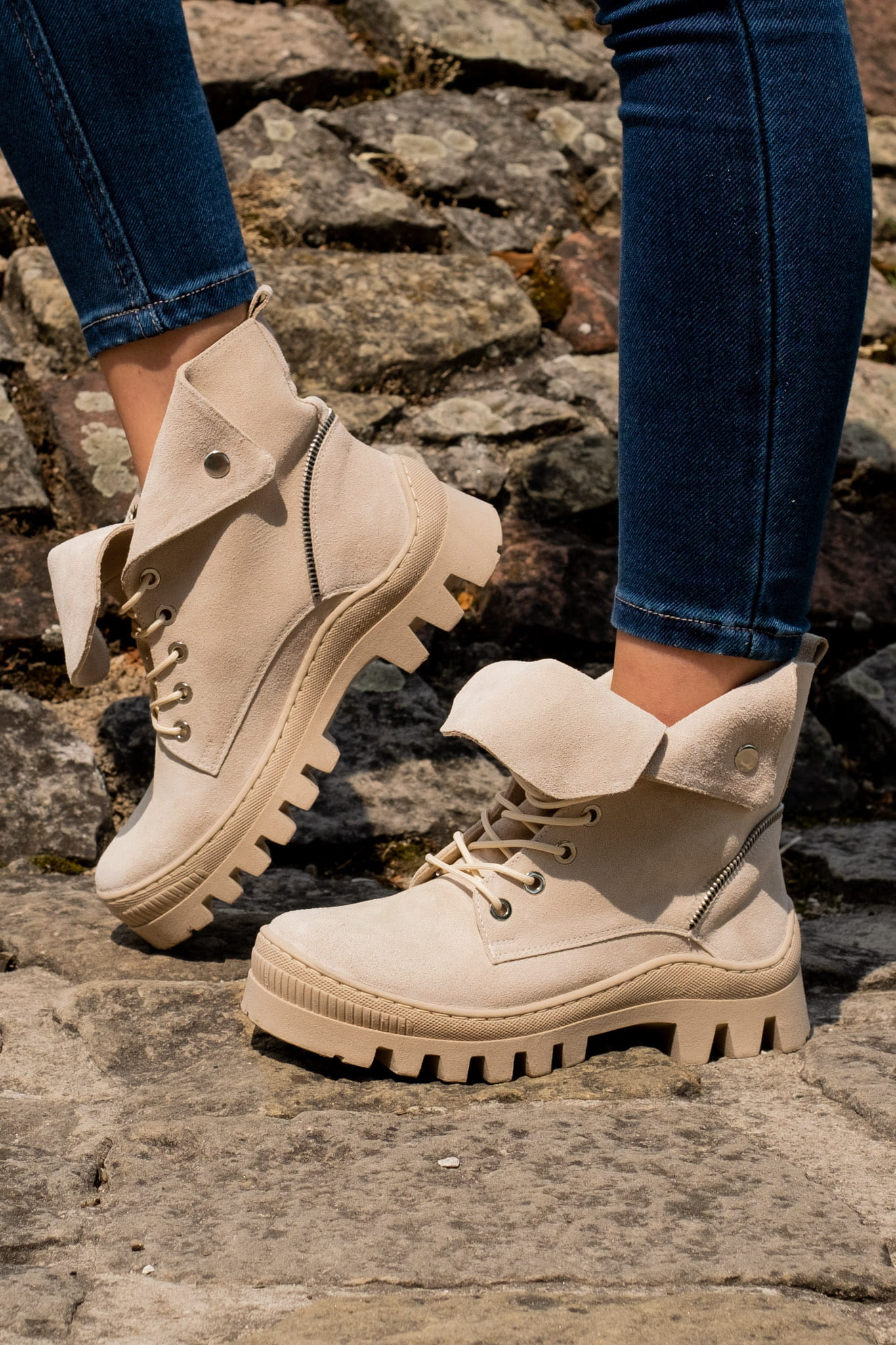 Beżowe Traperki Damskie LURSO z odwijanym kołnierzem model LUCIE BEIGE