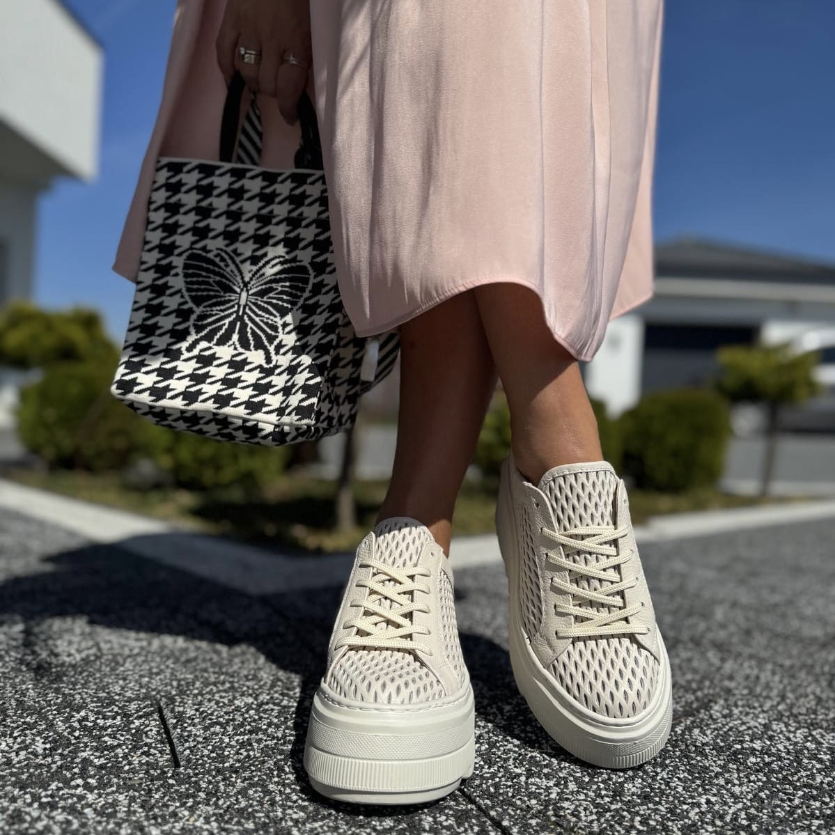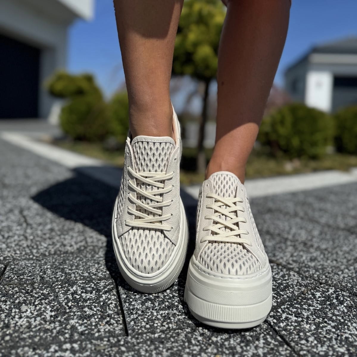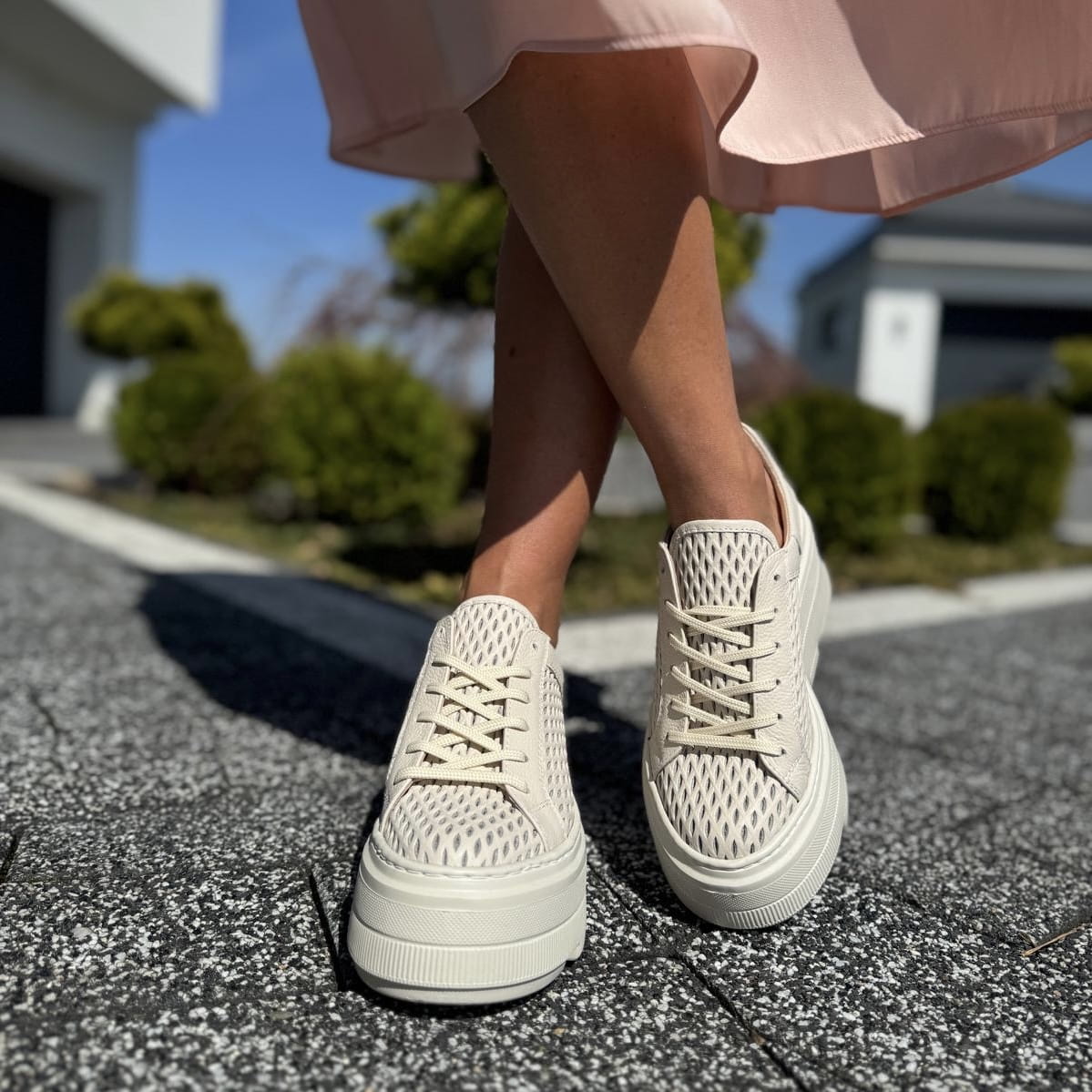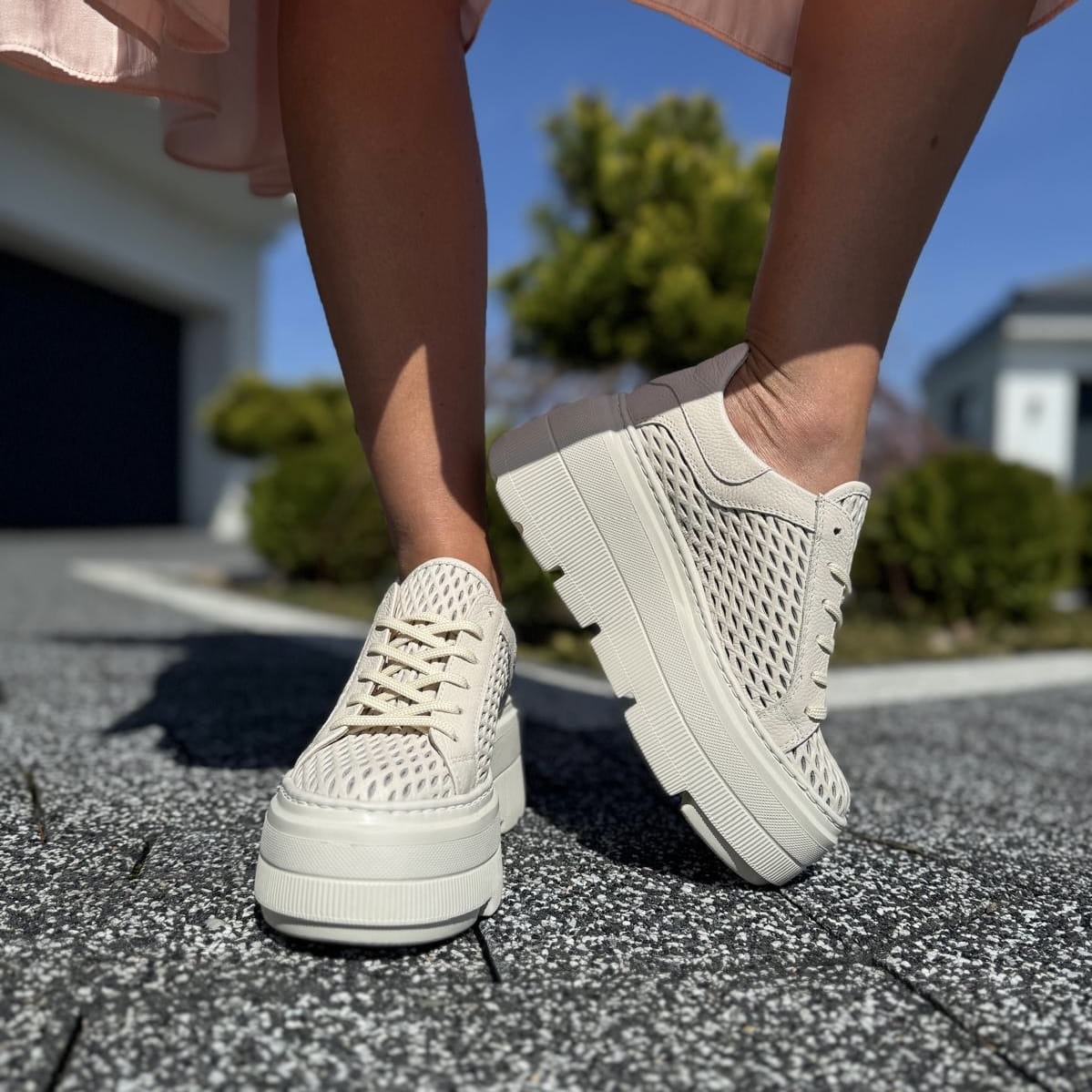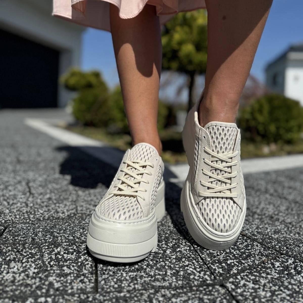 Beżowe ażurowe Sneakersy Damskie na platformie TURATE BEIGE skóra naturalna