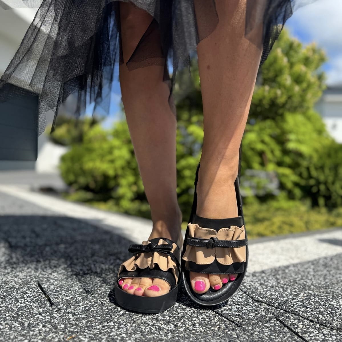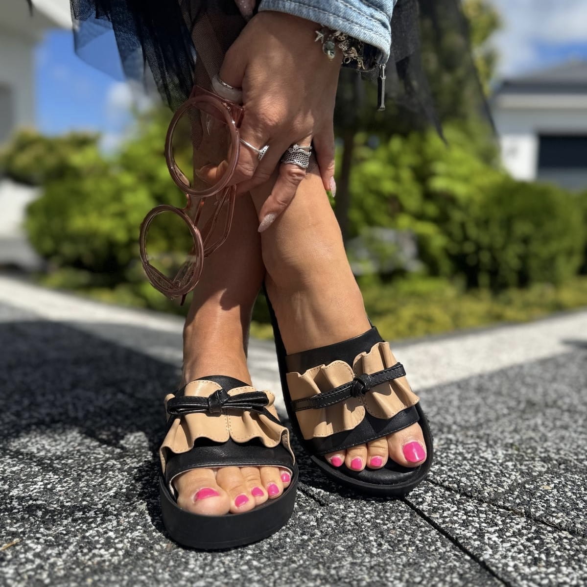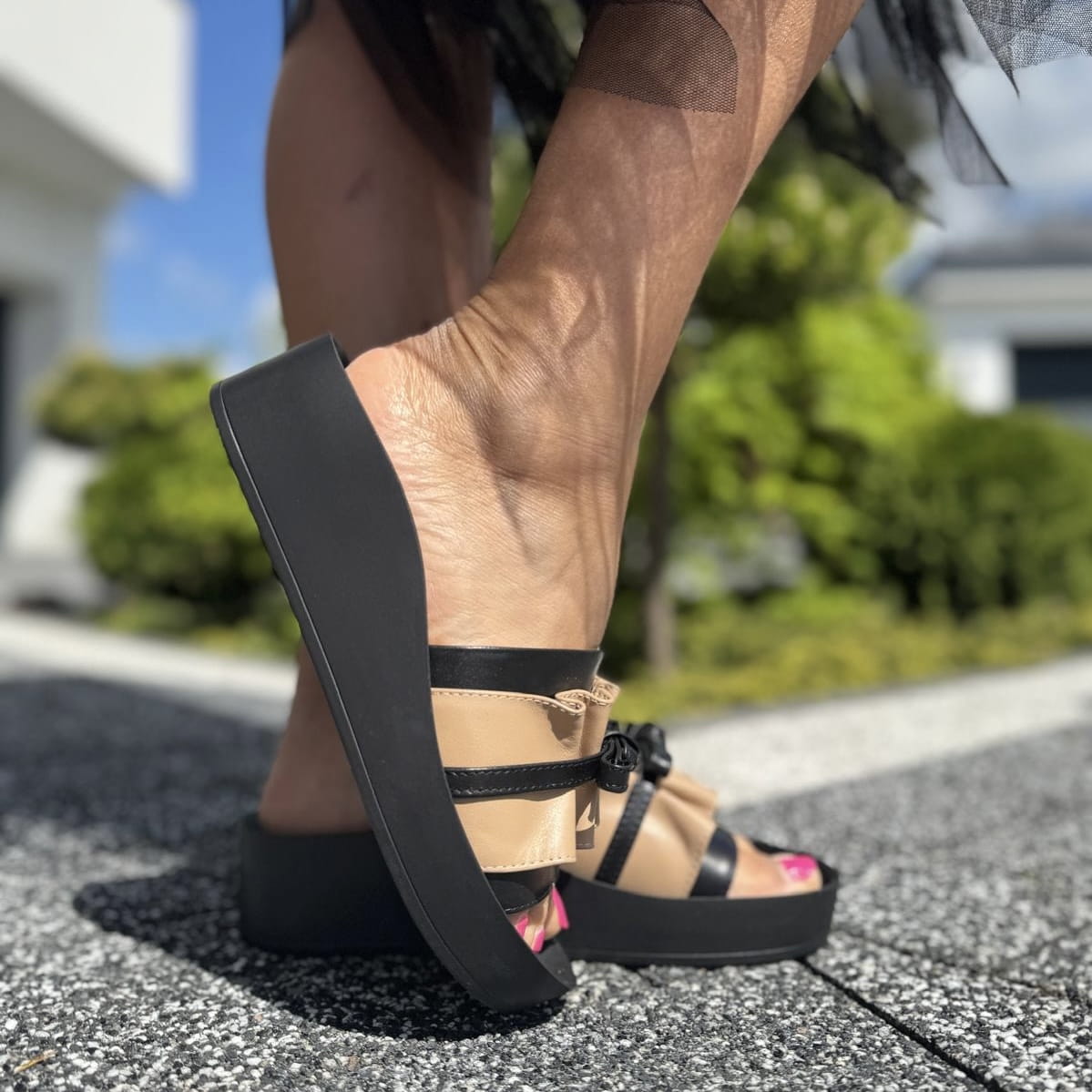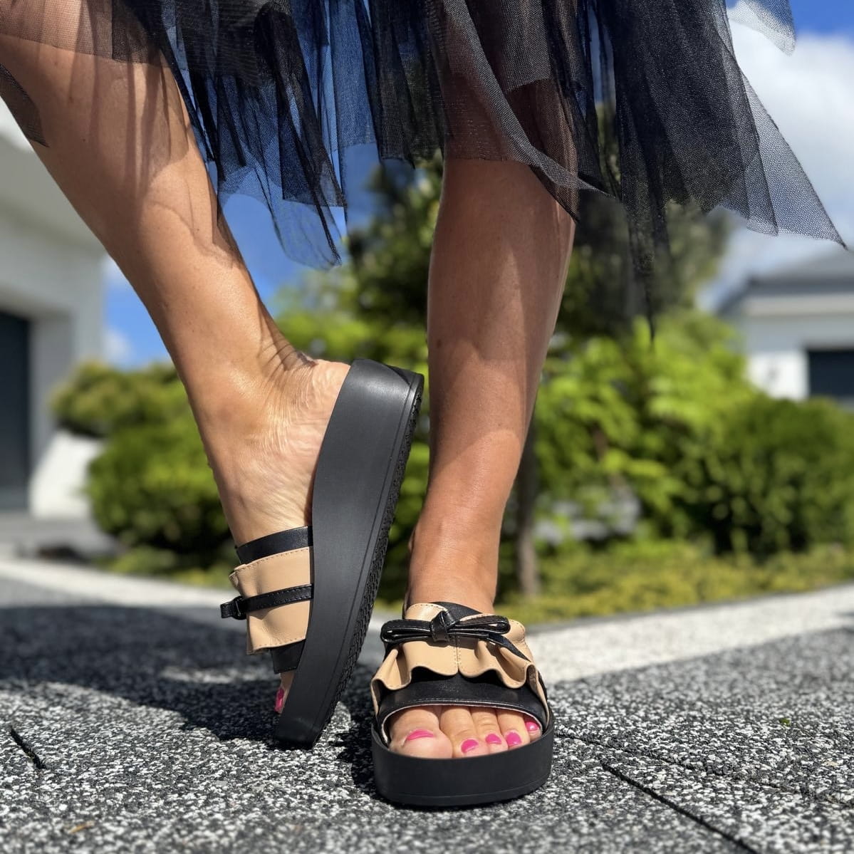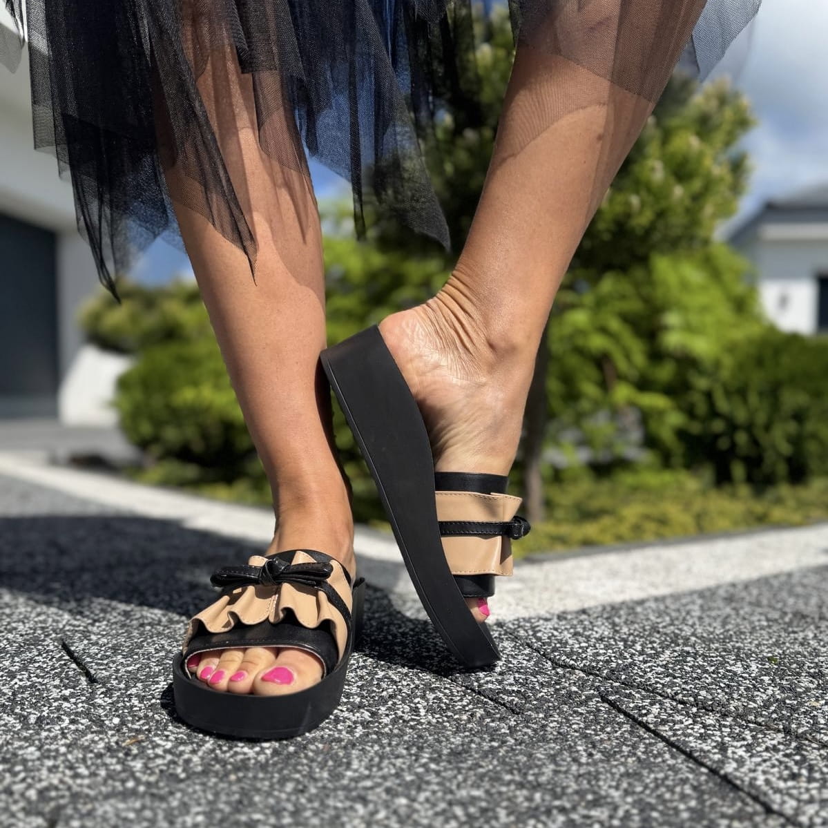 Beżowo-czarne Klapki Damskie z falbanką model SCILLA BEIGE/BLACK skóra naturalna