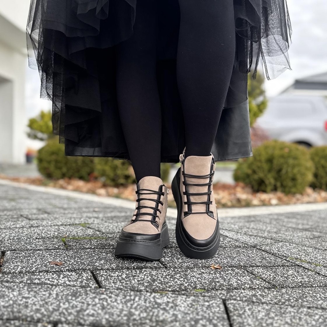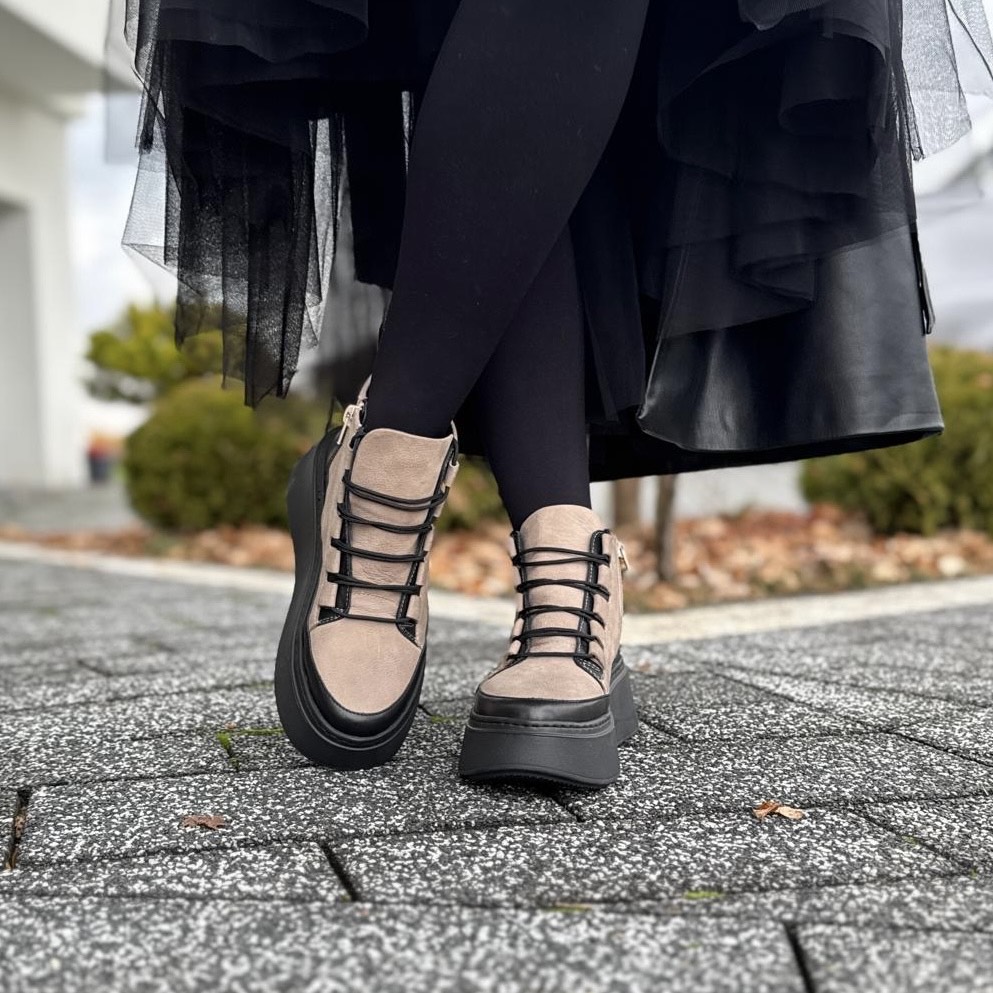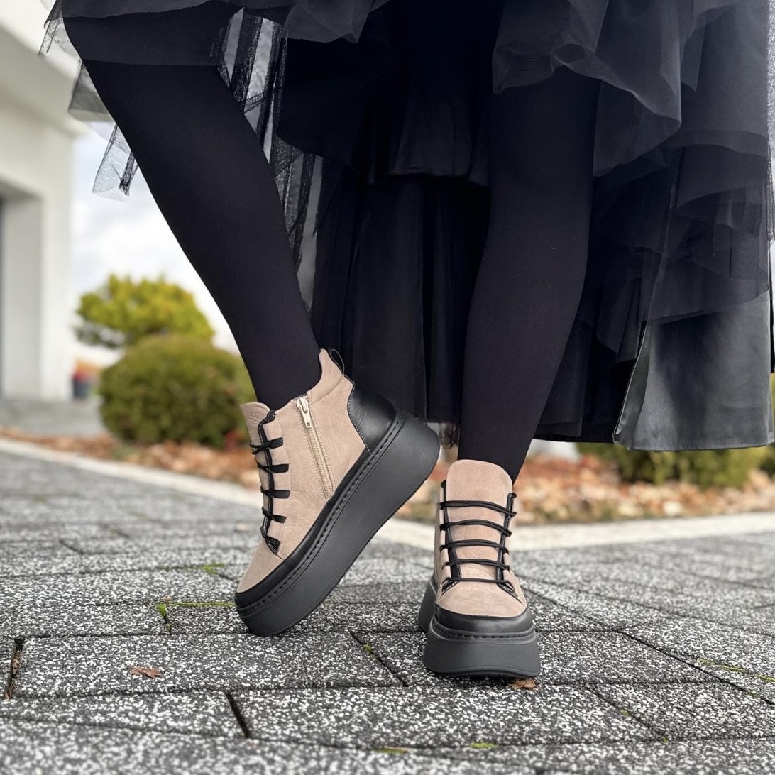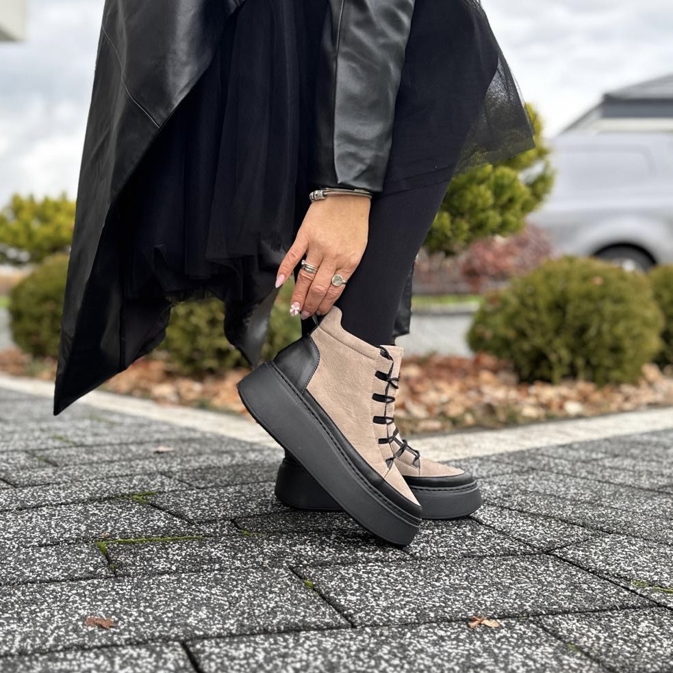 Beżowo-czarne Sneakersy Damskie na wysokiej podeszwie LURSO model CASTEL BLACK BEIGE skóra naturalna
