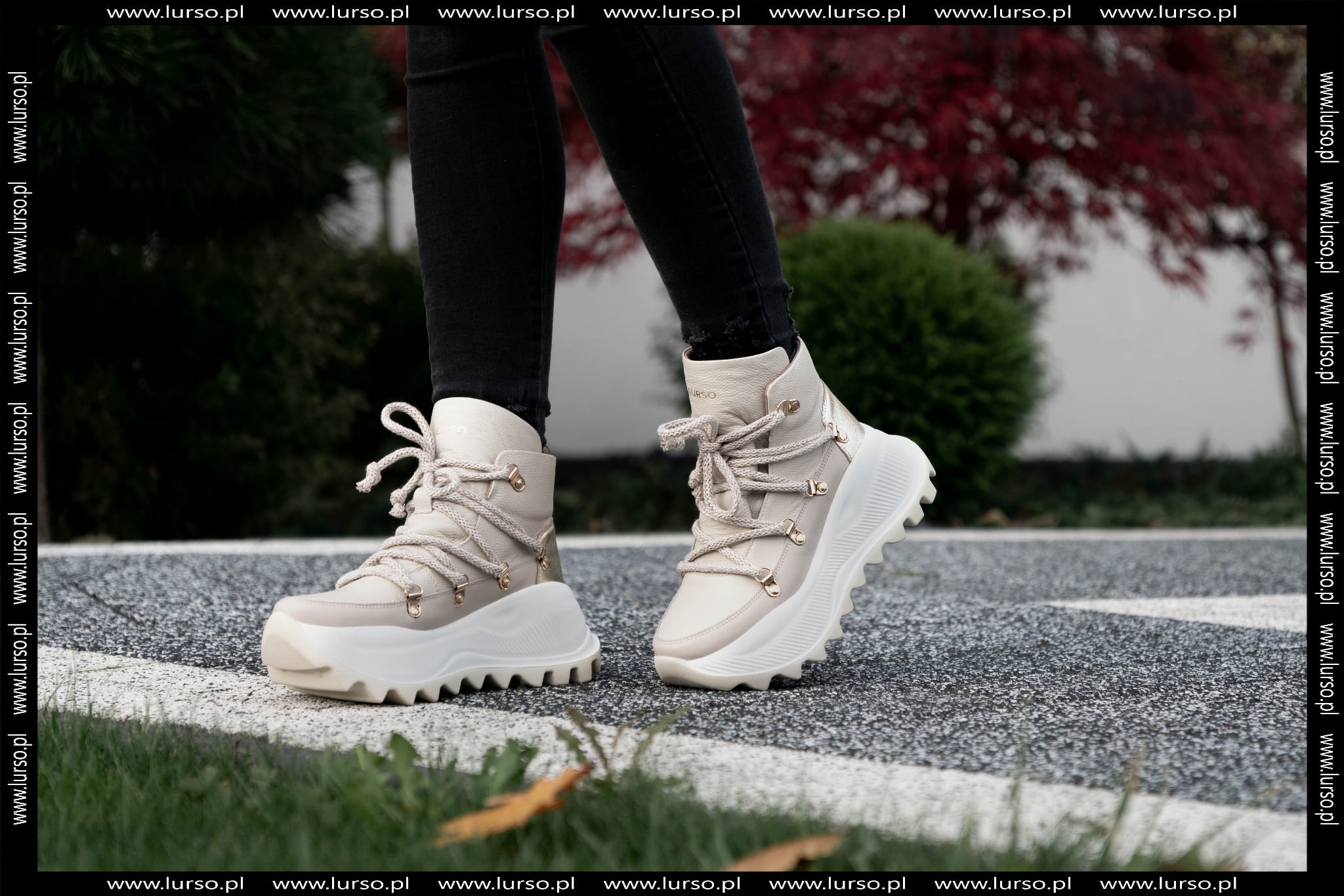 Prezentowany model wyróżnia się pięknym wyglądem. Cholewka do kostki dopasowuje się do nogi. Ozdobne uchwyty na sznurek dodają mu elegancji.Zastosowana pięknie wykonana podwyższana podeszwa dodaje mu uroku.