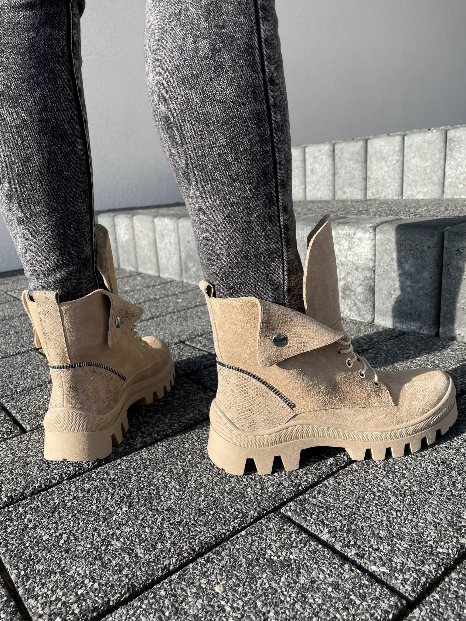 Beżowy Traperek Damski LURSO z odwijanym kołnierzem LUCIE BEIGE