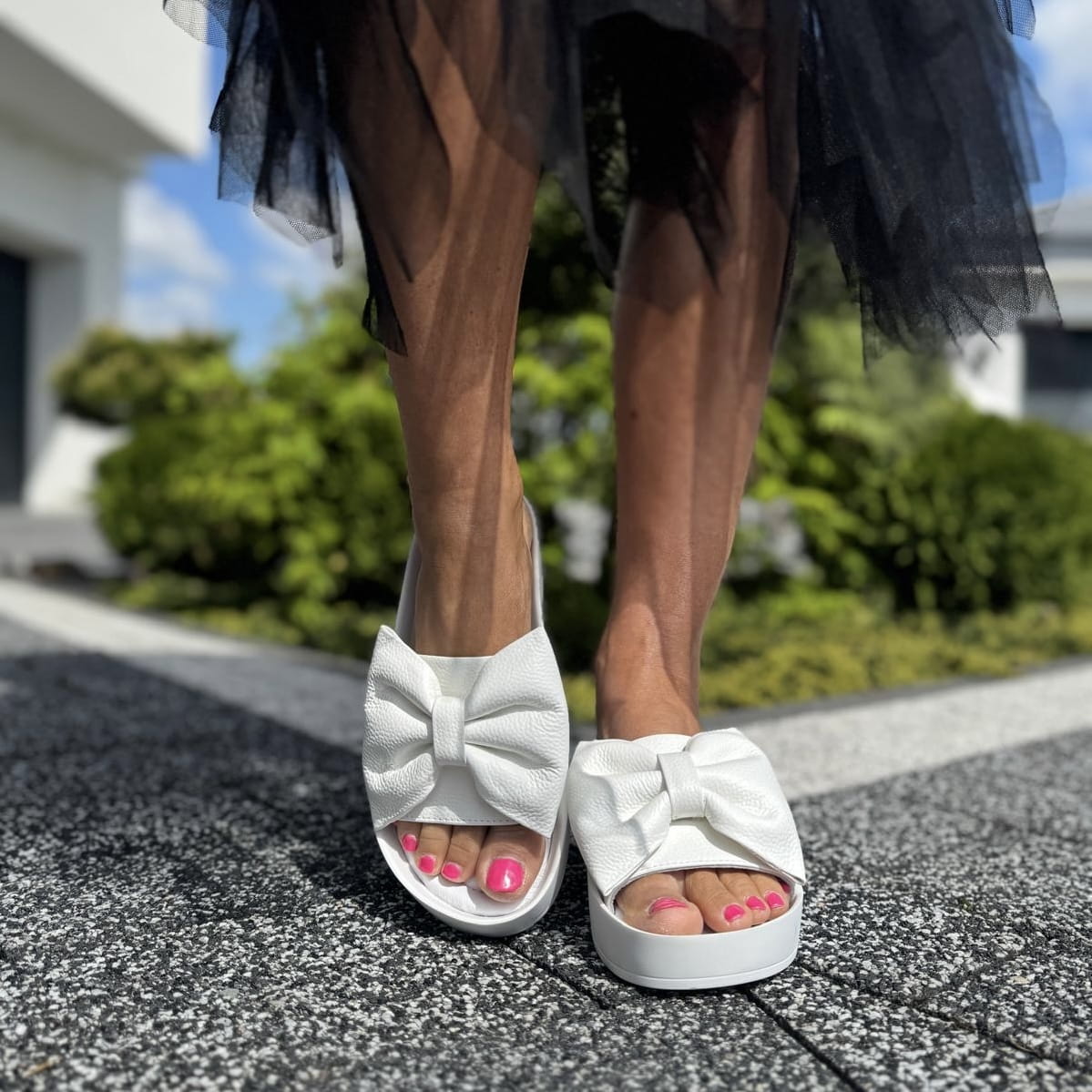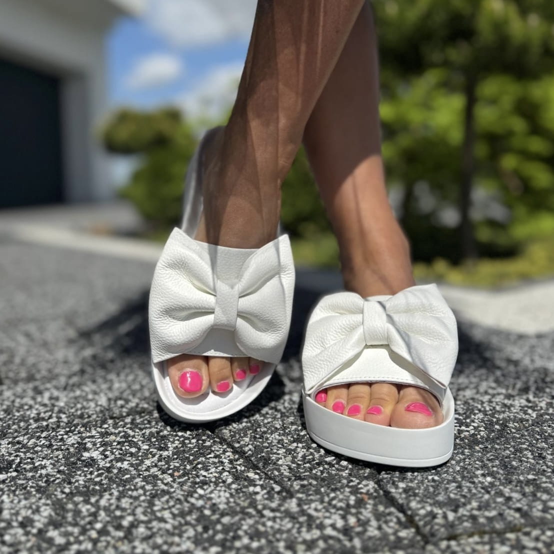 Białe Klapki Damskie z dużą kokardą LURSO model CERRETO WHITE skóra naturalna