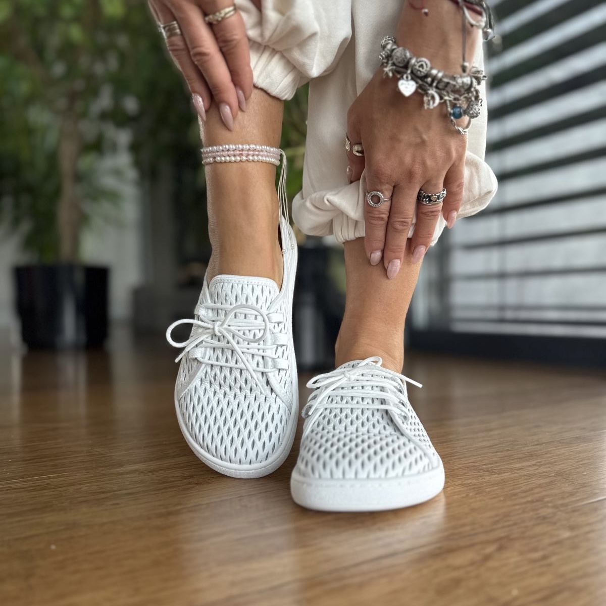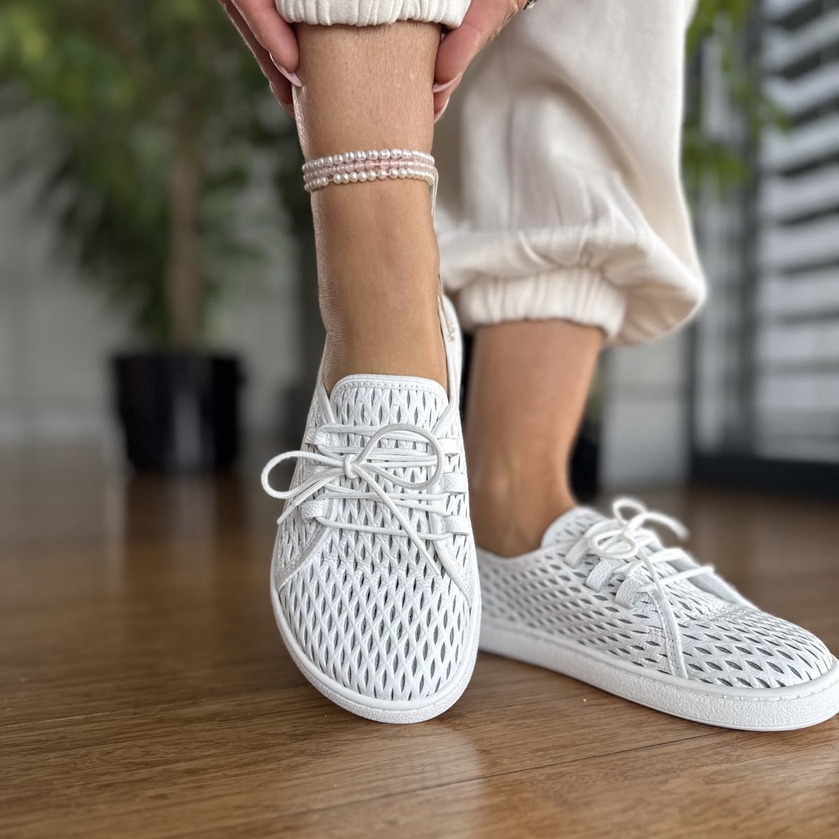 Białe ażurowe Trampki Damskie LURSO typu barefoot model BUSTO WHITE skóra naturalna