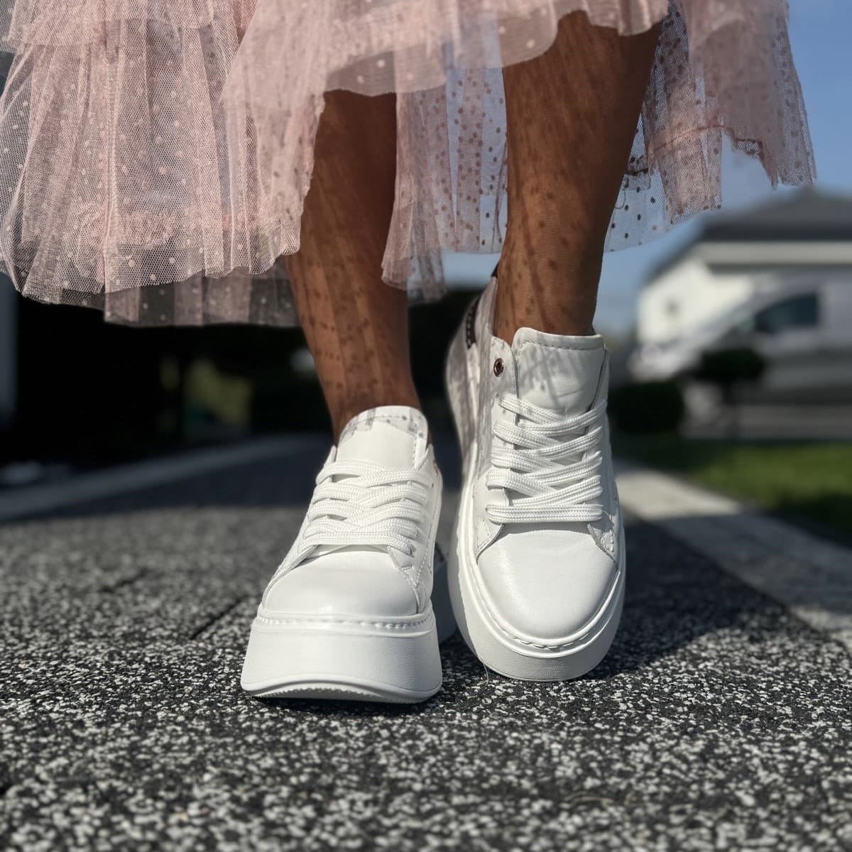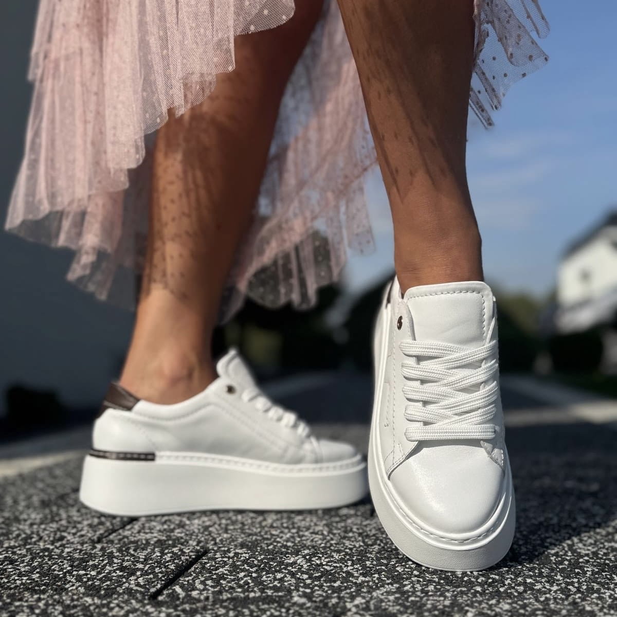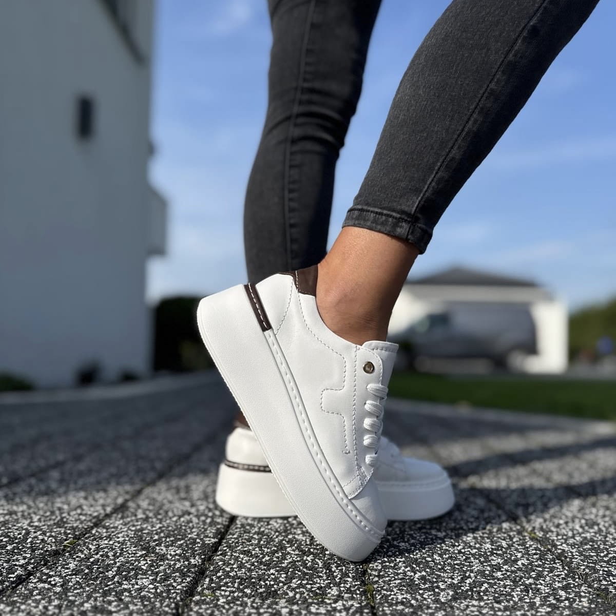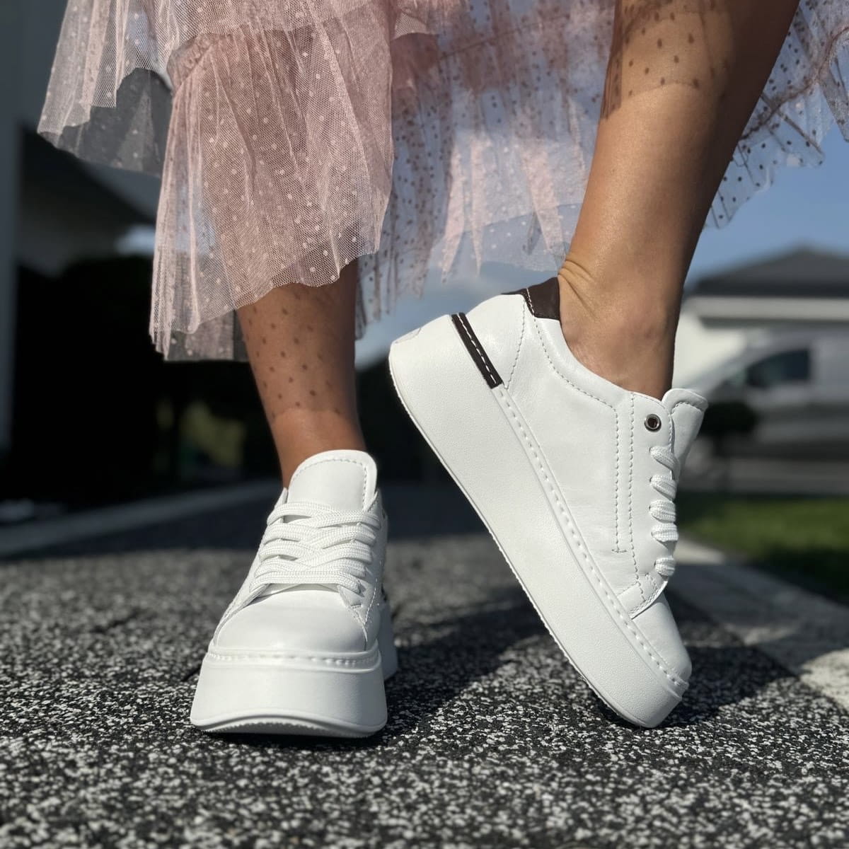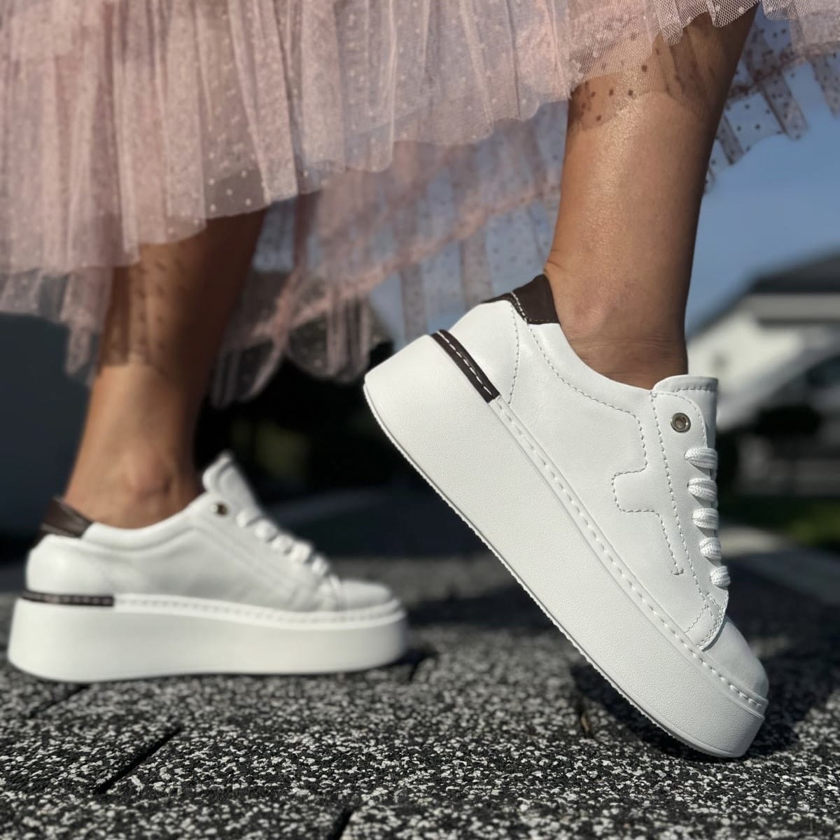 Biało-brązowe Sneakersy Damskie na platformie PIERRE WHITE BROWN skóra naturalna