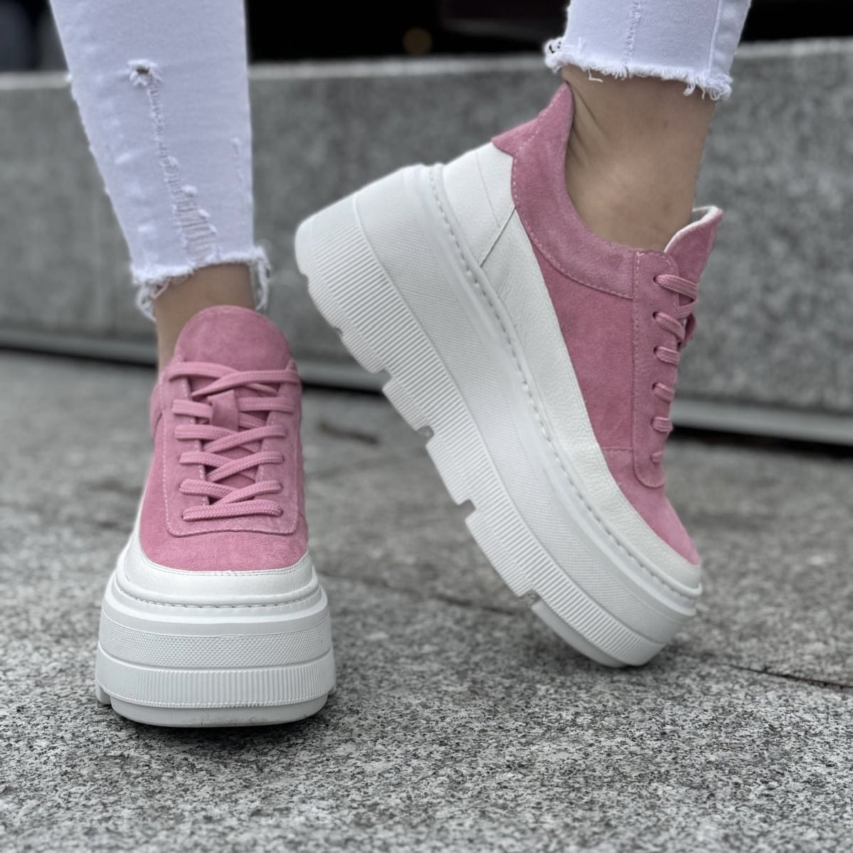 Biało-różowe Sneakersy Damskie LURSO na platformie model SACILE WHITE/PINK skóra naturalna