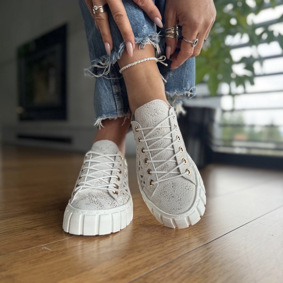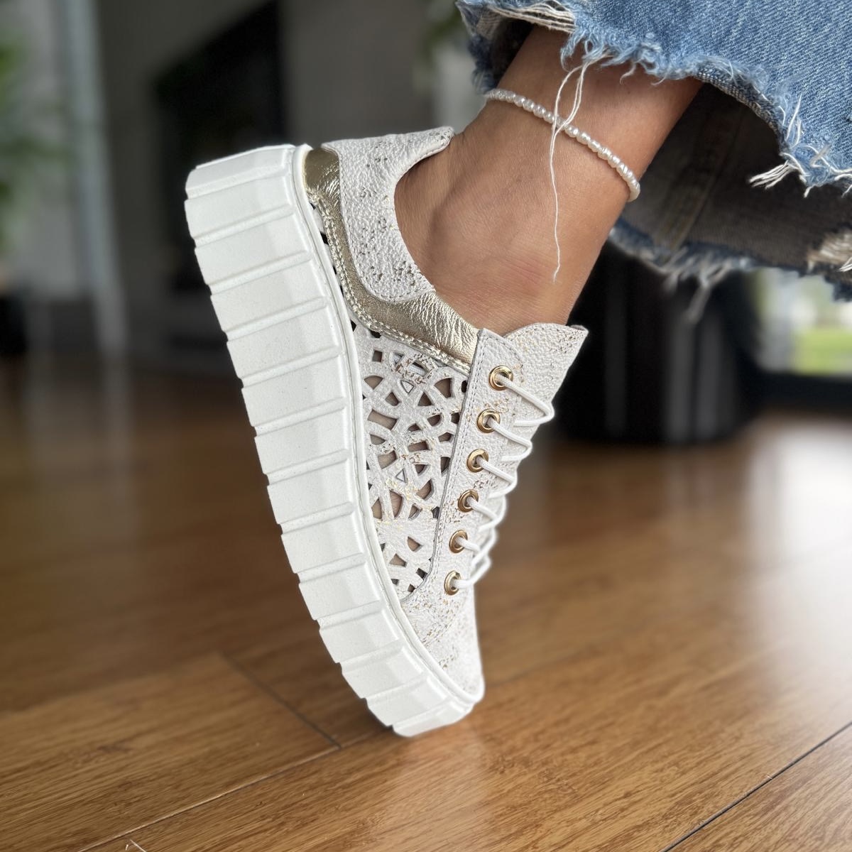Biało-złote ażurowe Sneakers Damskie LURSO model CELIA WHITE GOLD skóra naturalna