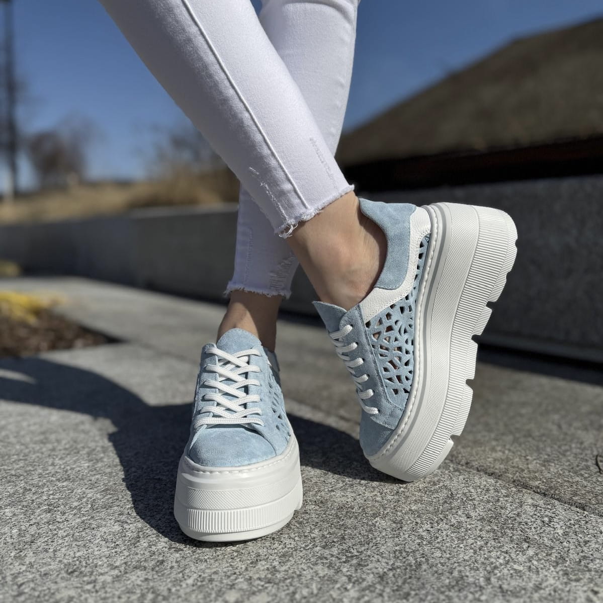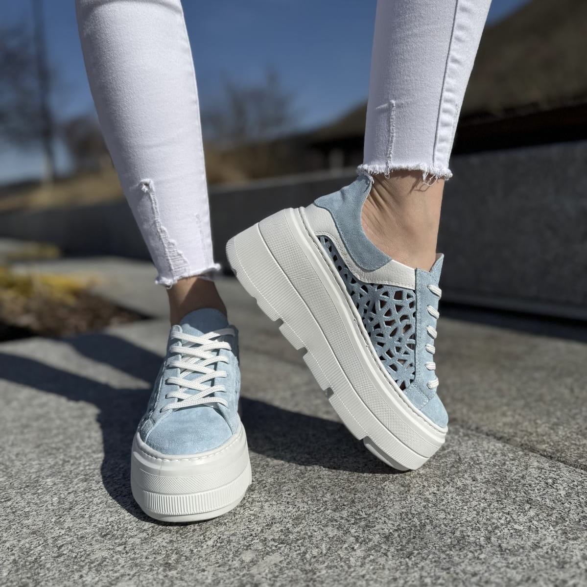 Błękitne ażurowe Sneakersy Damskie LURSO model BAGHERIA BLUE skóra naturalna