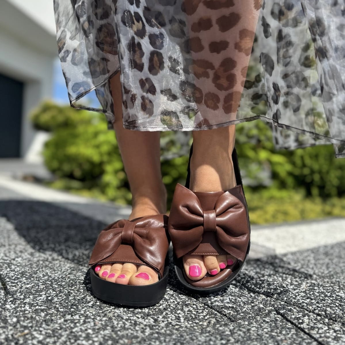 Brązowe Klapki Damskie z dużą kokardą LURSO model CERRETO CHOCOLATE BROWN skóra naturalna