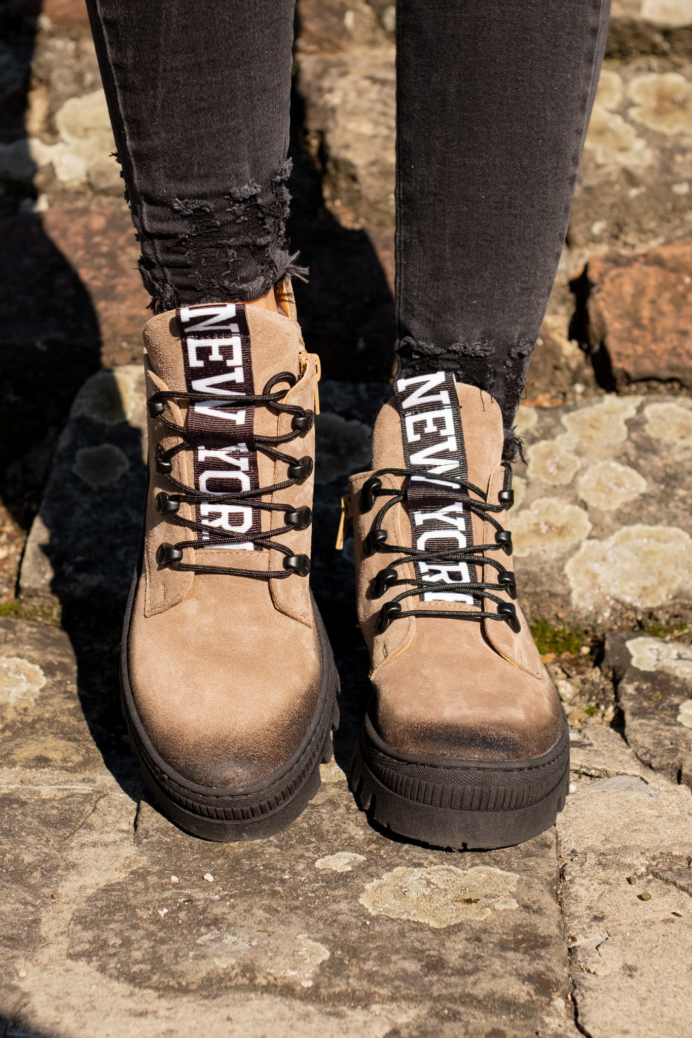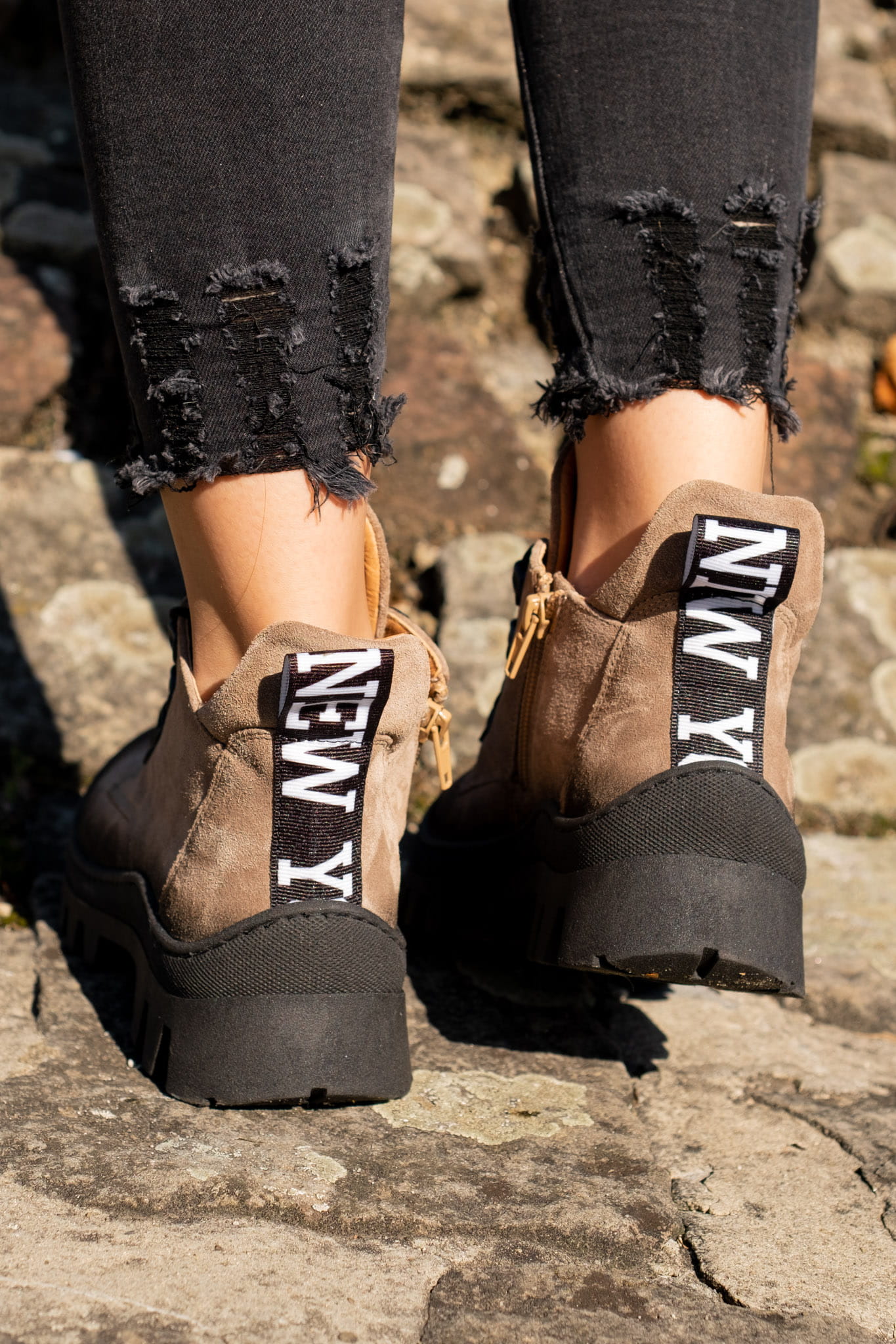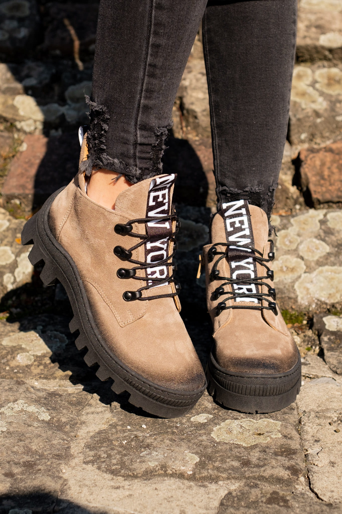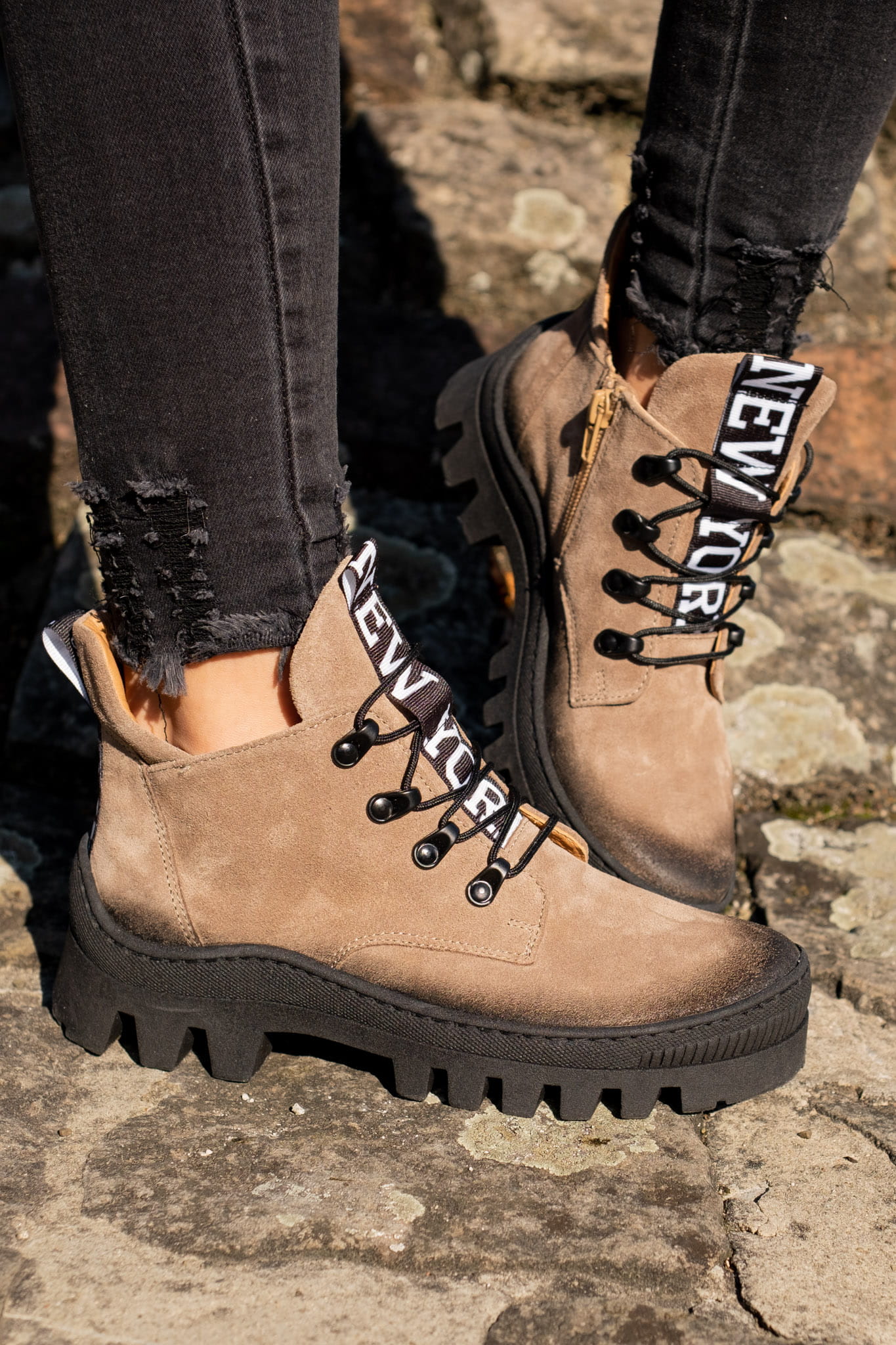 Ciemno-beżowe Traperki Damskie do kostki LURSO z ozdobną taśmą model ROSE TAUPE