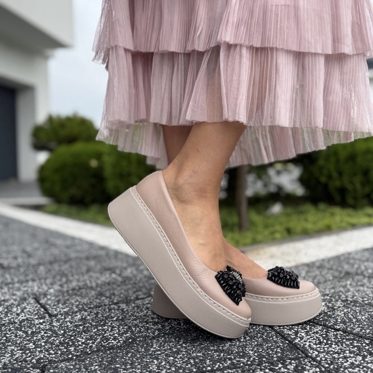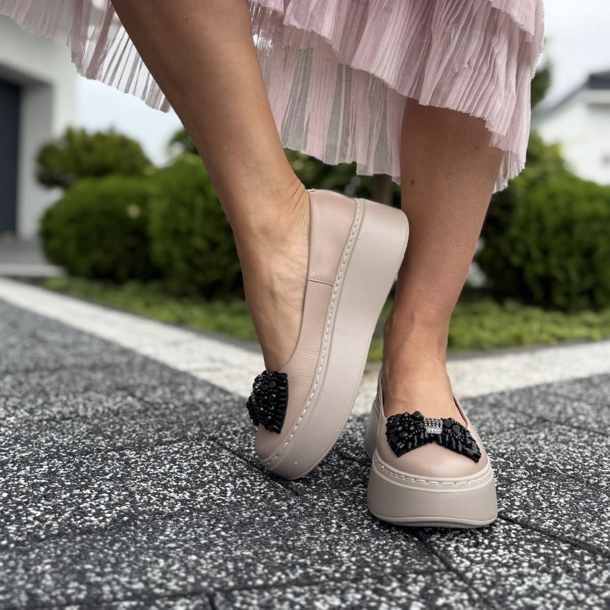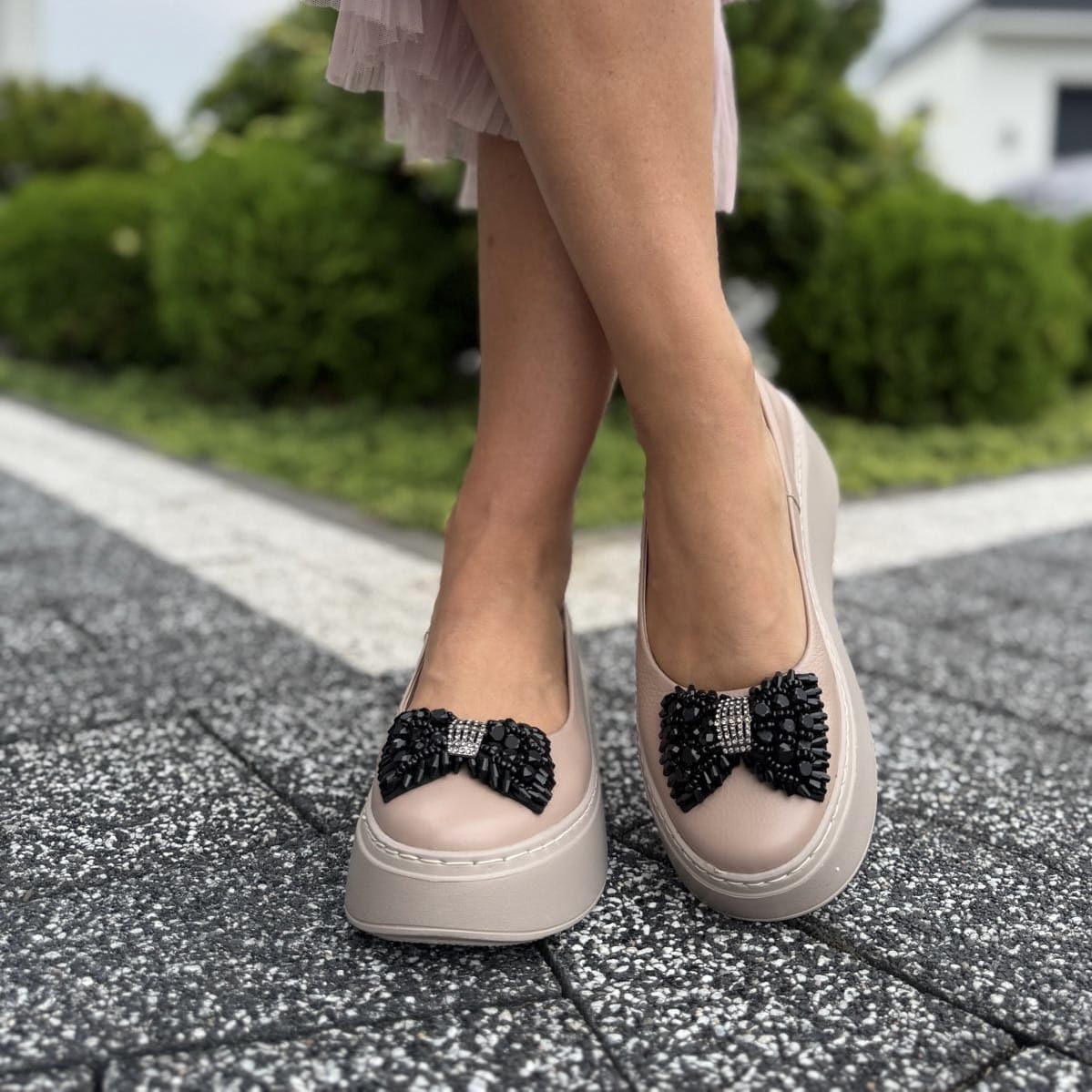 Ciemnobeżowe Baleriny Damskie z ozdobą LURSO model ANGELIQUE TAUPE skóra naturalna