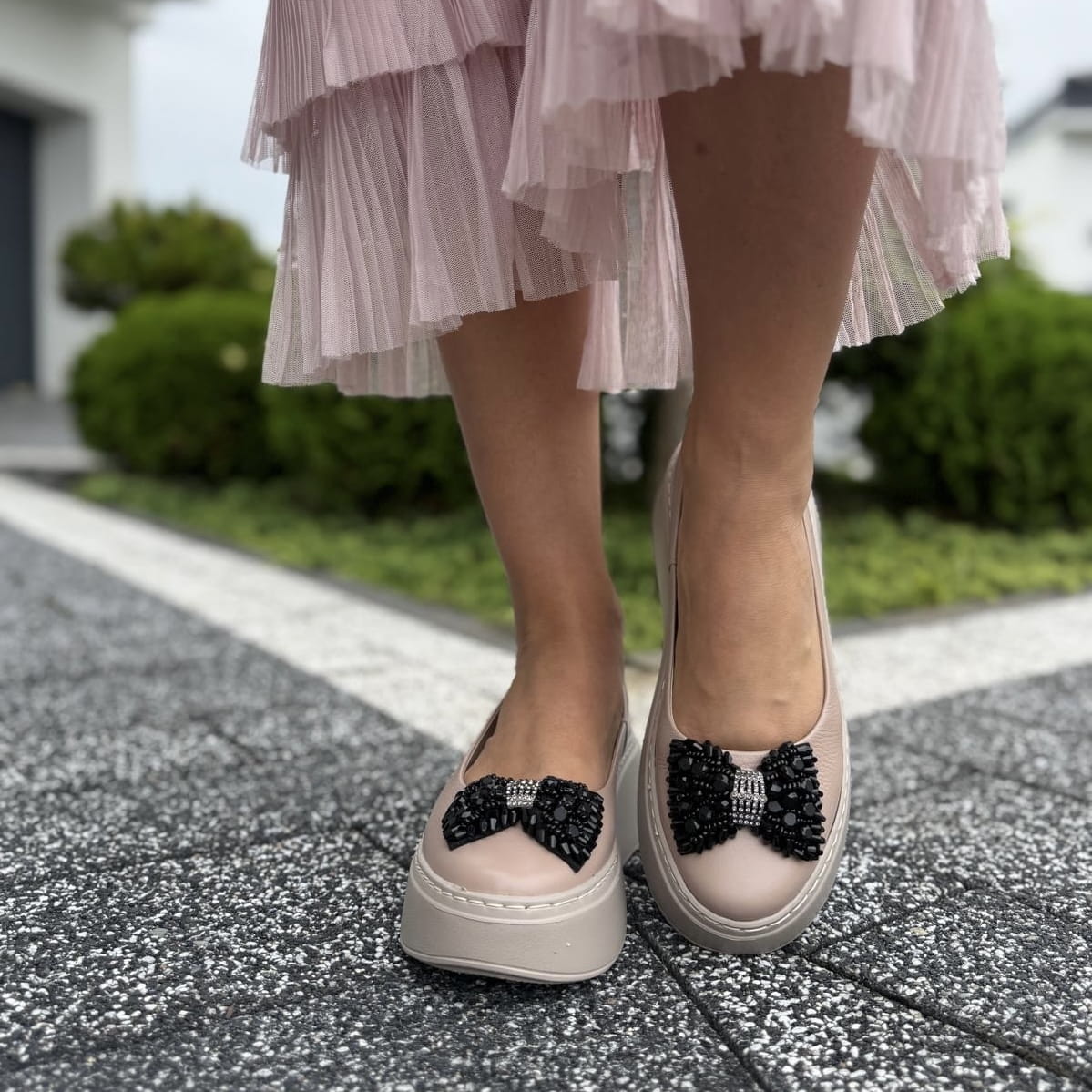 Przepiękny model baleriny Angelique. Klasyczna balerina przyozdobiona przepiękną wykładaną cyrkoniami kokardą. Wzór wykonany jest na bardzo wygodnej podwyższanej podeszwie.