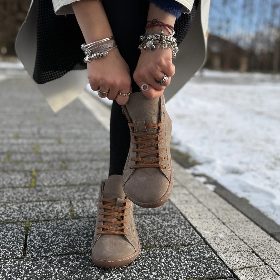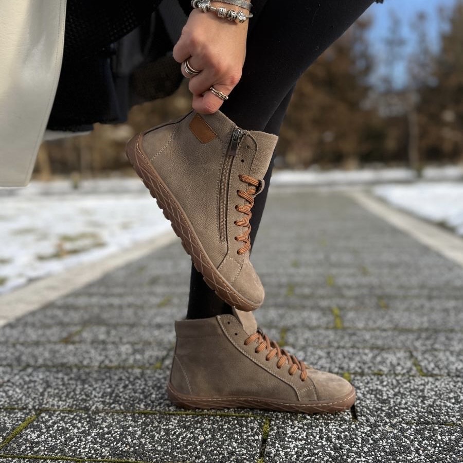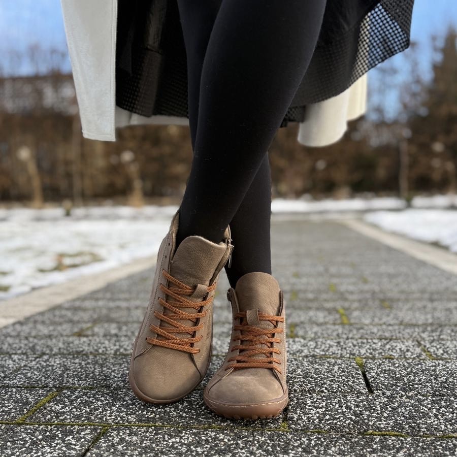 Ciemnobeżowe wyższe ocieplane Trampki Damskie LURSO typu barefoot model ZENO TAUPE skóra naturalna