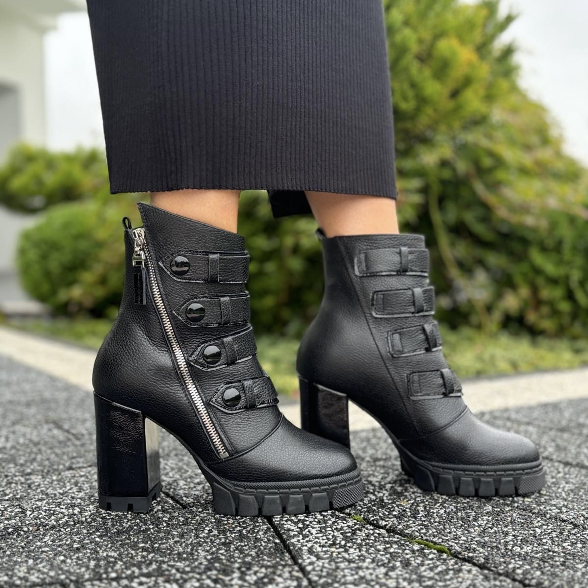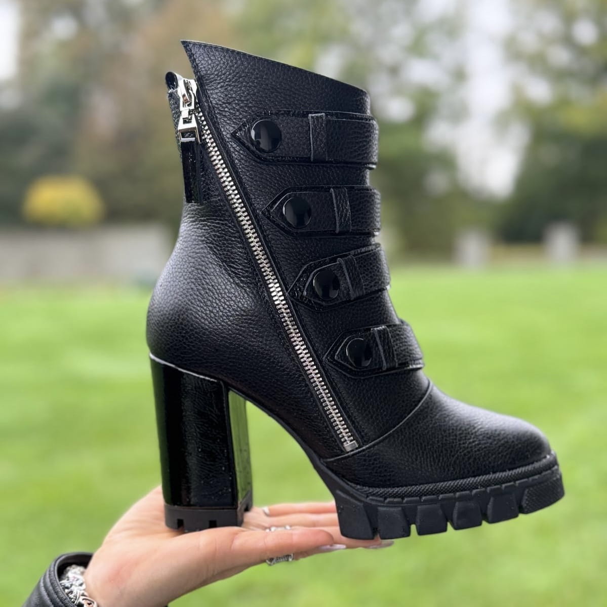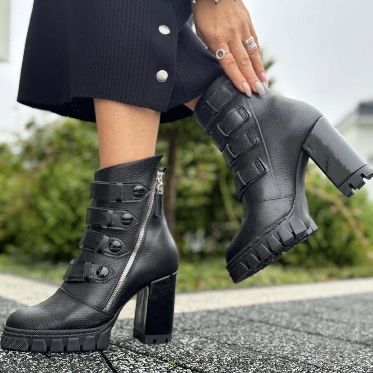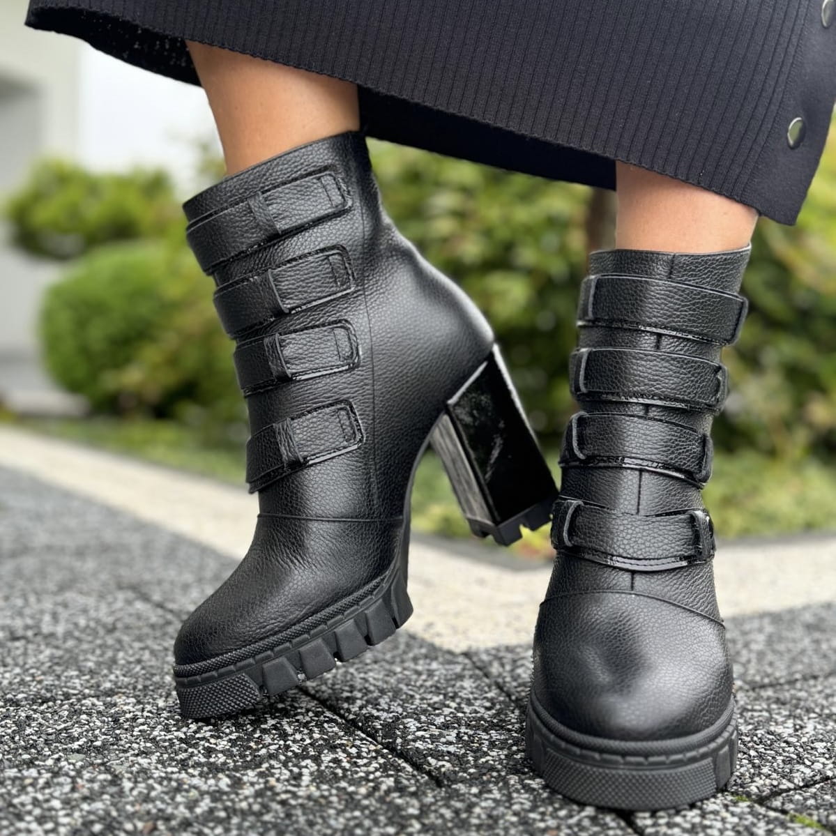 ANDRETTA to piękny model botków. Buty wykonane zostały na nietuzinkowej traperowej podeszwie i oblekanym skórą obcasie. Ozdobą modelu jest metalowy funkcjonalny zamek oraz przepiękne paski na nappy. Buty wyglądają zjawiskowo.