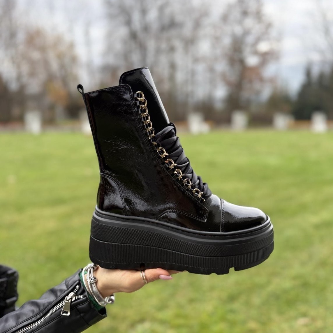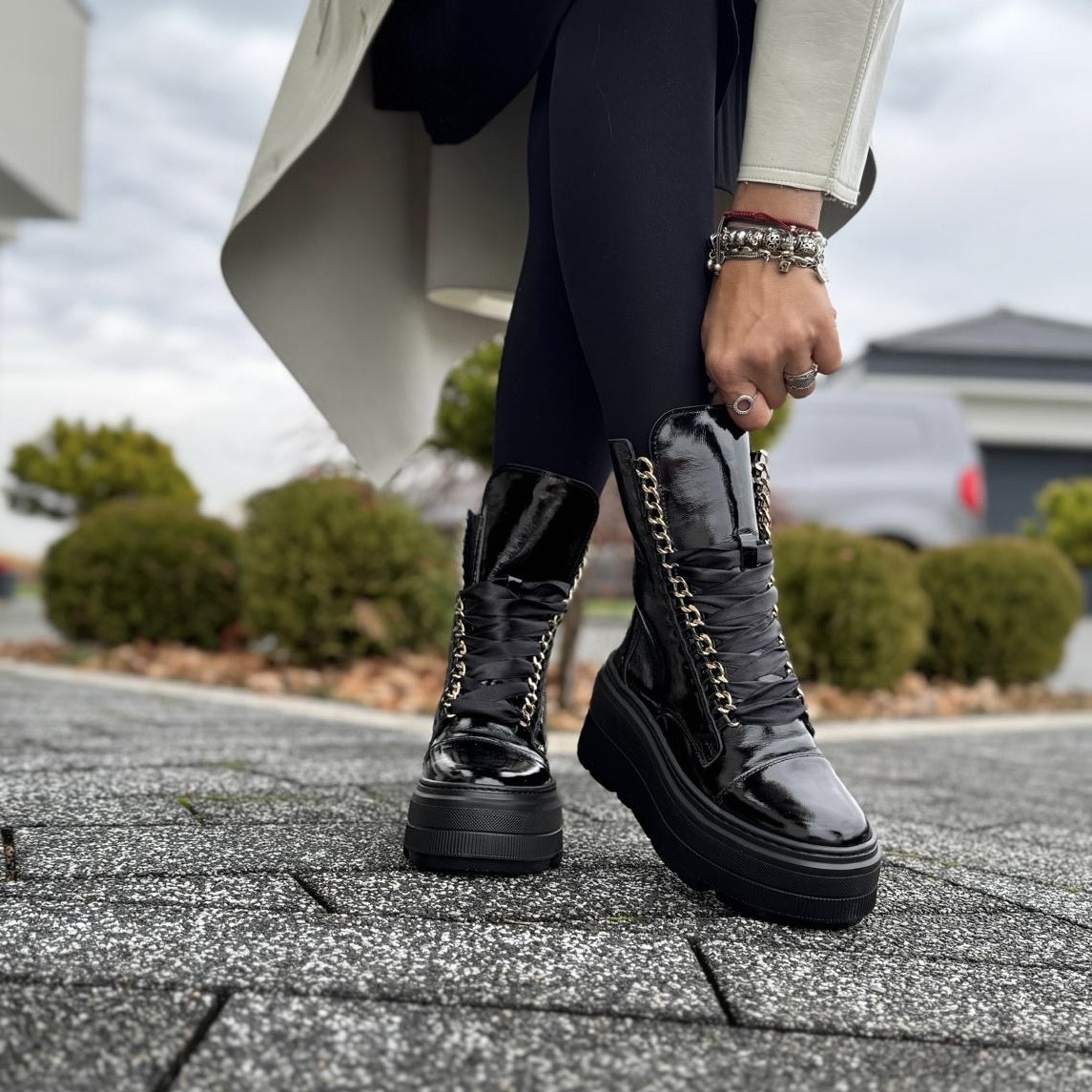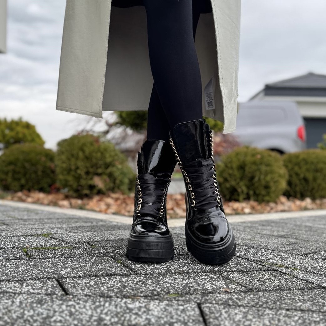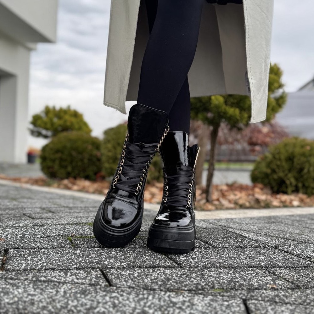 Model Reno to bardzo piękne ocieplane botki. Ciekawym akcentem jest zastosowany łańcuch zamiast oczek. But został zasznurowany atłasową sznurówką. Buty wykonano na podwyższonej podeszwie, która mimo swojego wyglądu jest bardzo wygodna i lekka. Buty będą cudownym podkreśleniem nie tylko eleganckich stylizacji.