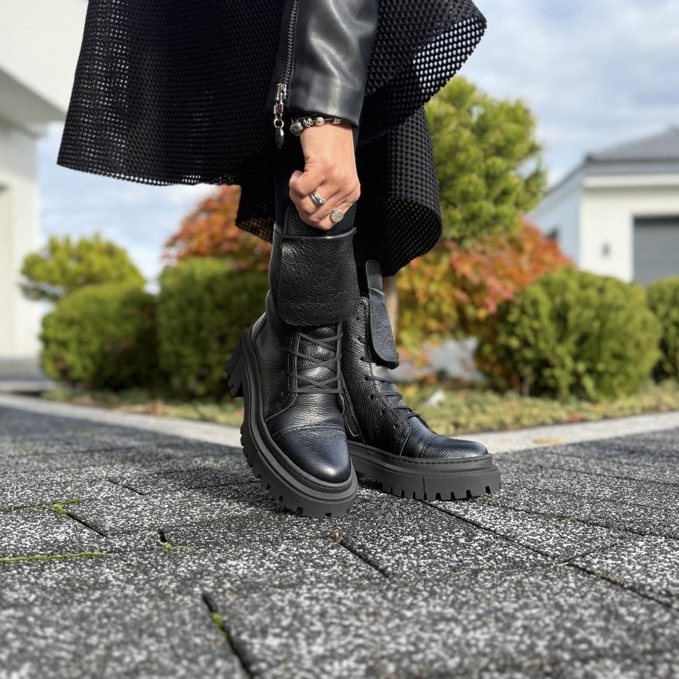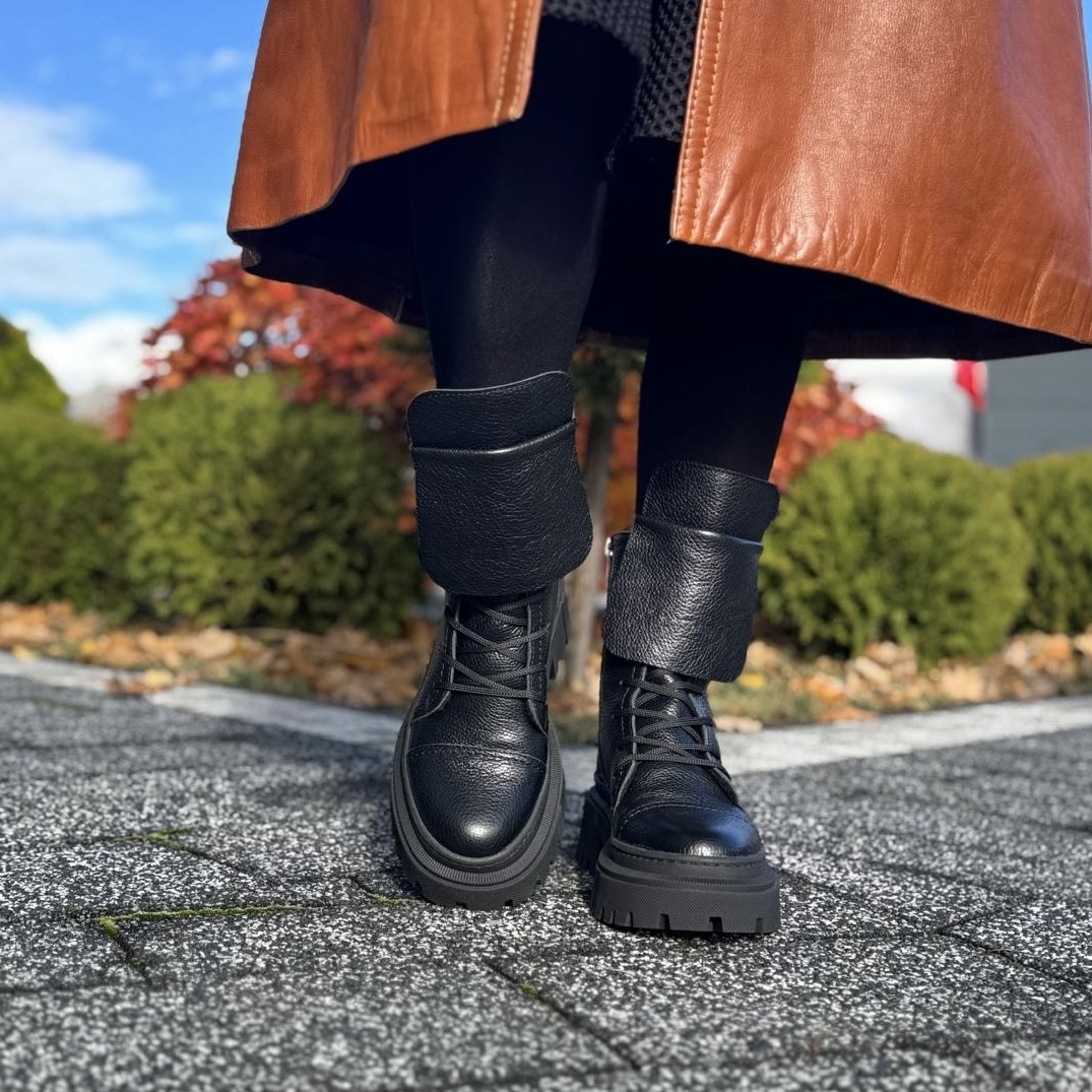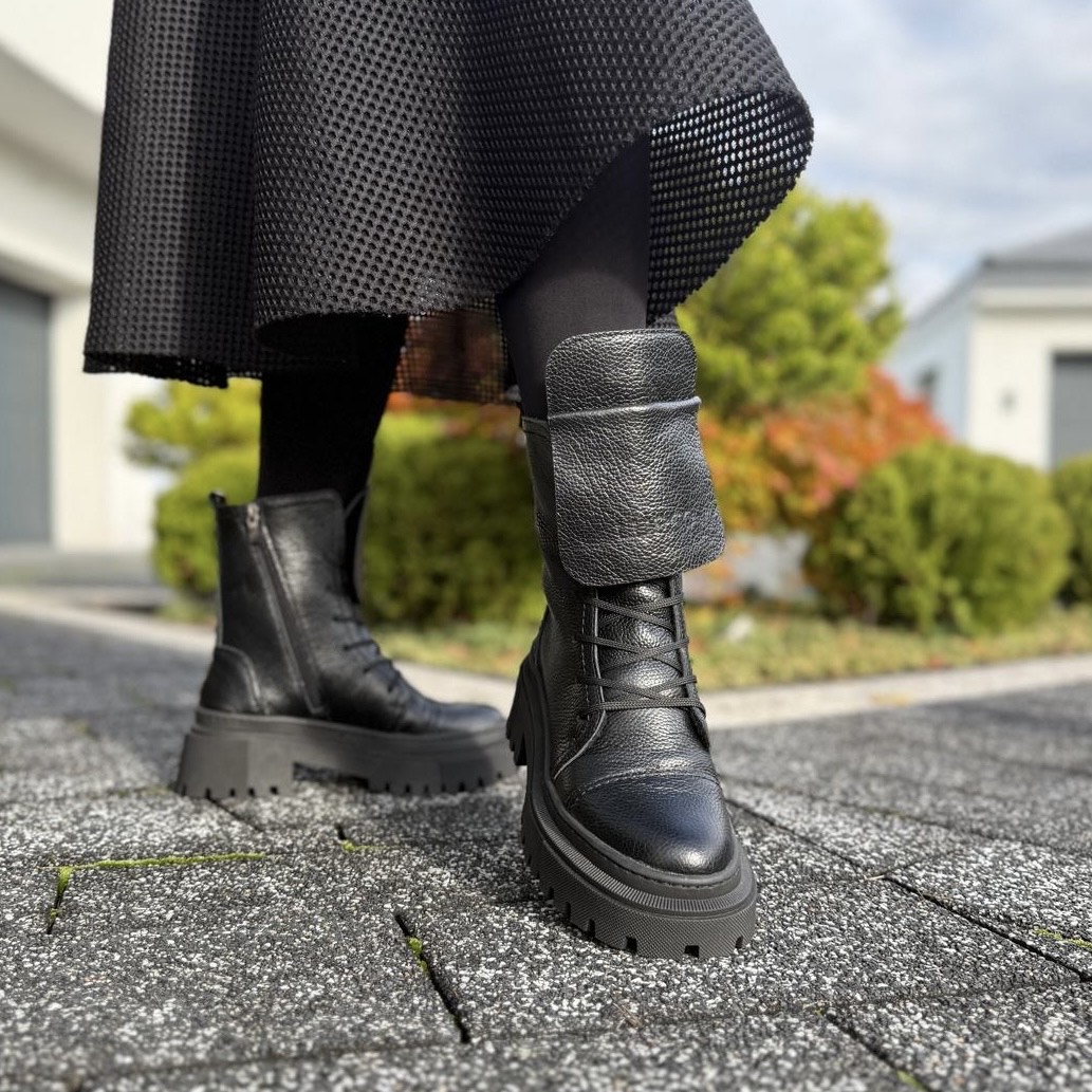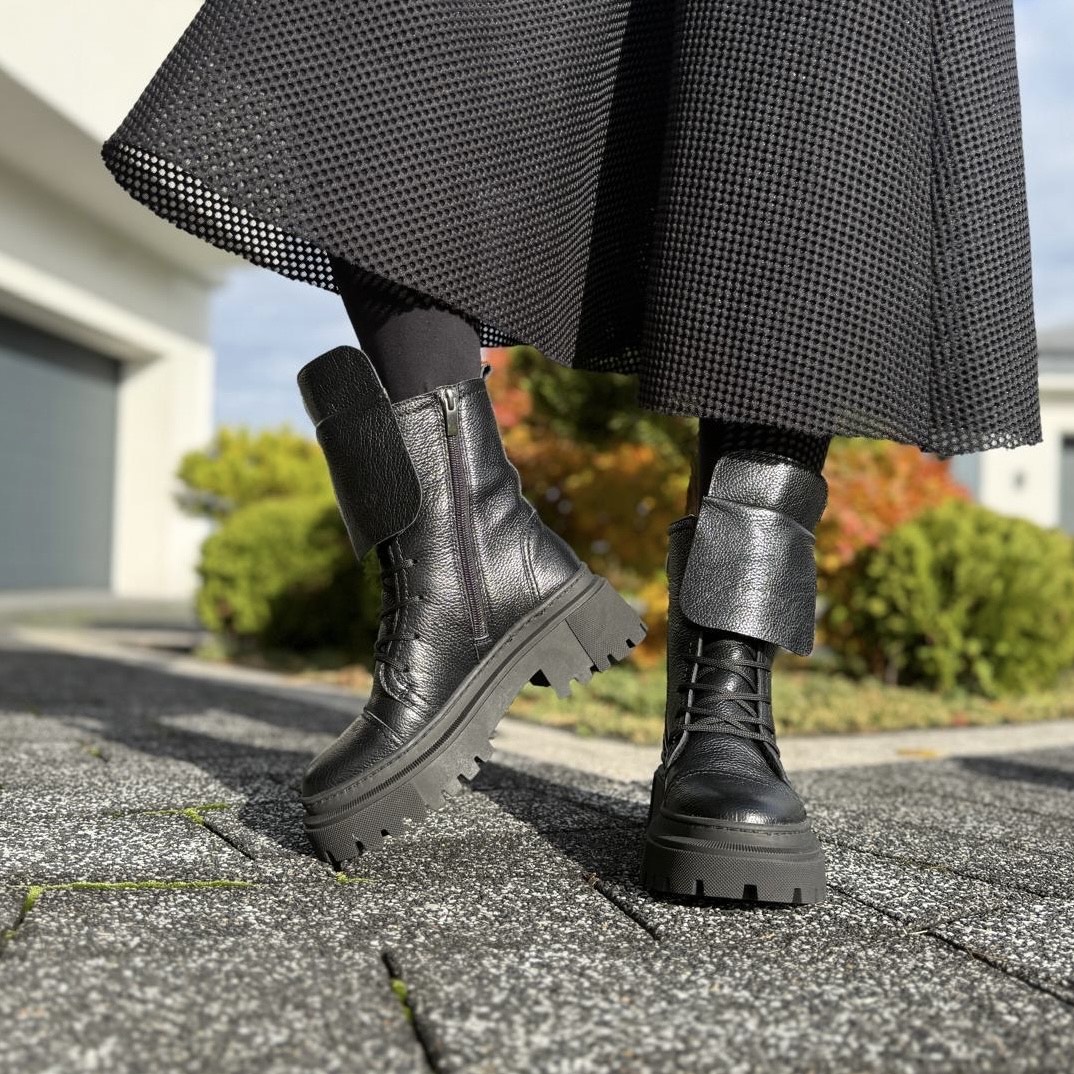 Model Angele to piękne botki damskie. Botki posiadają dwa rodzaje zapinania - zamek zapewniający łatwe zakładanie oraz sznurowadła ułatwiające dopasowanie do tęgości stopy. Ciekawą ozdobą jest dodatkowy wywinięty język, który dodaje temu modelowi wyrazistości. Buty wykonano na bardzo modnej podeszwie, która mimo masywnego wyglądu jest bardzo wygodna i lekka. Model taki na pewno będzie pięknym uzupełnieniem jesiennego lub zimowego outfitu.