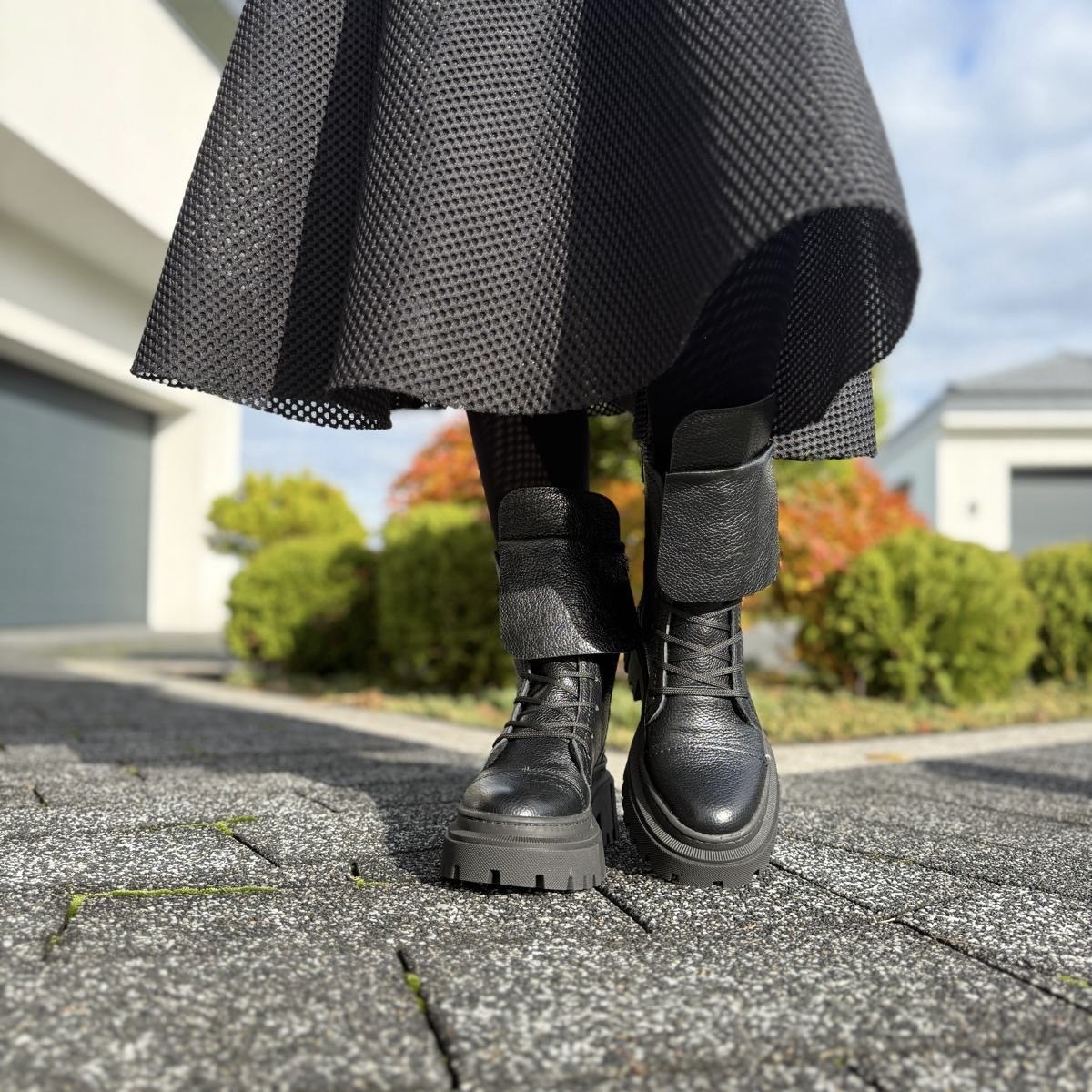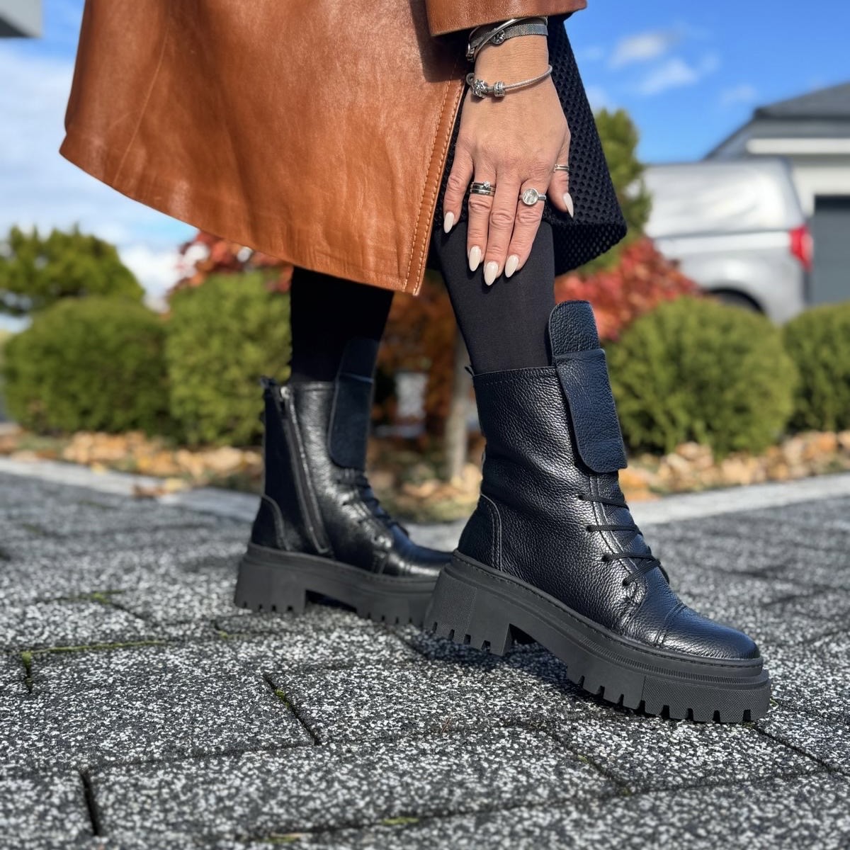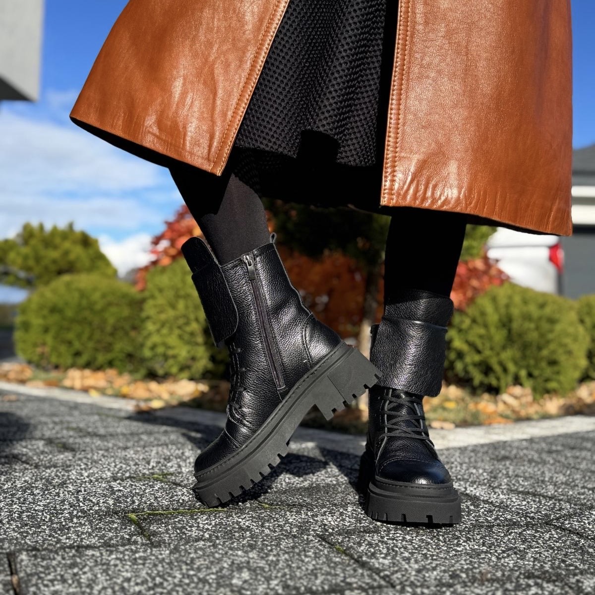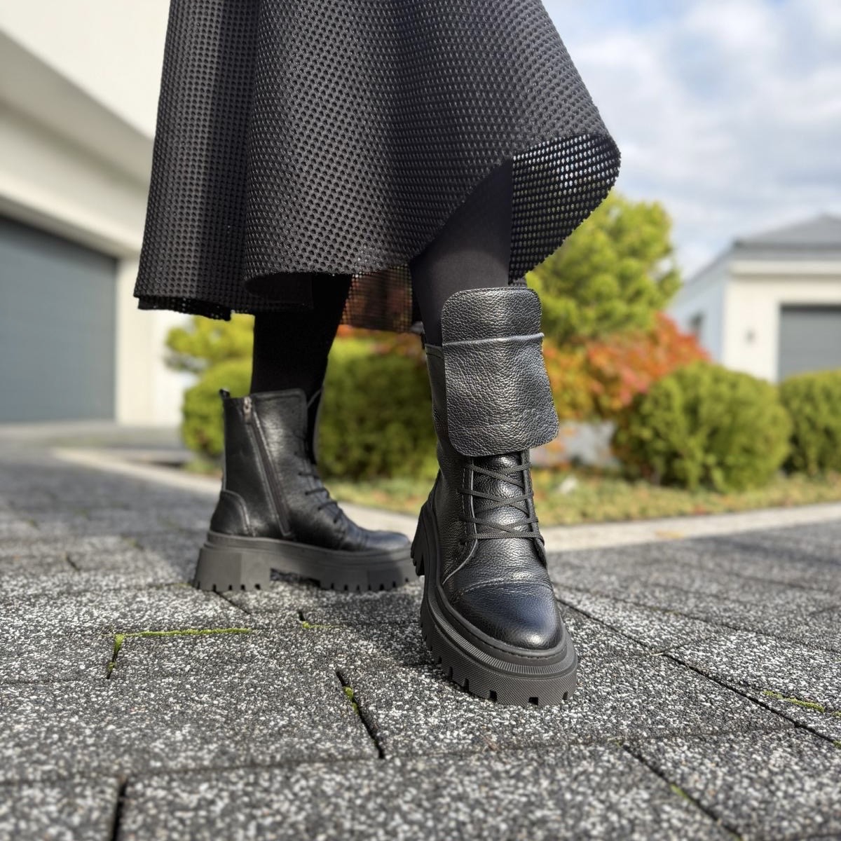 Model Angele to piękne botki damskie. Botki posiadają dwa rodzaje zapinania - zamek zapewniający łatwe zakładanie oraz sznurowadła ułatwiające dopasowanie do tęgości stopy. Ciekawą ozdobą jest dodatkowy wywinięty język, który dodaje temu modelowi wyrazistości. Buty wykonano na bardzo modnej podeszwie, która mimo masywnego wyglądu jest bardzo wygodna i lekka. Model taki na pewno będzie pięknym uzupełnieniem jesiennego lub zimowego outfitu.
