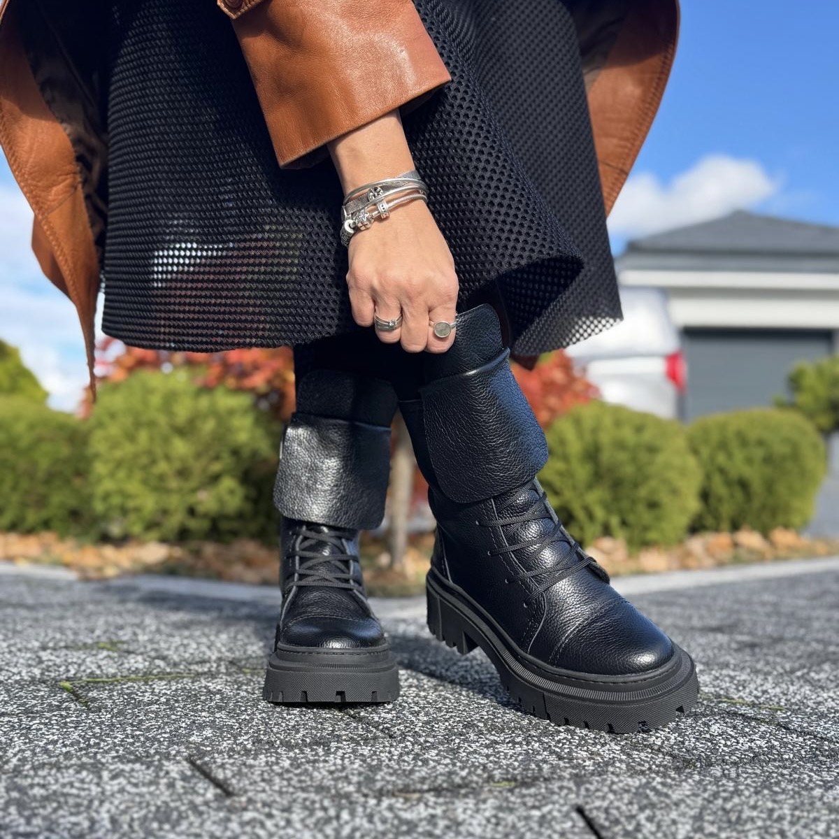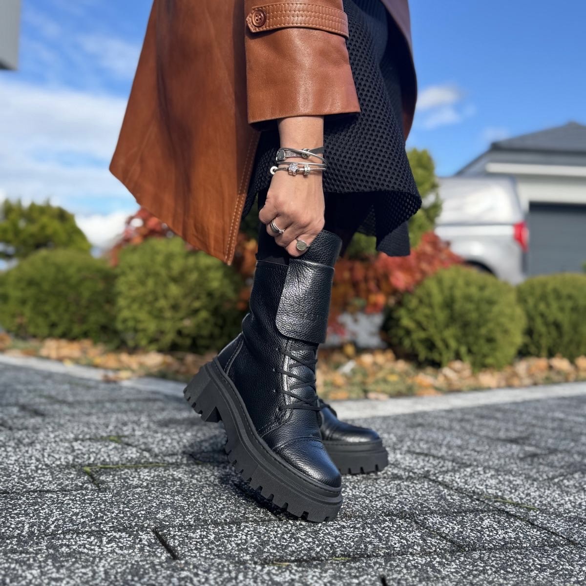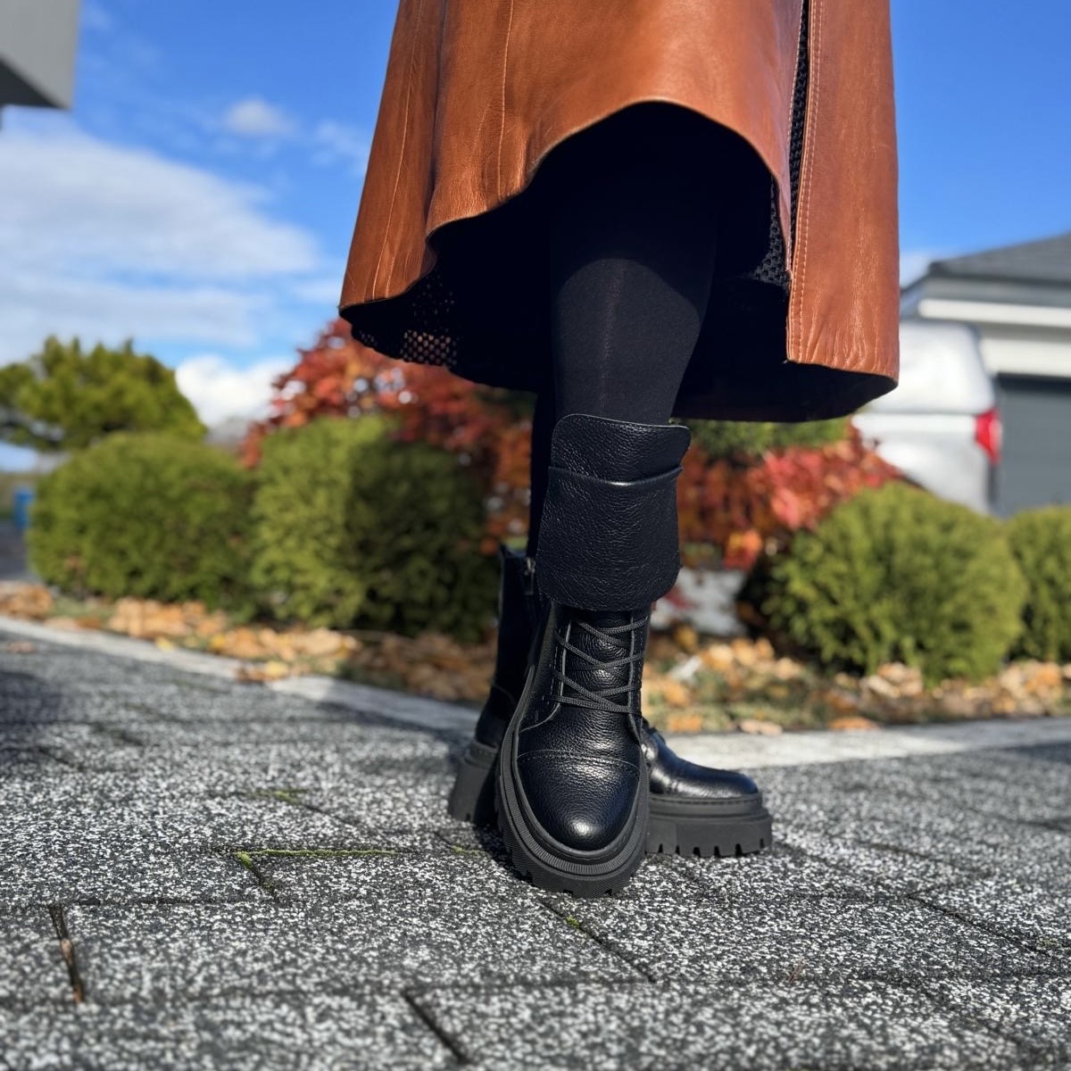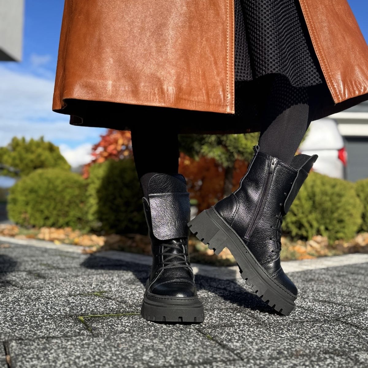 Model Angele to piękne botki damskie. Botki posiadają dwa rodzaje zapinania - zamek zapewniający łatwe zakładanie oraz sznurowadła ułatwiające dopasowanie do tęgości stopy. Ciekawą ozdobą jest dodatkowy wywinięty język, który dodaje temu modelowi wyrazistości. Buty wykonano na bardzo modnej podeszwie, która mimo masywnego wyglądu jest bardzo wygodna i lekka. Model taki na pewno będzie pięknym uzupełnieniem jesiennego lub zimowego outfitu.