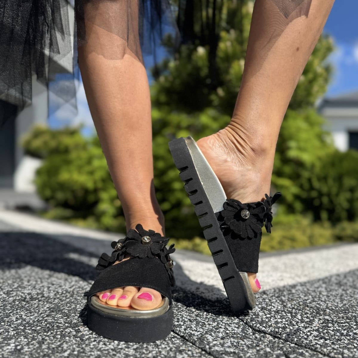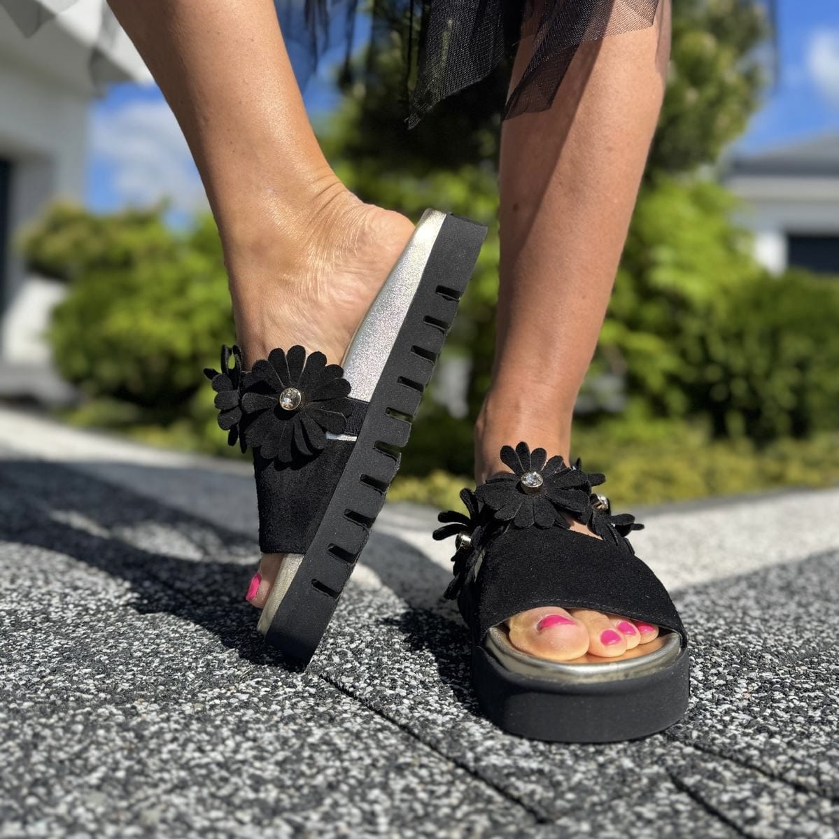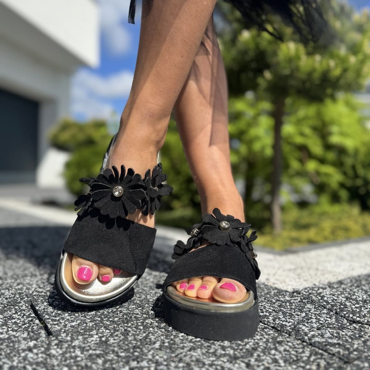 Czarne Klapki Damskie z kwiatami LURSO model VICO BLACK skóra naturalna
