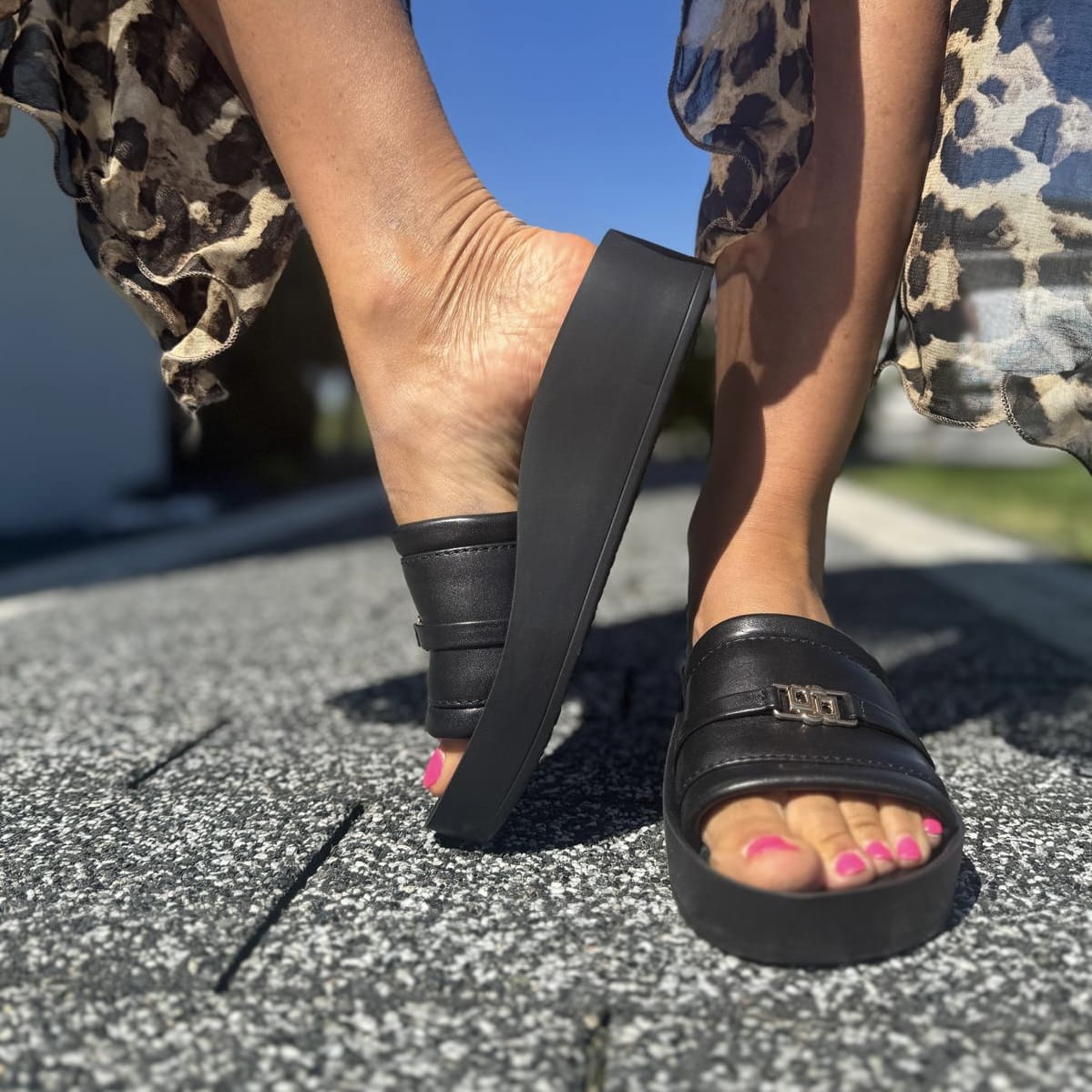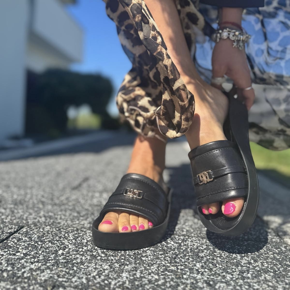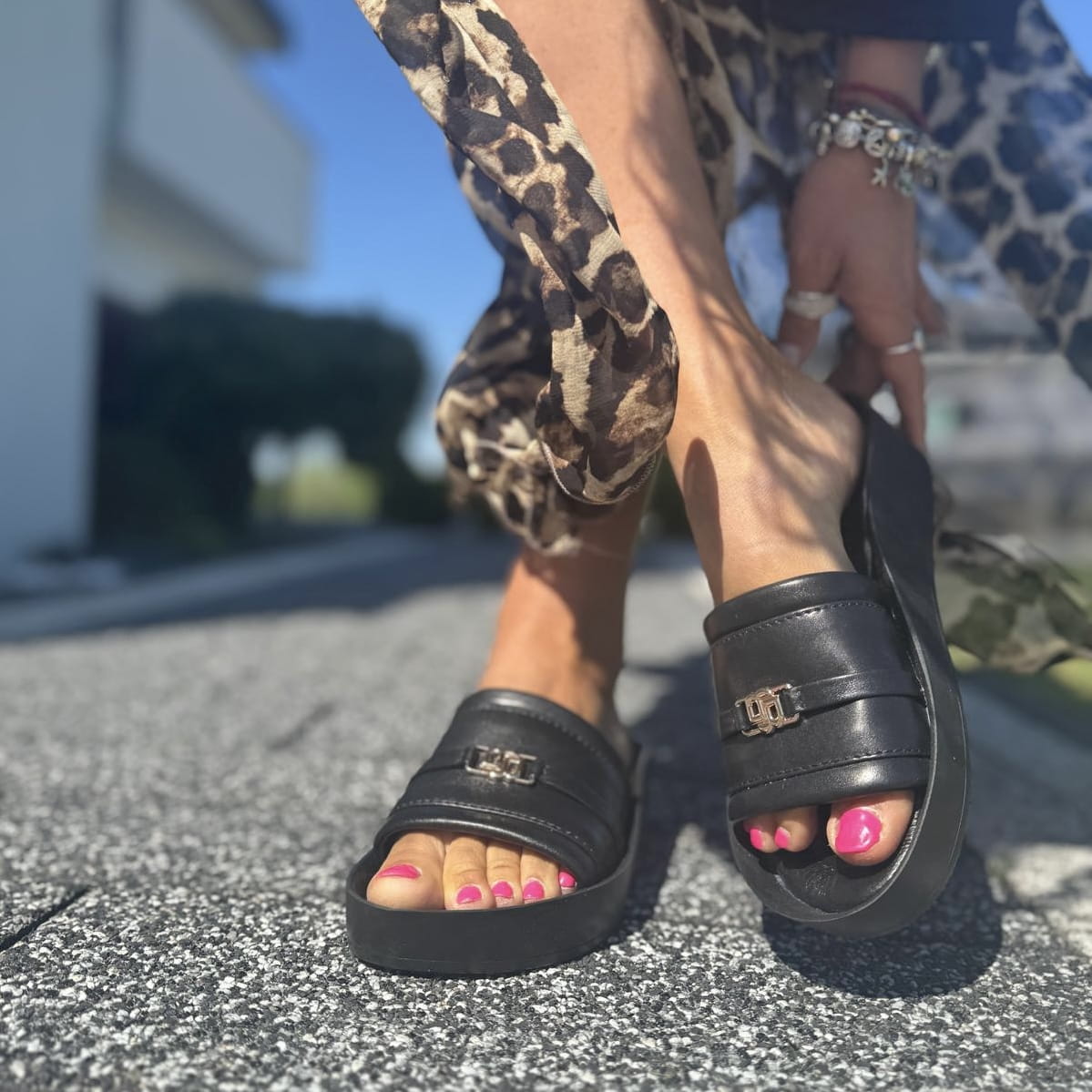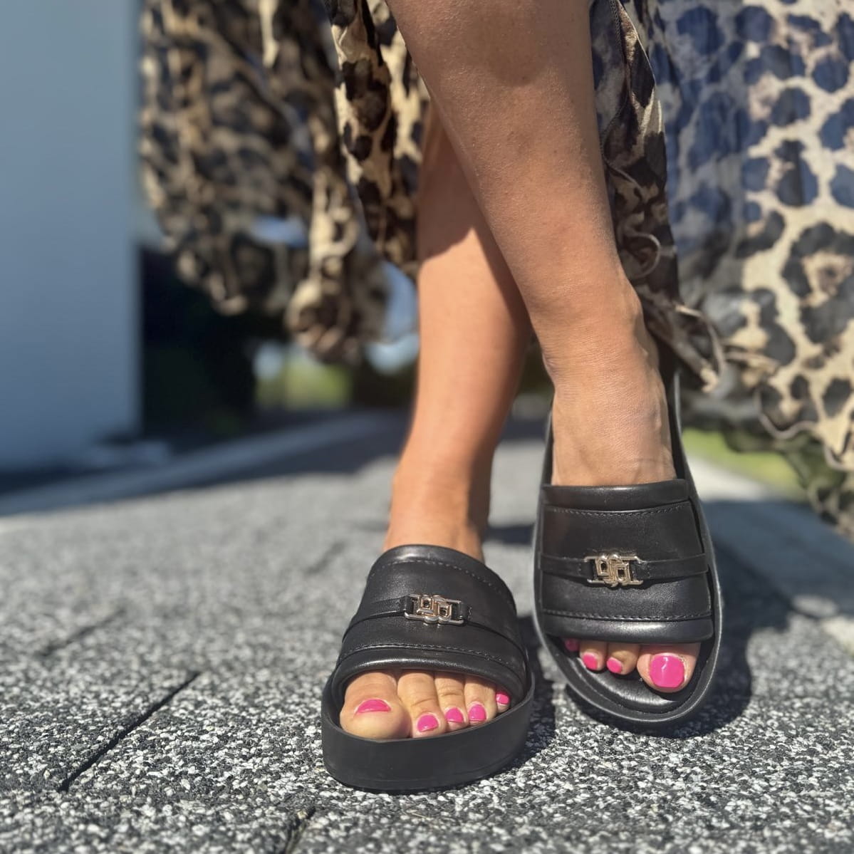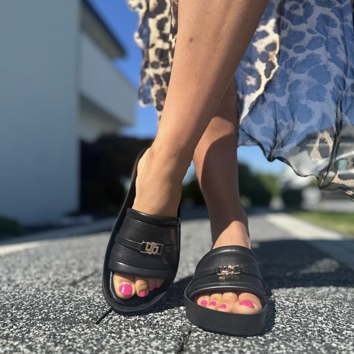 Czarne Klapki Damskie ze złotą ozdobą LURSO model STRA BLACK skóra naturalna