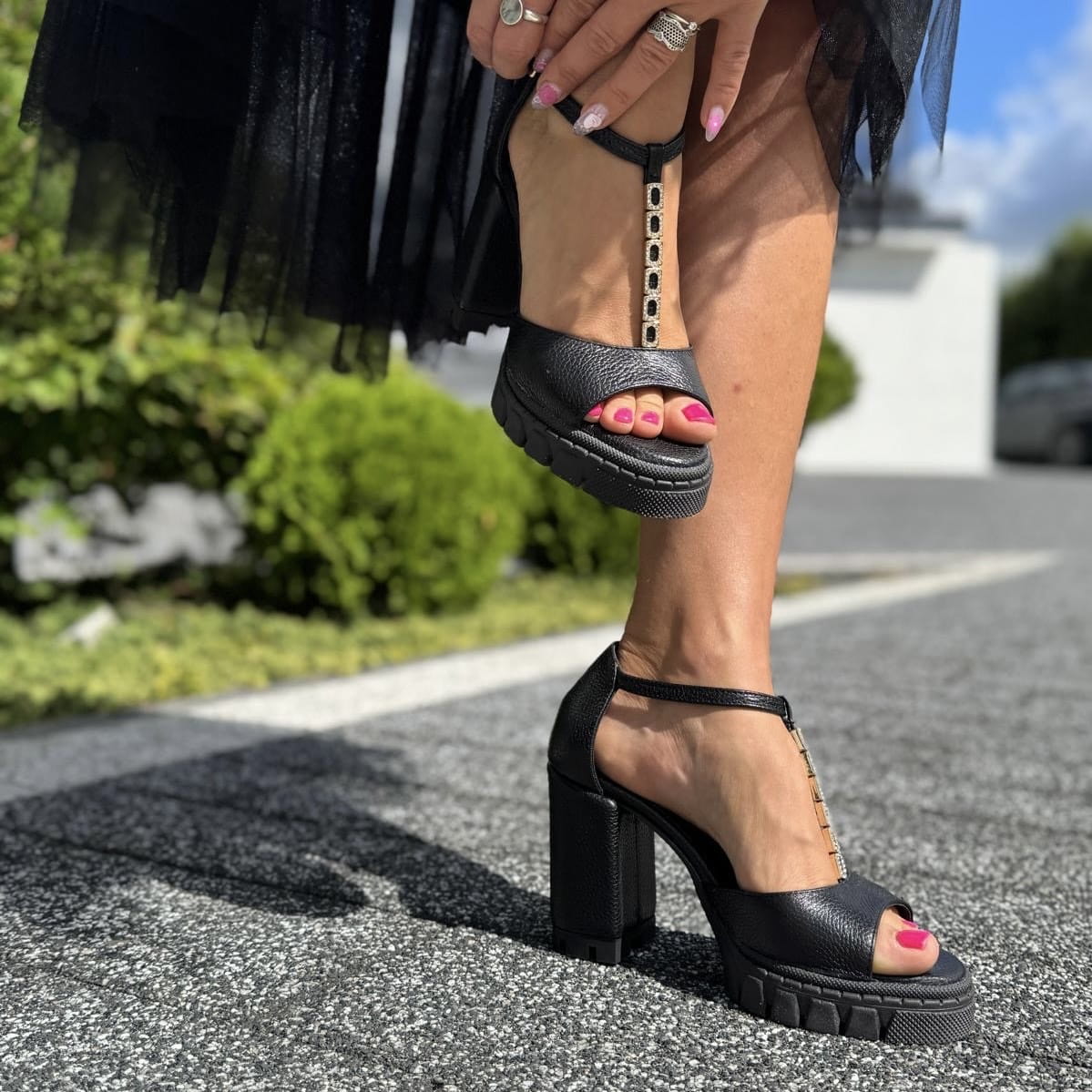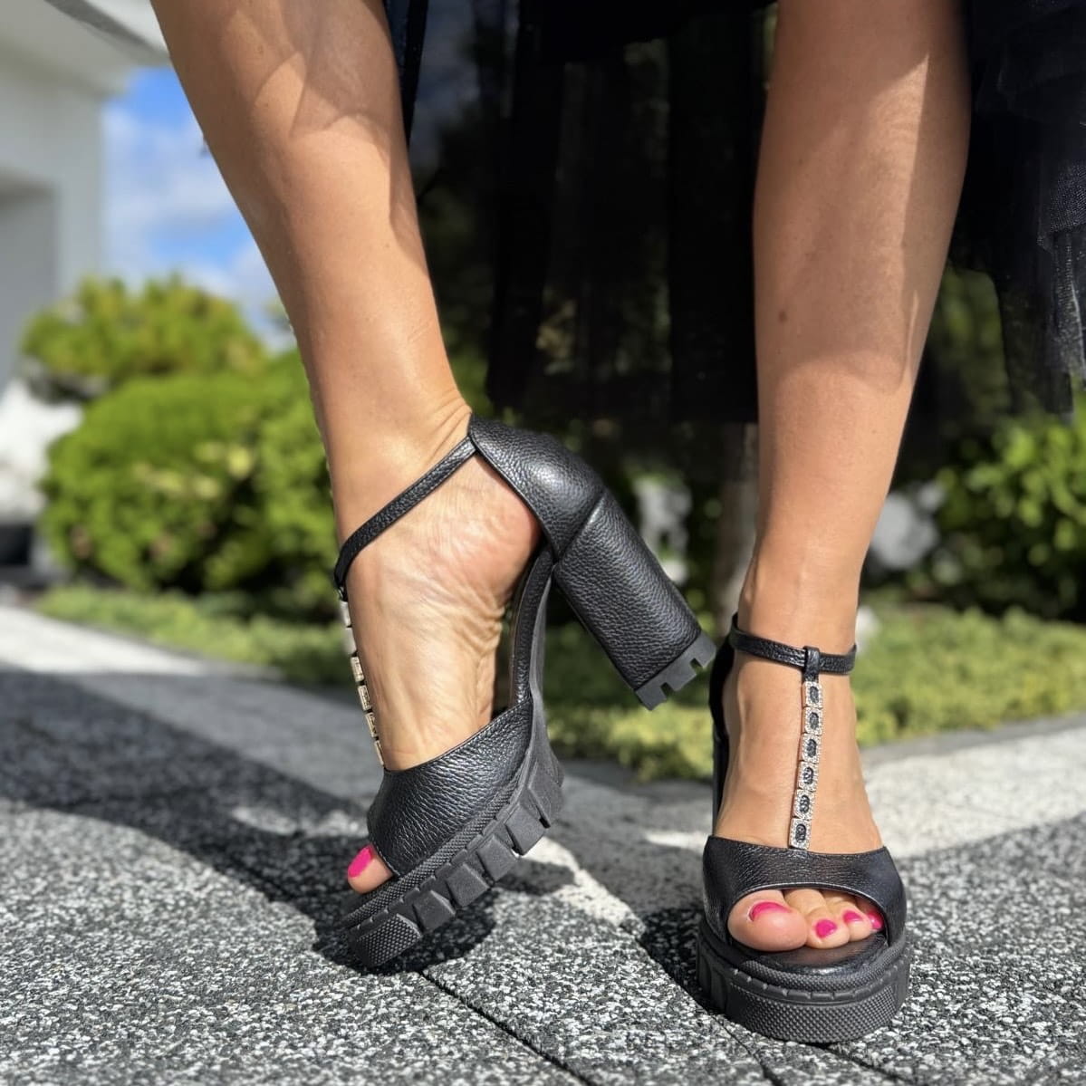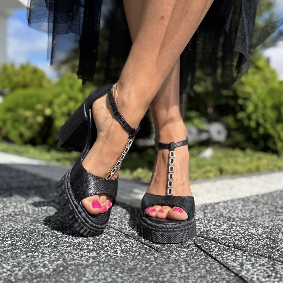 LEAH to wzór przepięknego sandała. Jest to połączenie klasycznego sandała z pełną piętą z bardzo modnym obcasem i podeszwą. Połączenie takie daje nam niepowtarzalny wygląd. Pełna pięta gwarantuje stabilność w użytkowaniu. Dodatkowym atutem jest zastosowana w tym modelu przepiękna ozdób z cyrkoniami umieszczonych na pasku w centralnej części cholewki.