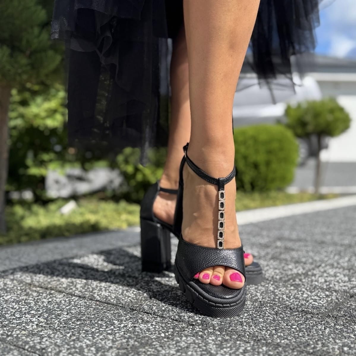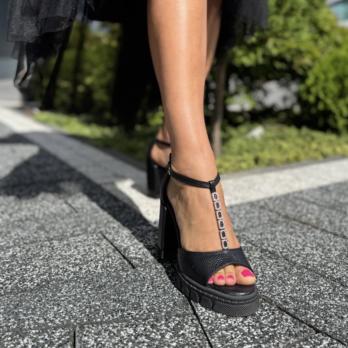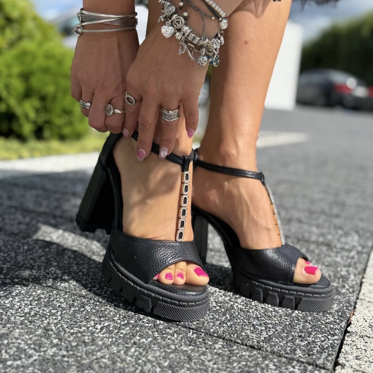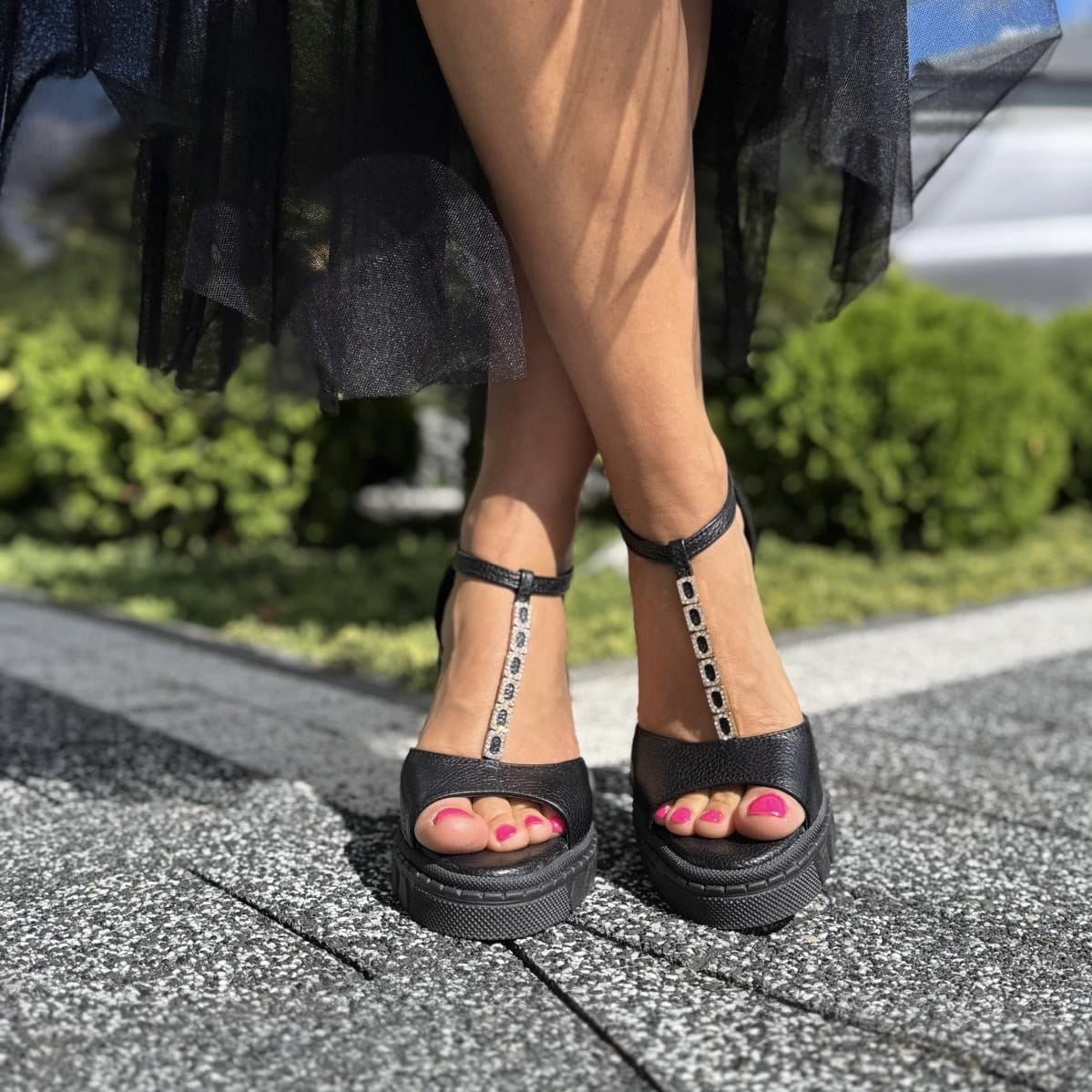 LEAH to wzór przepięknego sandała. Jest to połączenie klasycznego sandała z pełną piętą z bardzo modnym obcasem i podeszwą. Połączenie takie daje nam niepowtarzalny wygląd. Pełna pięta gwarantuje stabilność w użytkowaniu. Dodatkowym atutem jest zastosowana w tym modelu przepiękna ozdób z cyrkoniami umieszczonych na pasku w centralnej części cholewki.