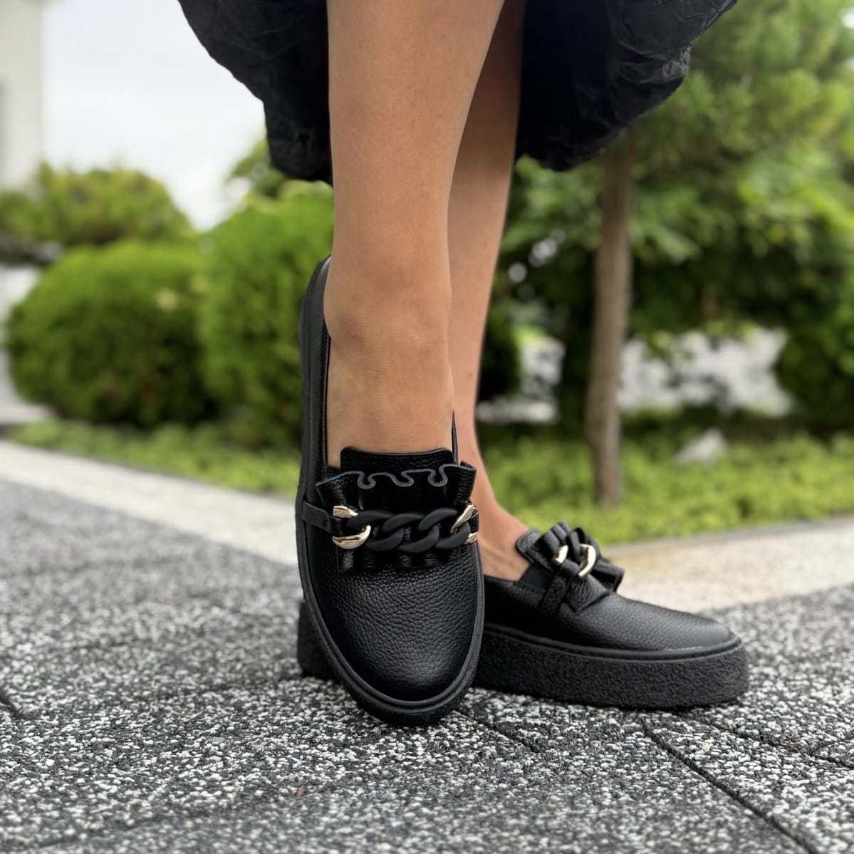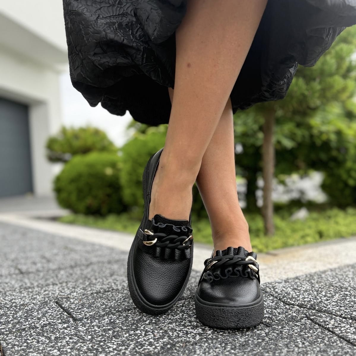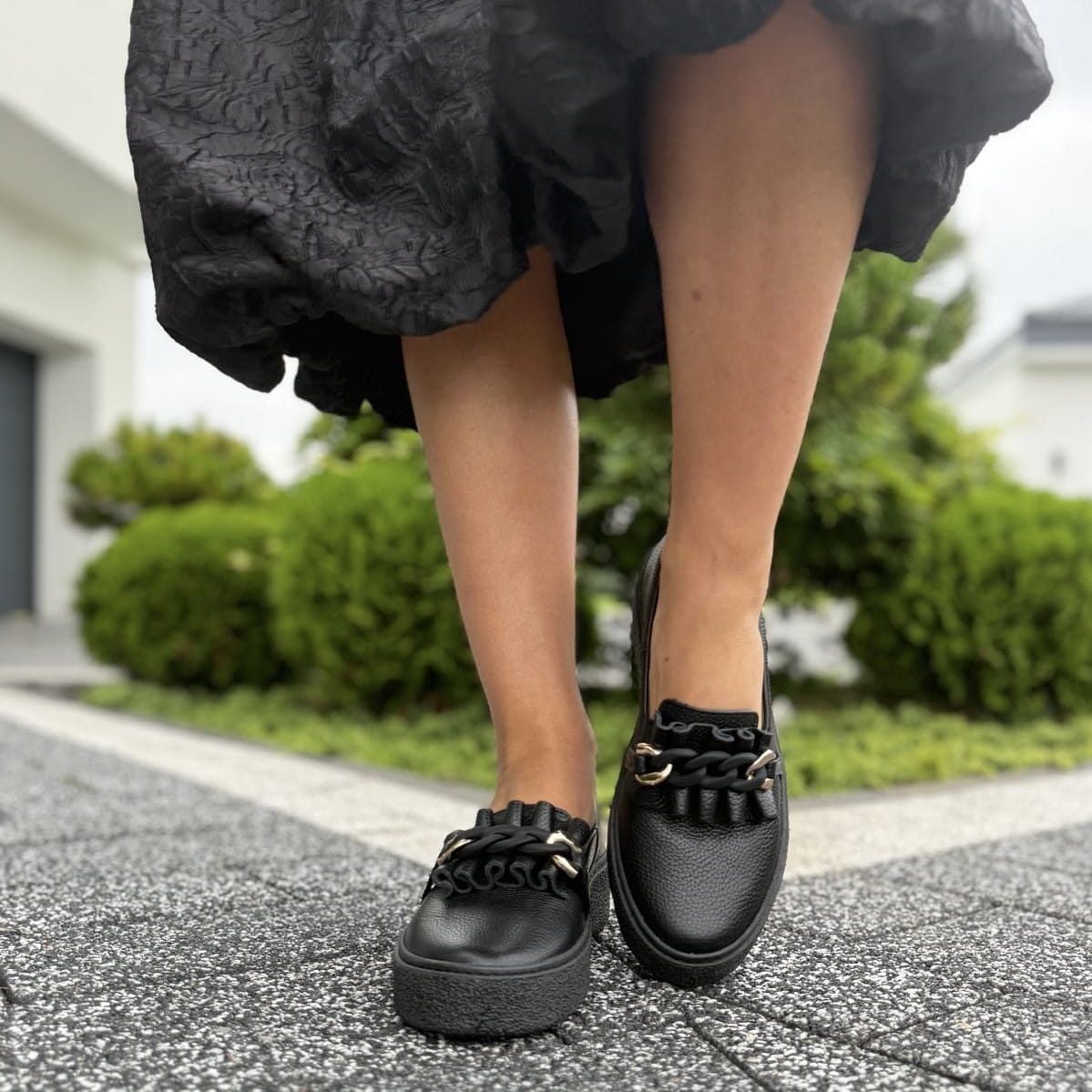 Czarne Slipony Damskie z ozdobą LURSO model IVREA BLACK skóra naturalna