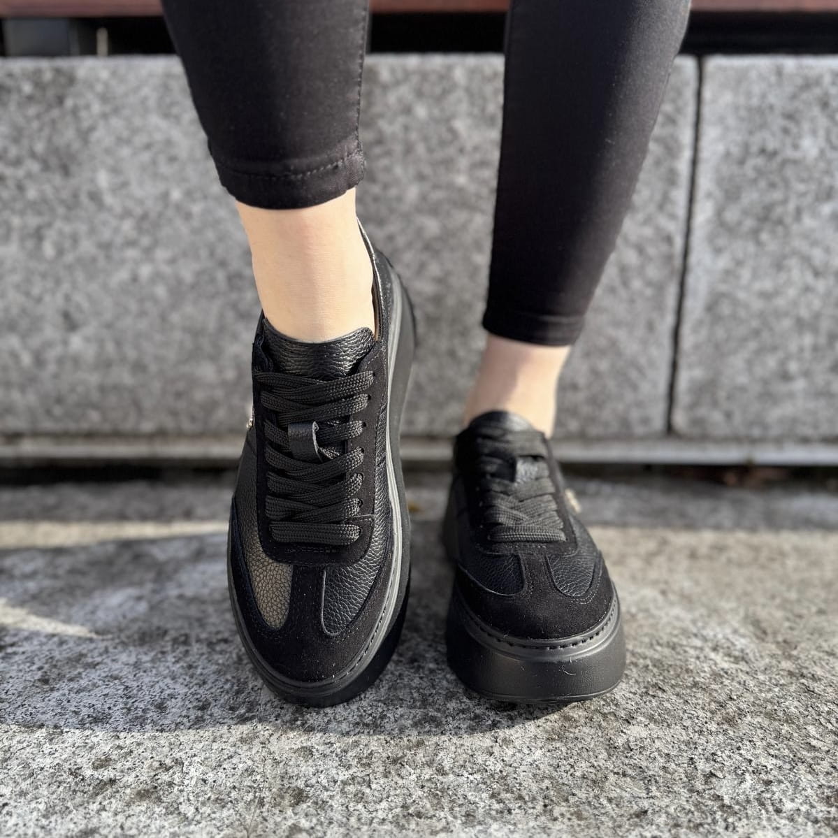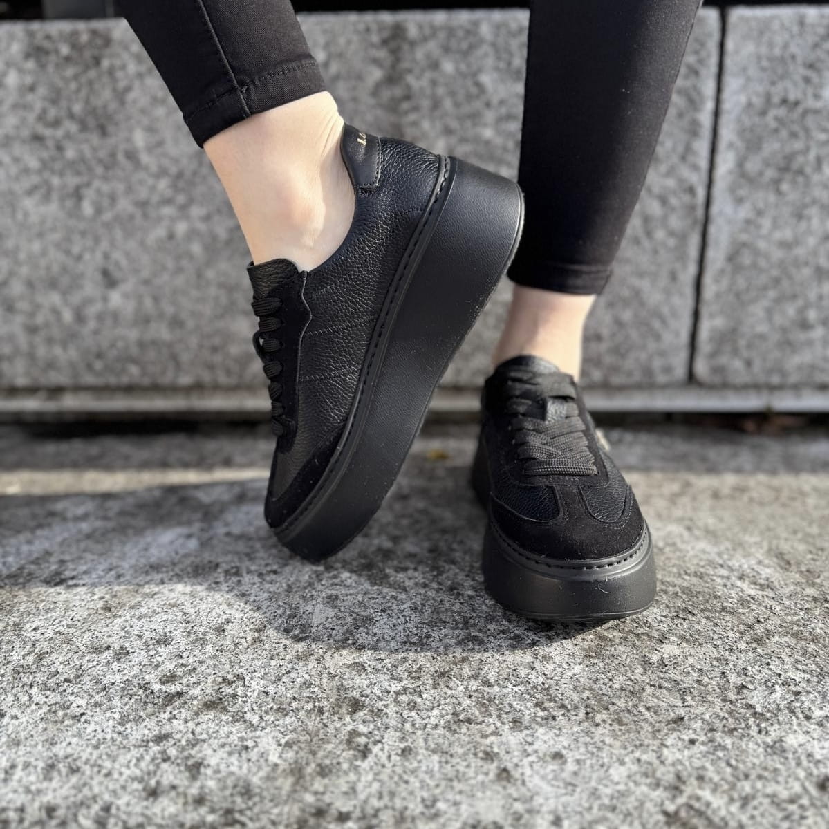 Czarne Sneakersy Damskie na podwyższonej podeszwie FERNO BLACK skóra naturalna