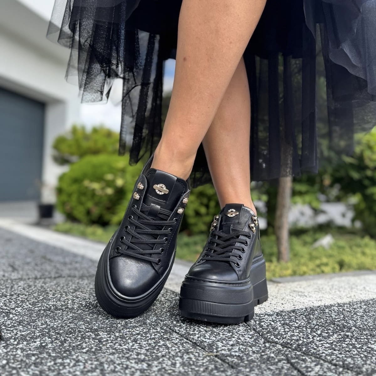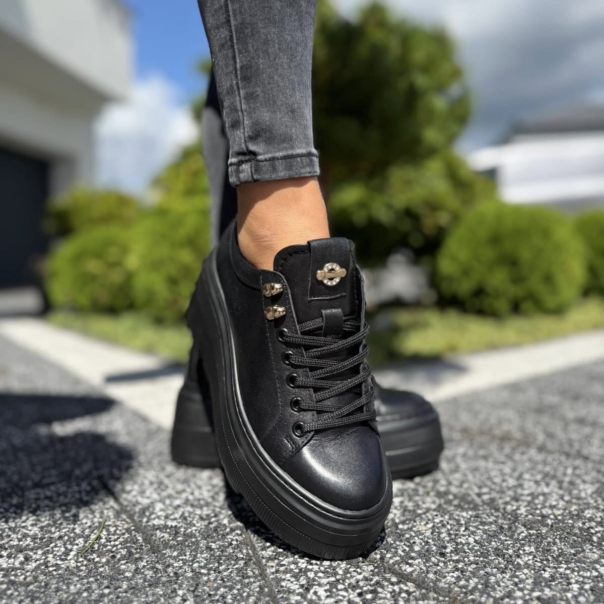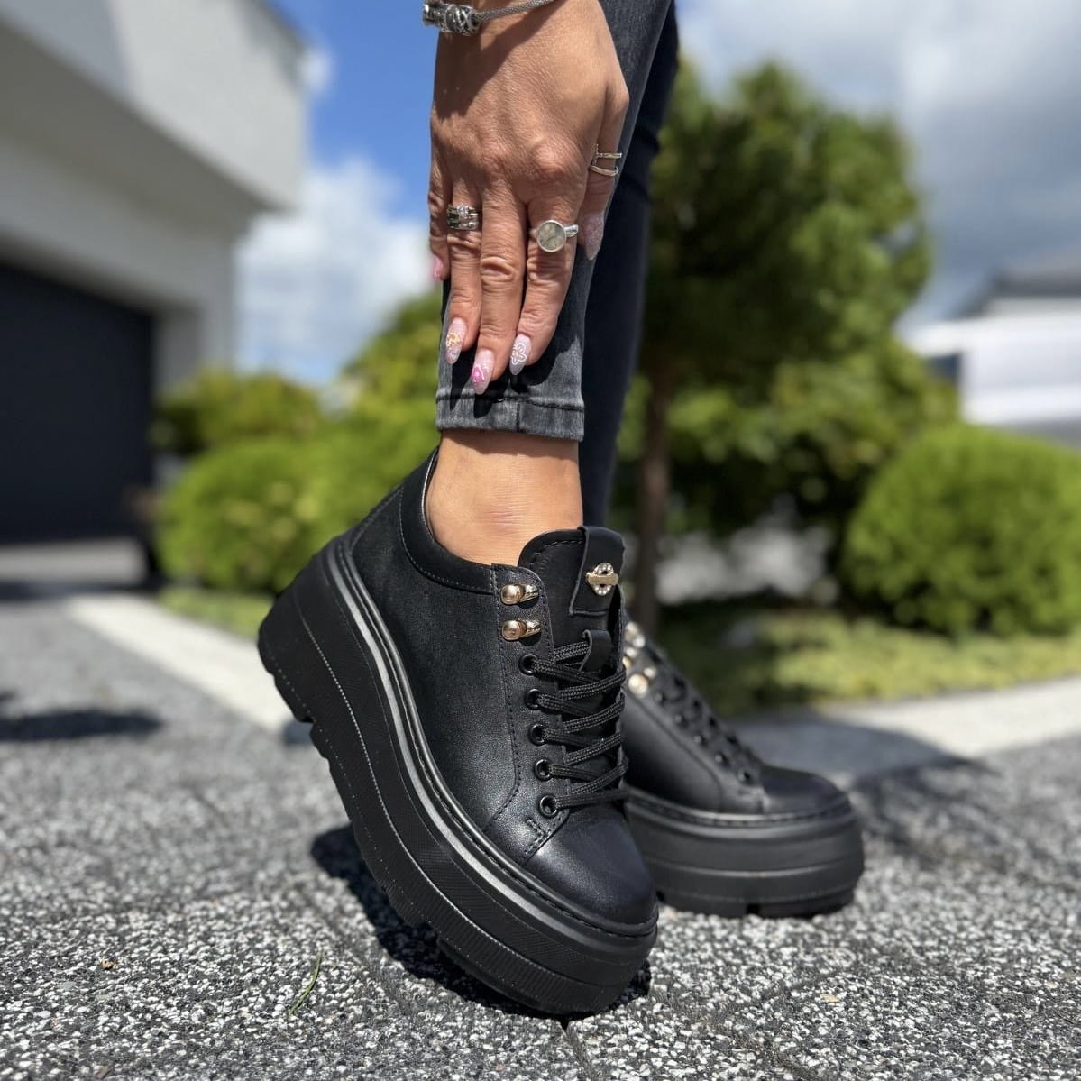 Czarne Sneakersy Damskie na podwyższonej podeszwie GELA BLACK skóra naturalna