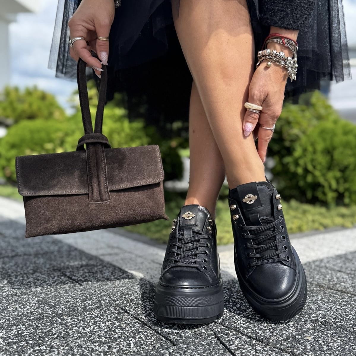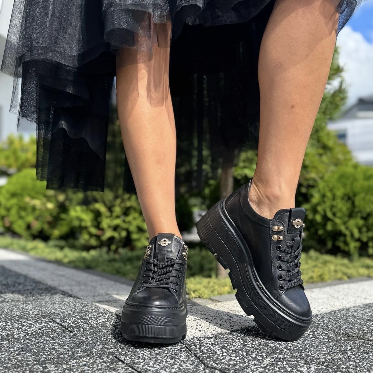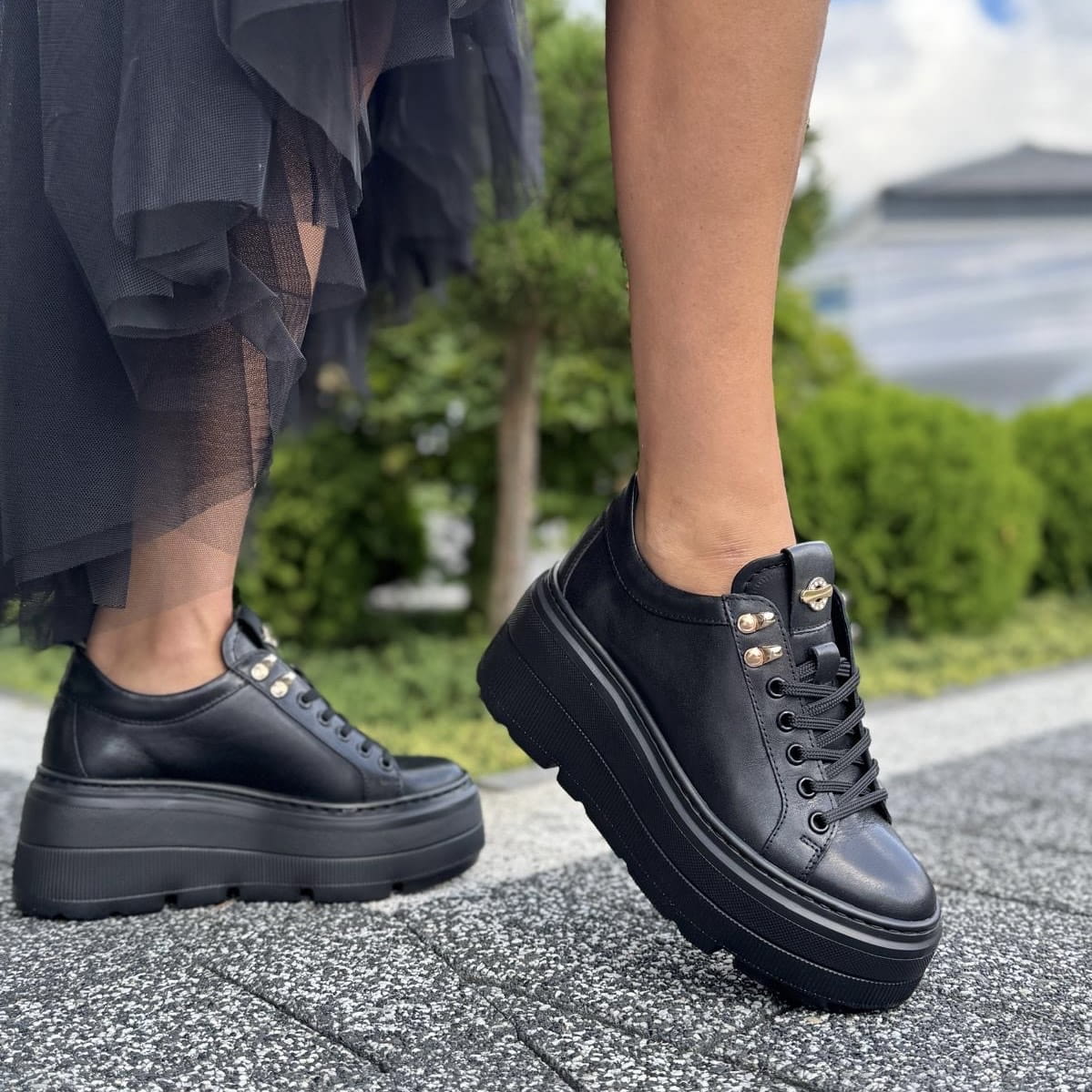 Czarne Sneakersy Damskie na podwyższonej podeszwie GELA BLACK skóra naturalna