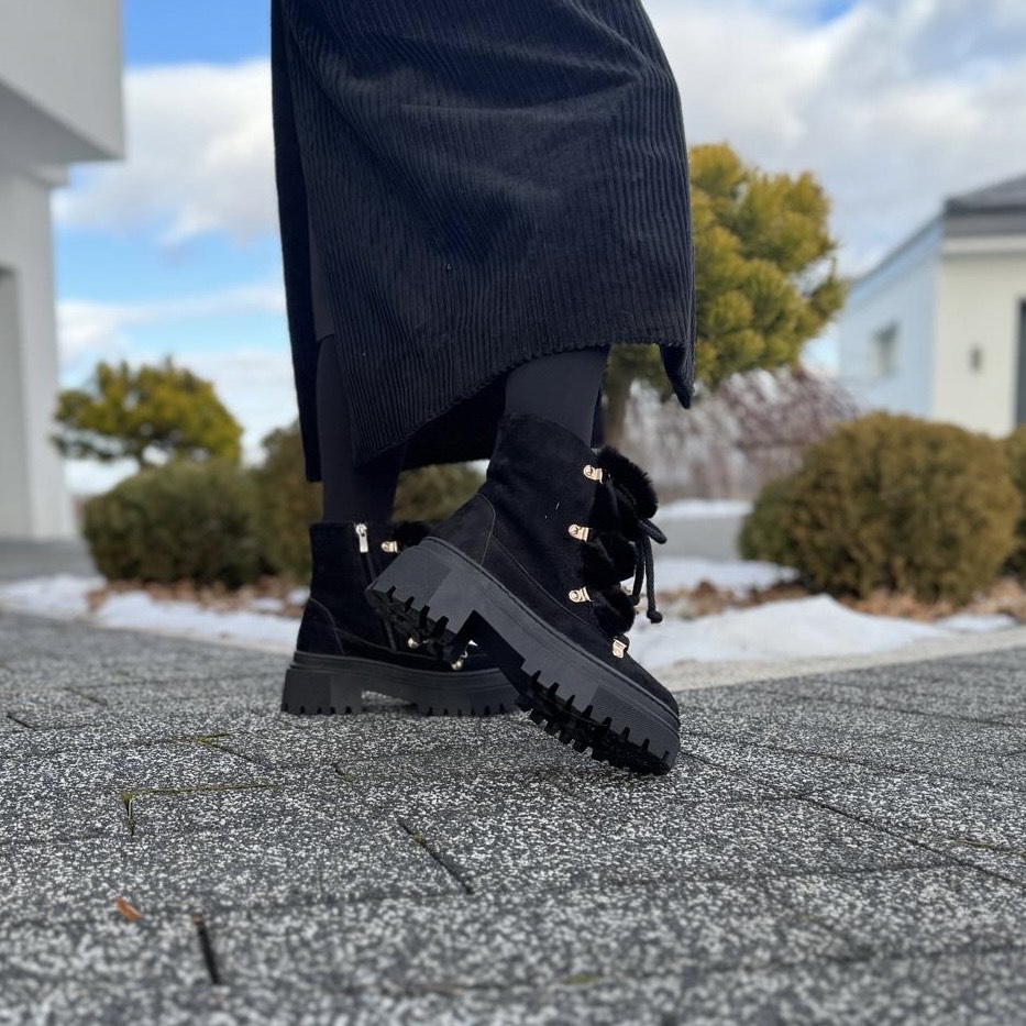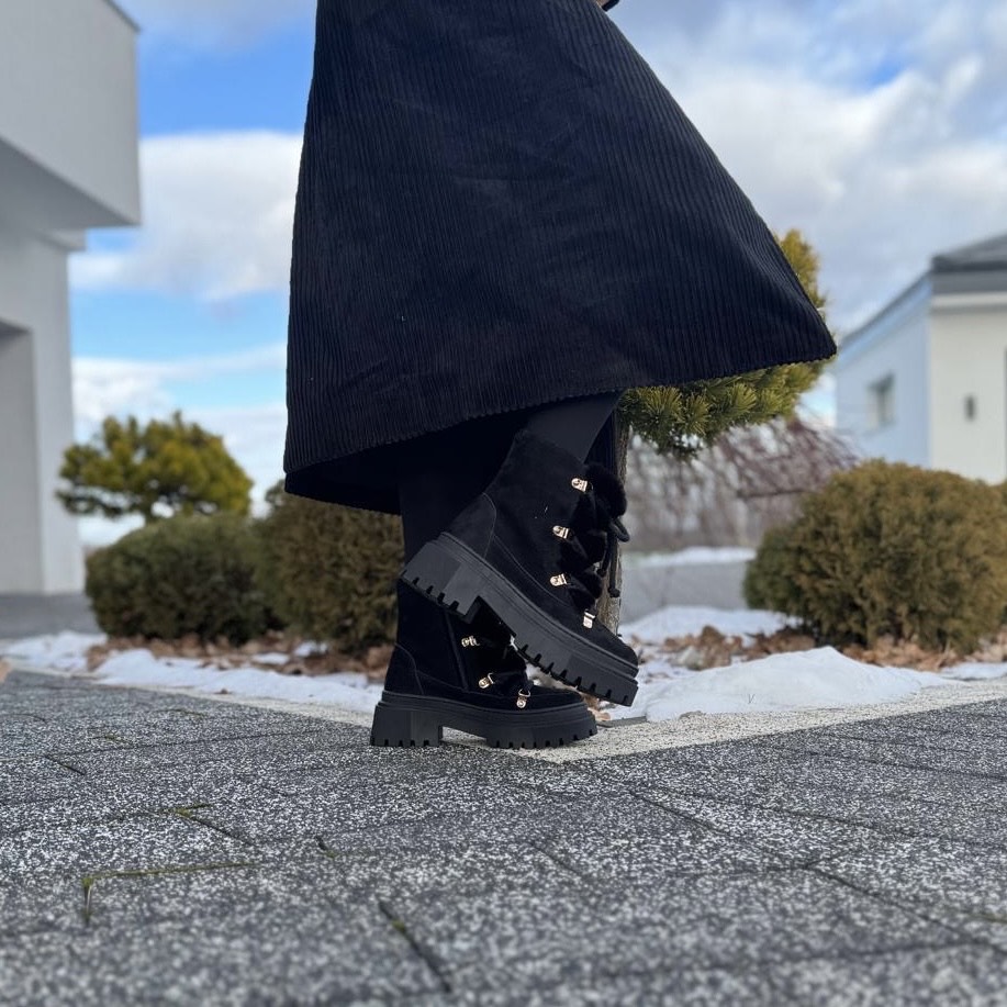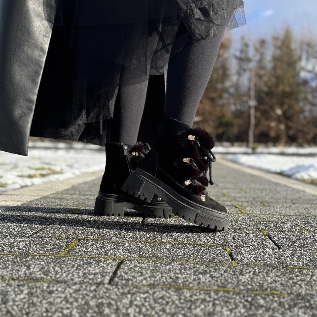 Czarne Śniegowce Damskie na traperowej podeszwie RADDA BLACK skóra naturalna