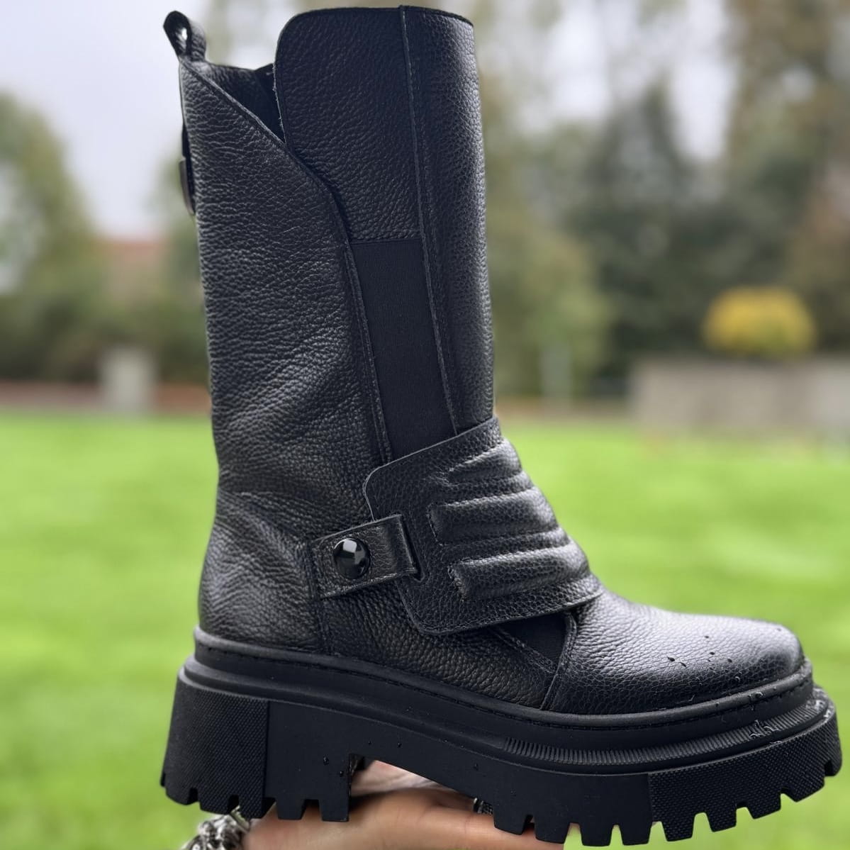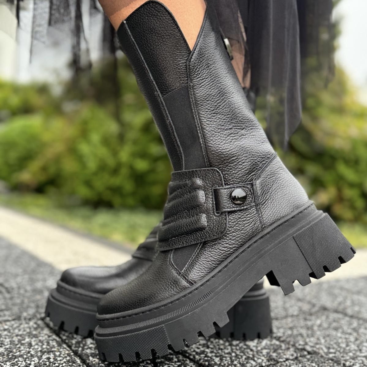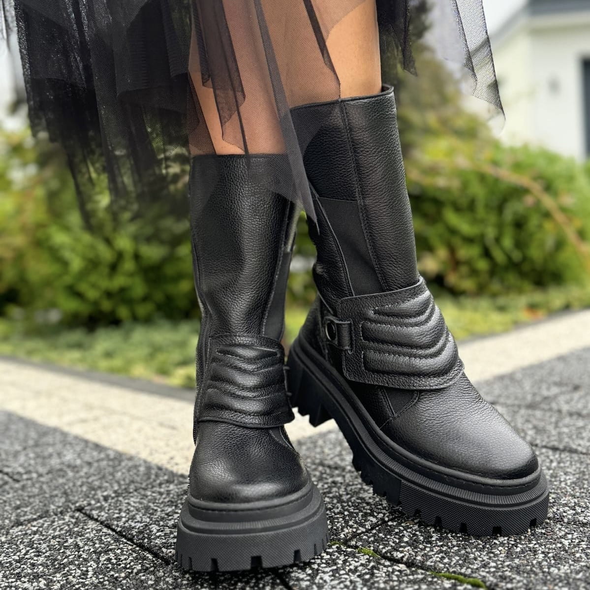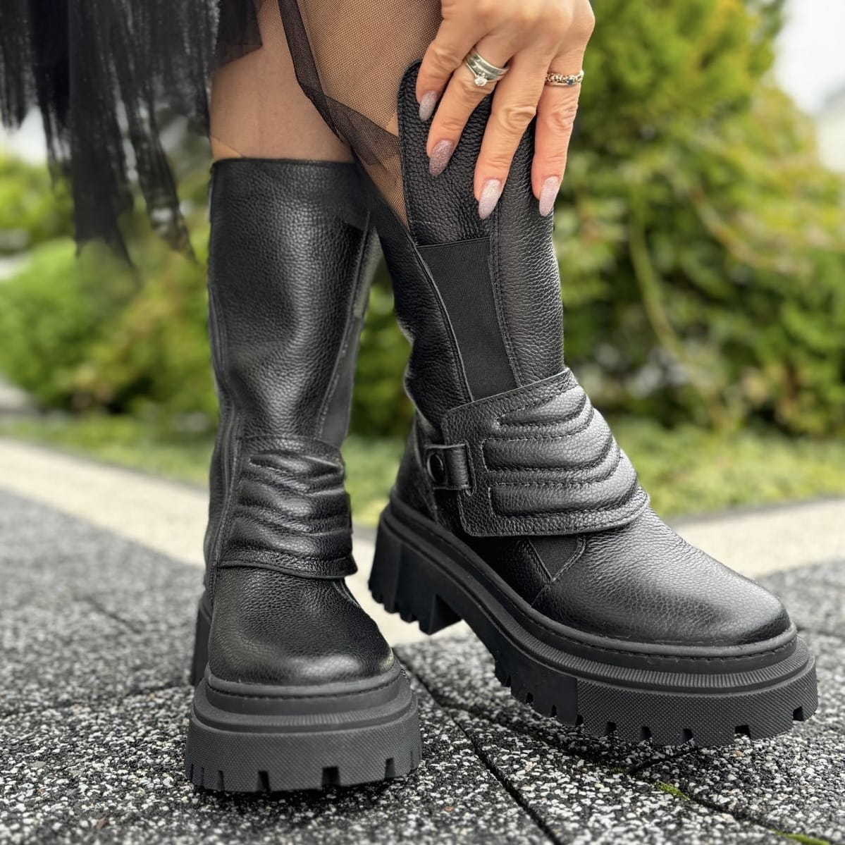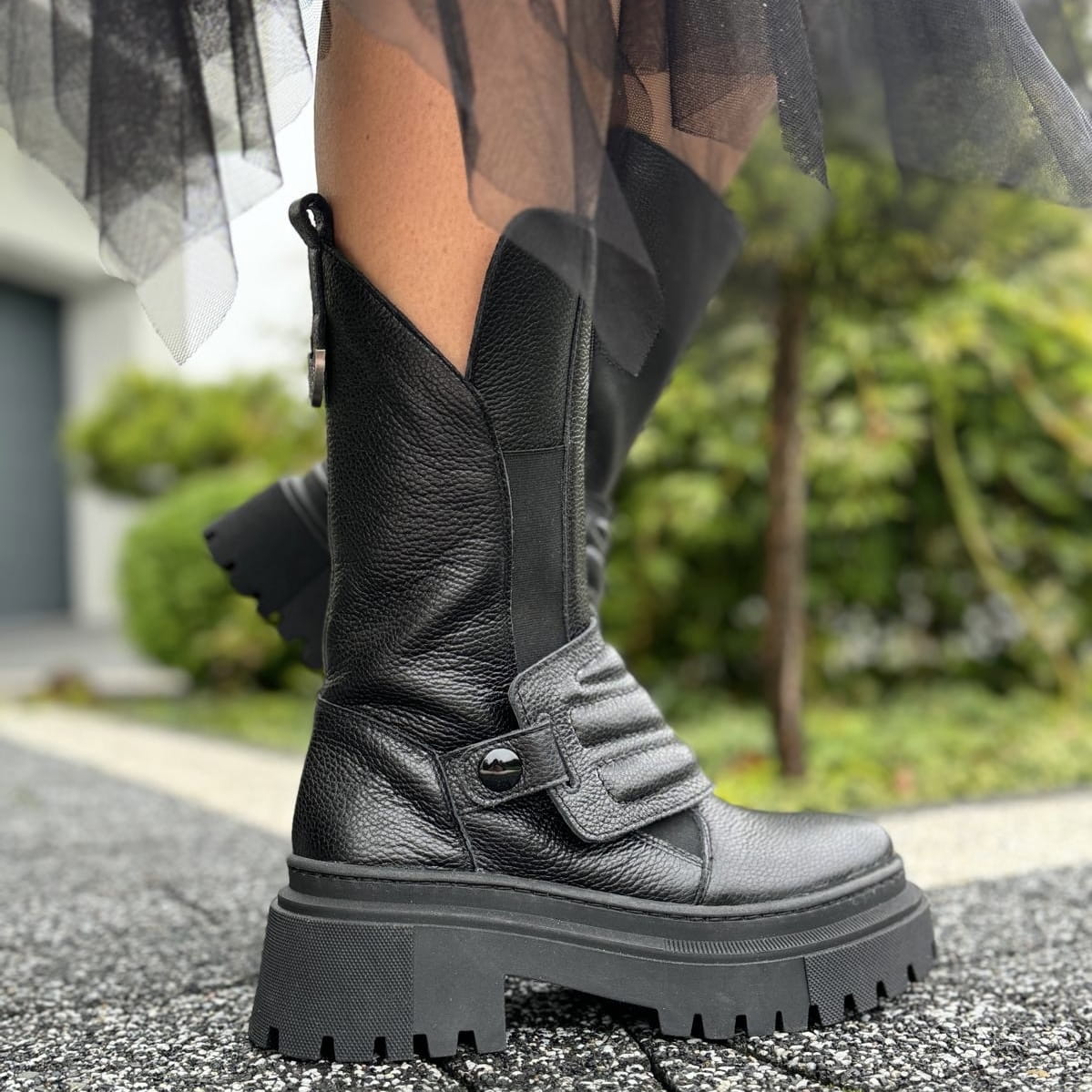 Piękne wysokie trapery model Solofra. Wysokość cholewy sięga połowy łydki dzięki ciekawemu rozwiązaniu góry cholewki oraz zastosowanej gumie z zewnętrznej strony buty dopasowują się prawie do każdej nogi. Użyty zamek z wewnętrznej strony zapewnia komfort i wygodę podczas zakładani oraz zdejmowania obuwia. Buty zostały wykonane na zjawiskowej podeszwie o podwyższonym boku oraz grubym traperze. Wzór ten może znaleźć zastosowanie w wielu bardzo różnych stylizacjach ograniczenie to tylko wyobraźnia i wyczucie użytkownika.