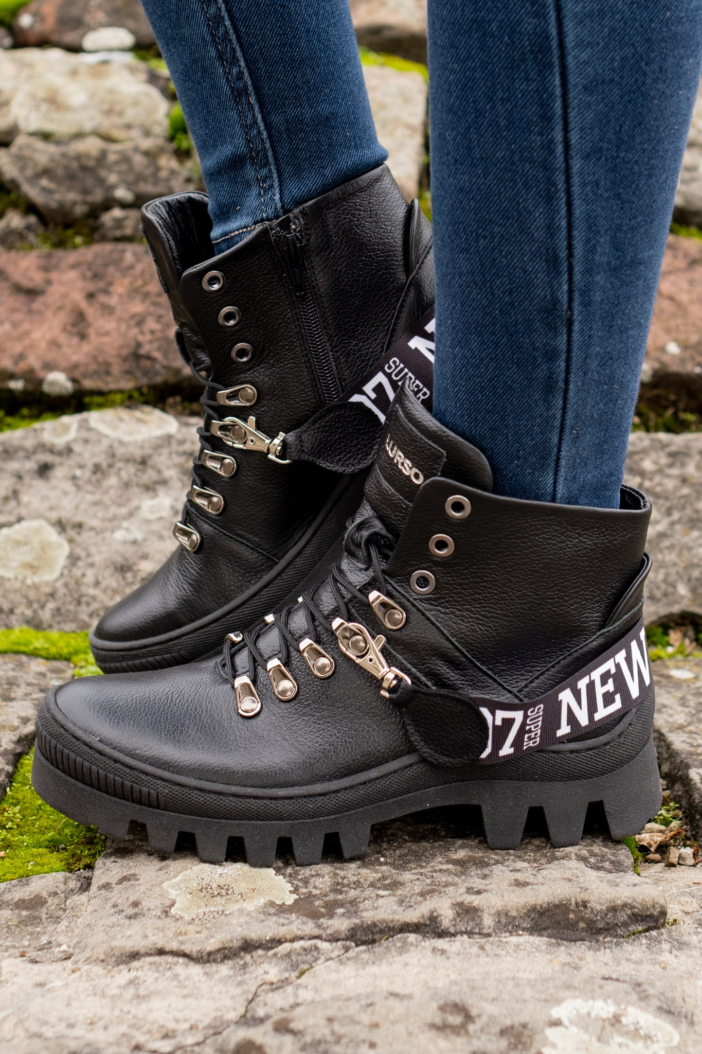 Czarne licowe Traperki Damskie nad kostkę LURSO z dopinaną taśmą model YOLANDE BLACK