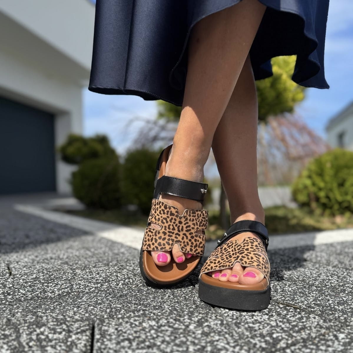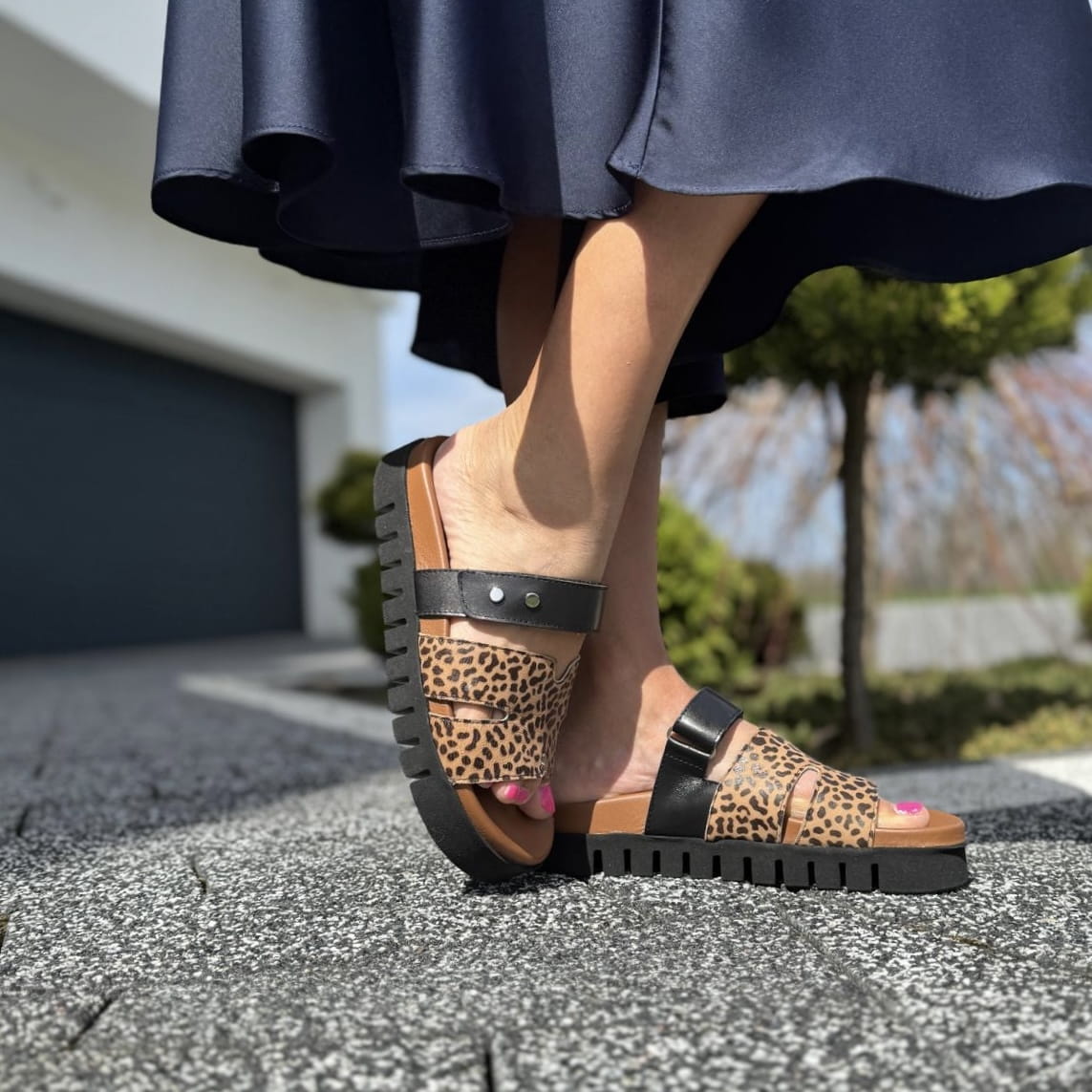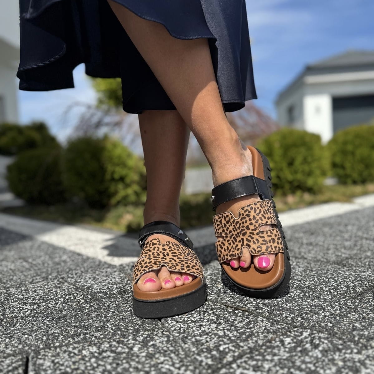 Czarno-rude Klapki Damskie w panterkę LURSO model ERBA BLACK/COGNAC skóra naturalna