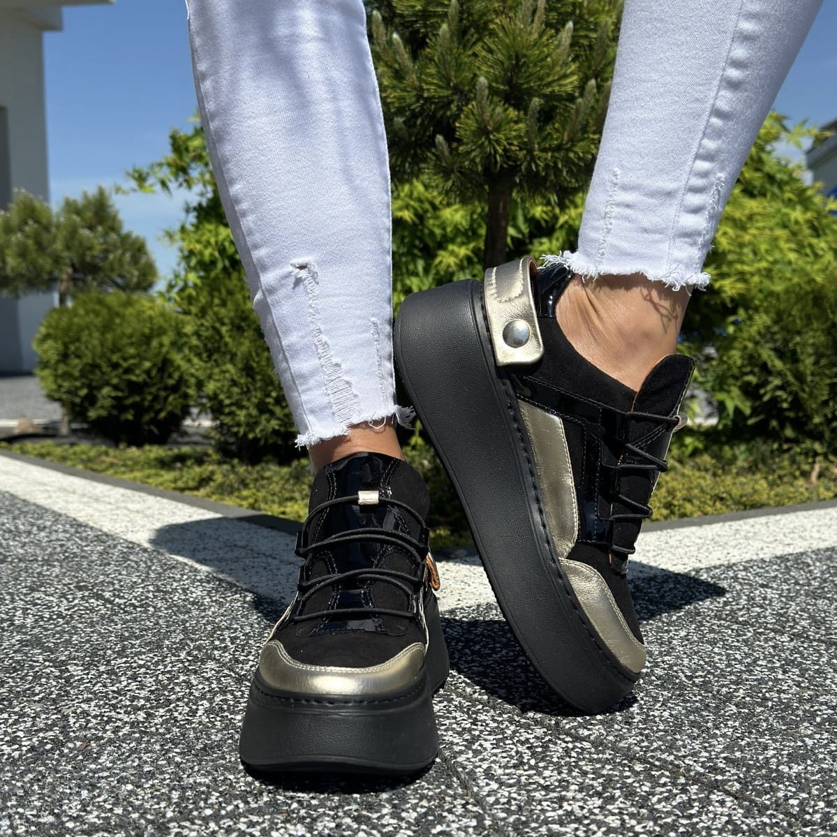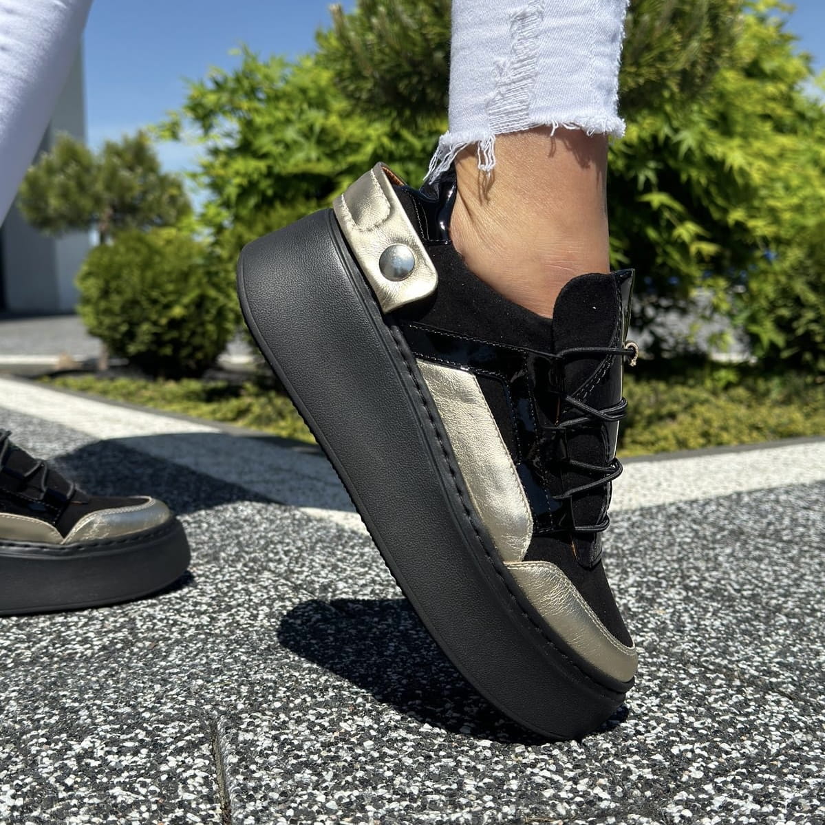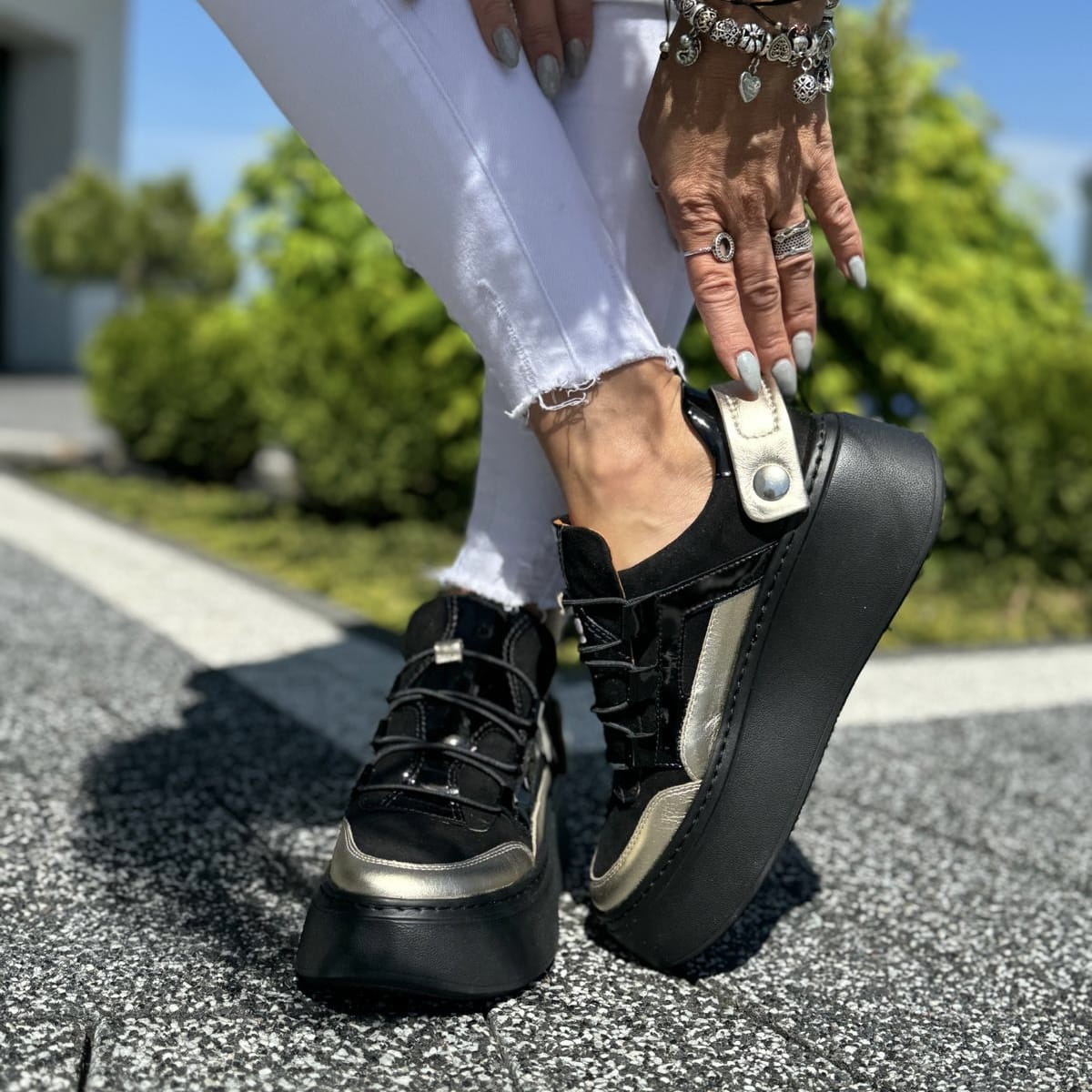 Czarno-złote Sneakersy Damskie LURSO model BRESCIA BLACK/GOLD skóra naturalna