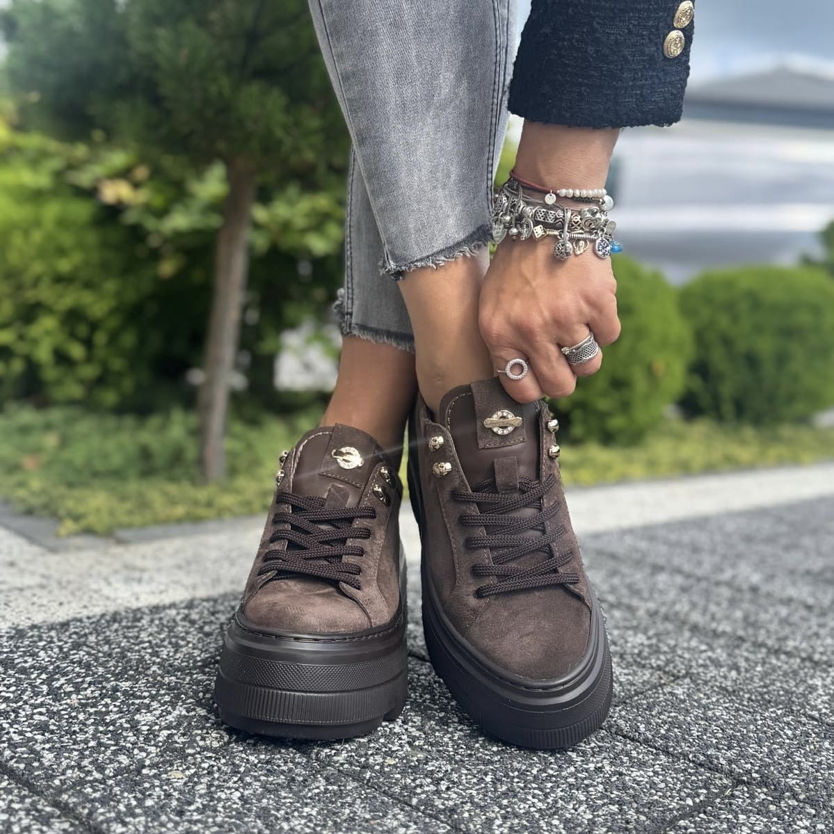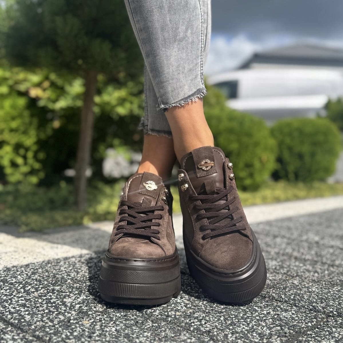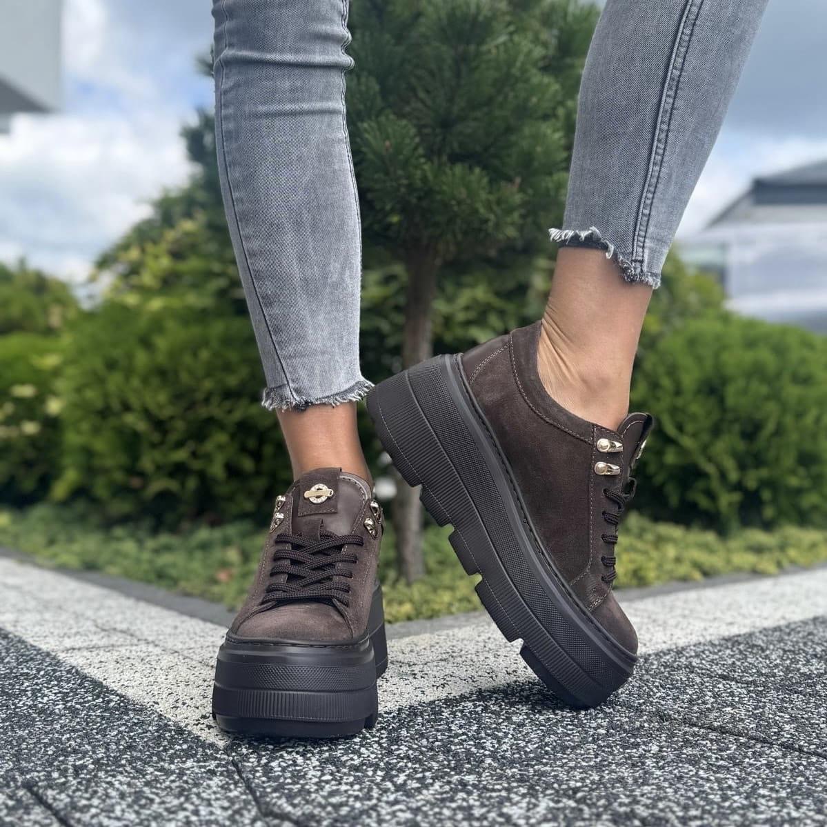 Czekoladowe Sneakersy Damskie na podwyższonej podeszwie GELA CHOCOLATE BROWN skóra naturalna