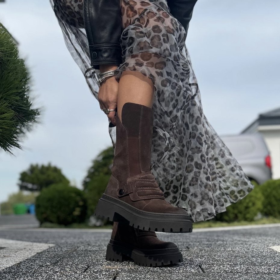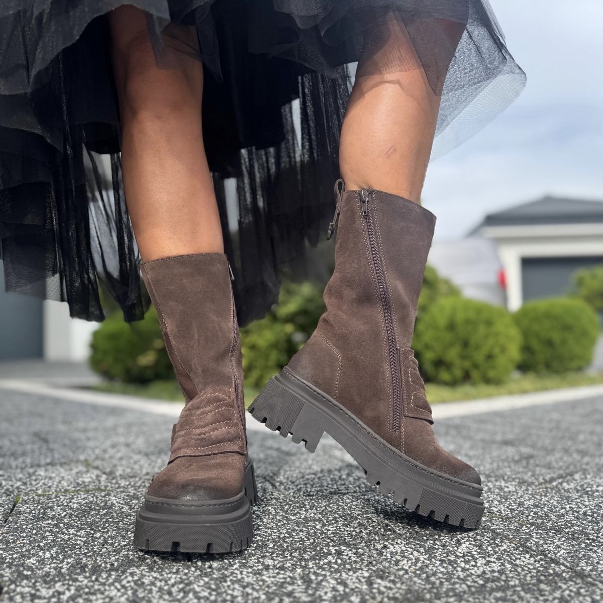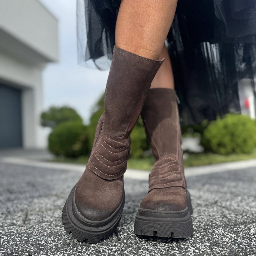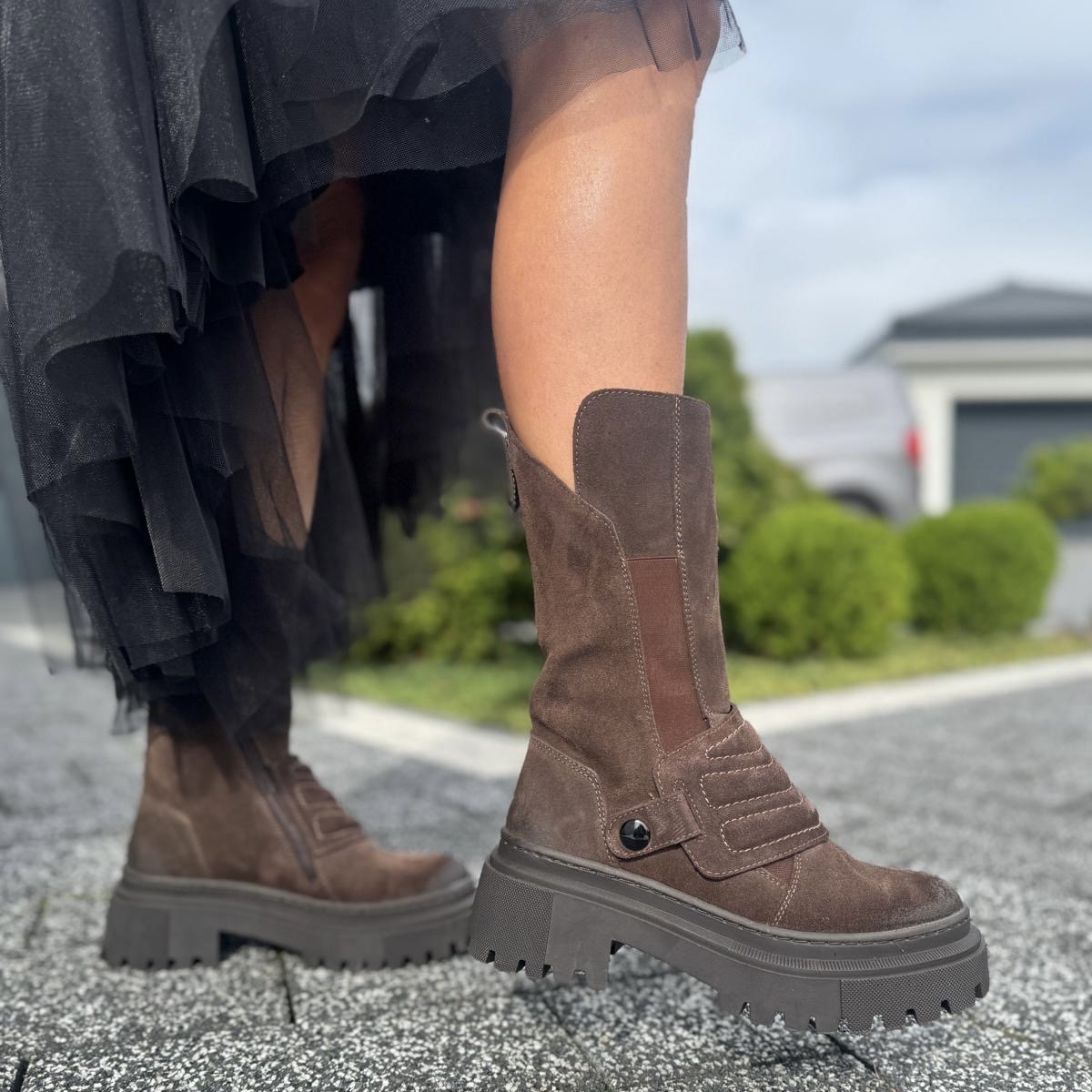 Piękne wysokie ocieplane trapery model Solofra. Wysokość cholewy sięga połowy łydki dzięki ciekawemu rozwiązaniu góry cholewki oraz zastosowanej gumie z zewnętrznej strony buty dopasowują się prawie do każdej nogi. Użyty zamek z wewnętrznej strony zapewnia komfort i wygodę podczas zakładani oraz zdejmowania obuwia. Buty zostały wykonane na zjawiskowej podeszwie o podwyższonym boku oraz grubym traperze. Wzór ten może znaleźć zastosowanie w wielu bardzo różnych stylizacjach ograniczenie to tylko wyobraźnia i wyczucie użytkownika.
