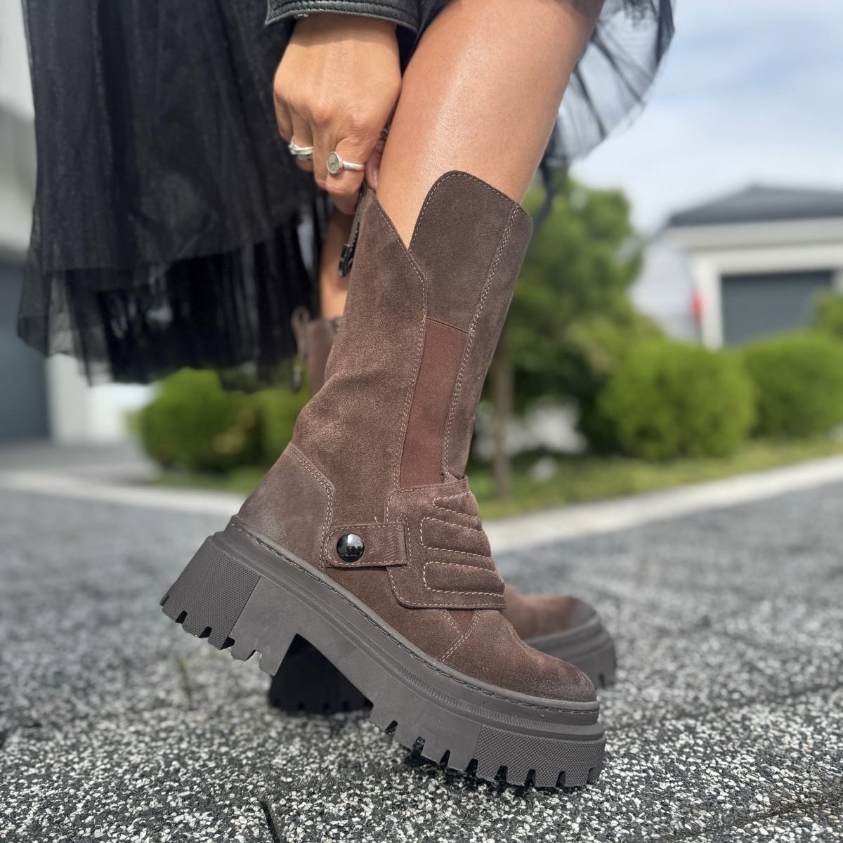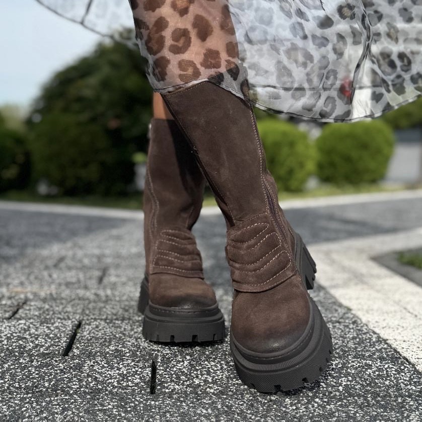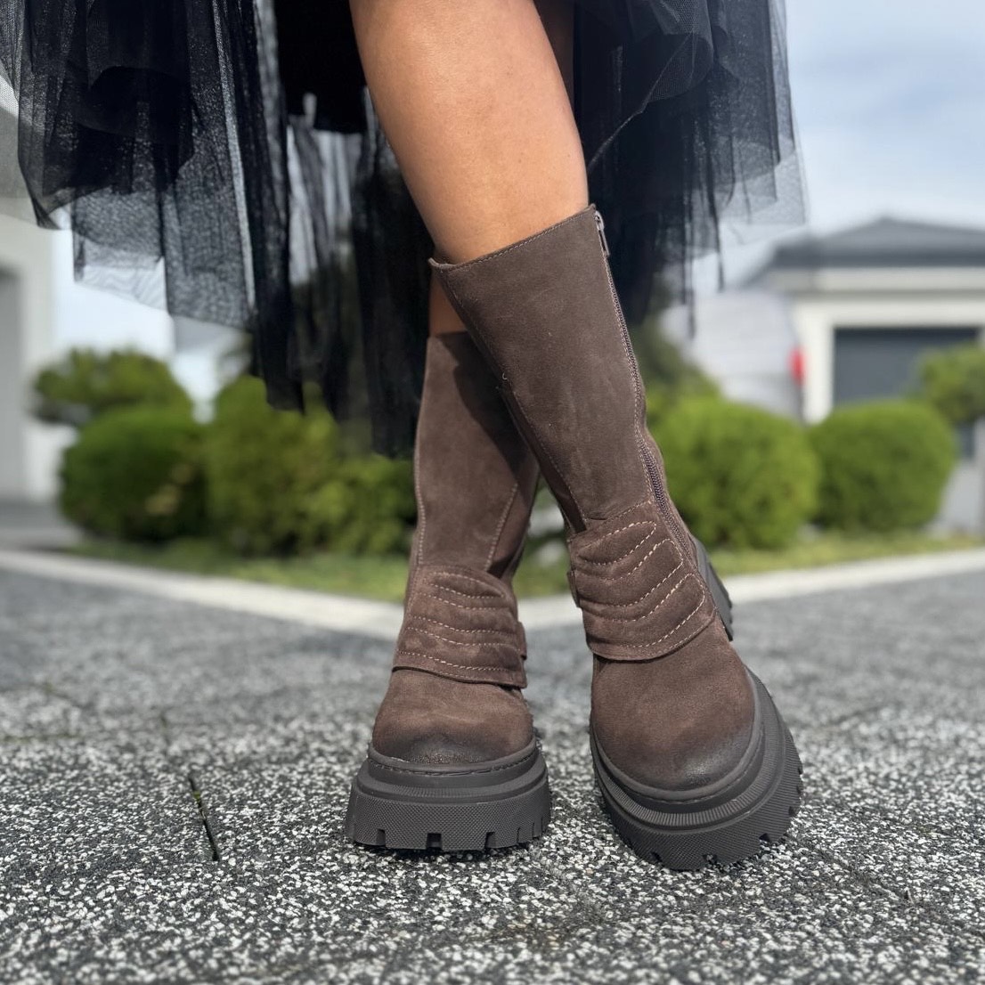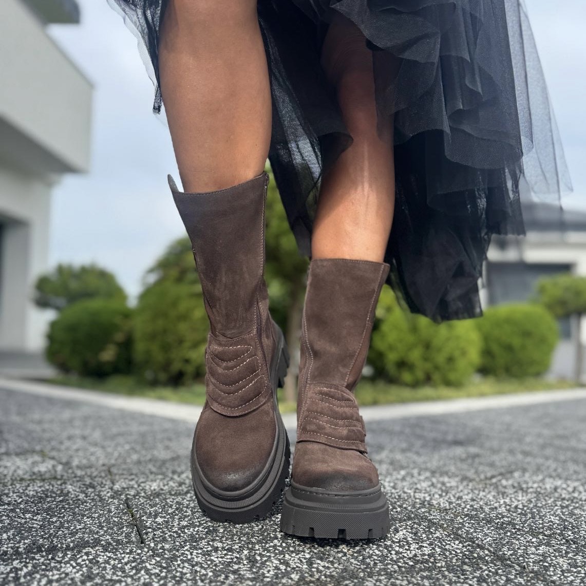 Piękne wysokie ocieplane trapery model Solofra. Wysokość cholewy sięga połowy łydki dzięki ciekawemu rozwiązaniu góry cholewki oraz zastosowanej gumie z zewnętrznej strony buty dopasowują się prawie do każdej nogi. Użyty zamek z wewnętrznej strony zapewnia komfort i wygodę podczas zakładani oraz zdejmowania obuwia. Buty zostały wykonane na zjawiskowej podeszwie o podwyższonym boku oraz grubym traperze. Wzór ten może znaleźć zastosowanie w wielu bardzo różnych stylizacjach ograniczenie to tylko wyobraźnia i wyczucie użytkownika.