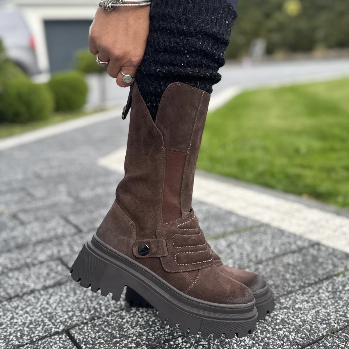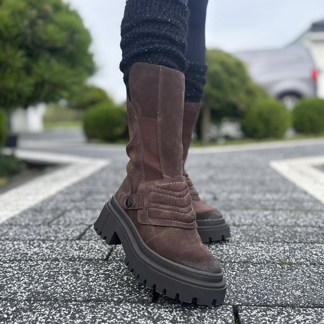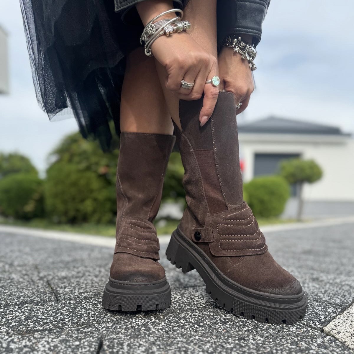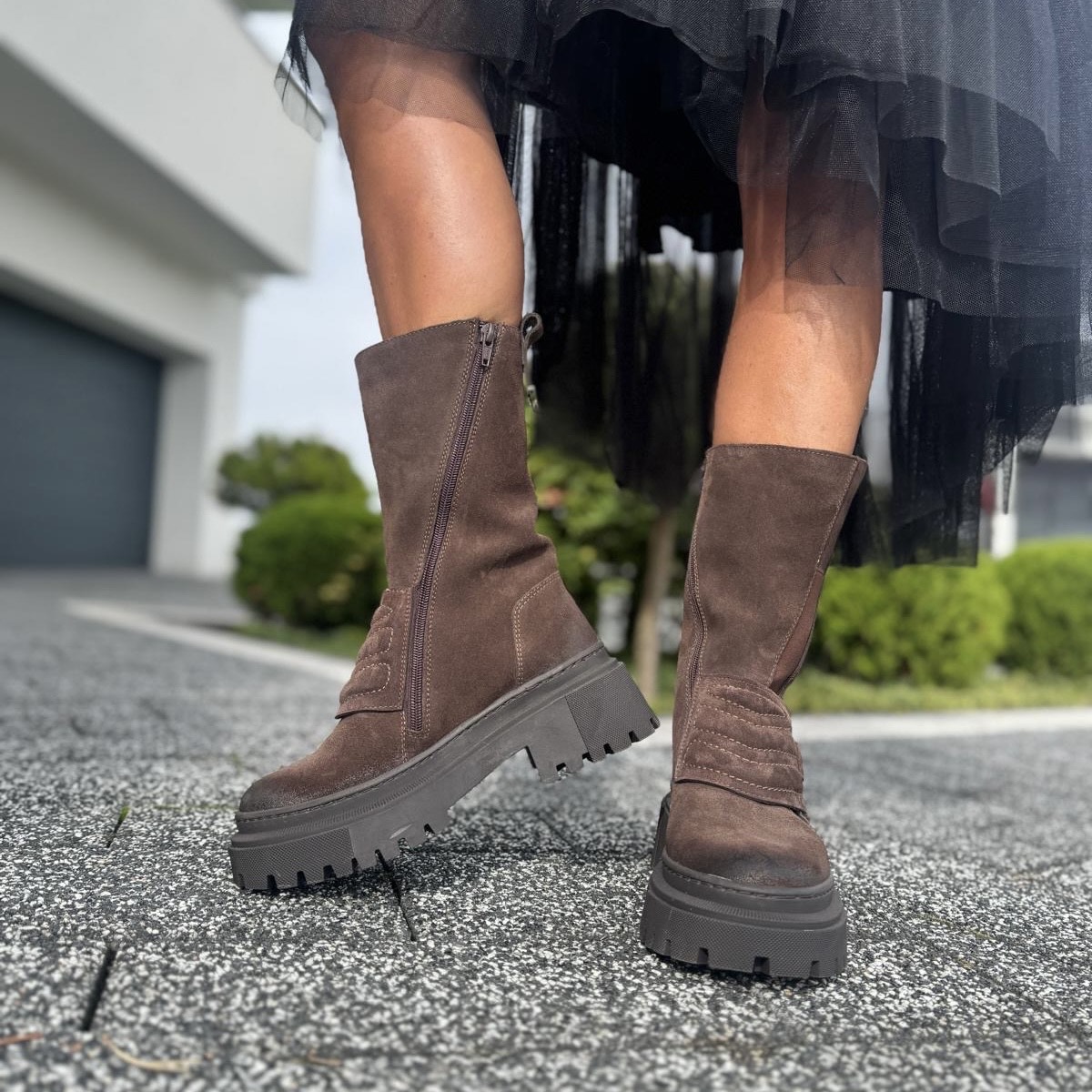 Piękne wysokie ocieplane trapery model Solofra. Wysokość cholewy sięga połowy łydki dzięki ciekawemu rozwiązaniu góry cholewki oraz zastosowanej gumie z zewnętrznej strony buty dopasowują się prawie do każdej nogi. Użyty zamek z wewnętrznej strony zapewnia komfort i wygodę podczas zakładani oraz zdejmowania obuwia. Buty zostały wykonane na zjawiskowej podeszwie o podwyższonym boku oraz grubym traperze. Wzór ten może znaleźć zastosowanie w wielu bardzo różnych stylizacjach ograniczenie to tylko wyobraźnia i wyczucie użytkownika.