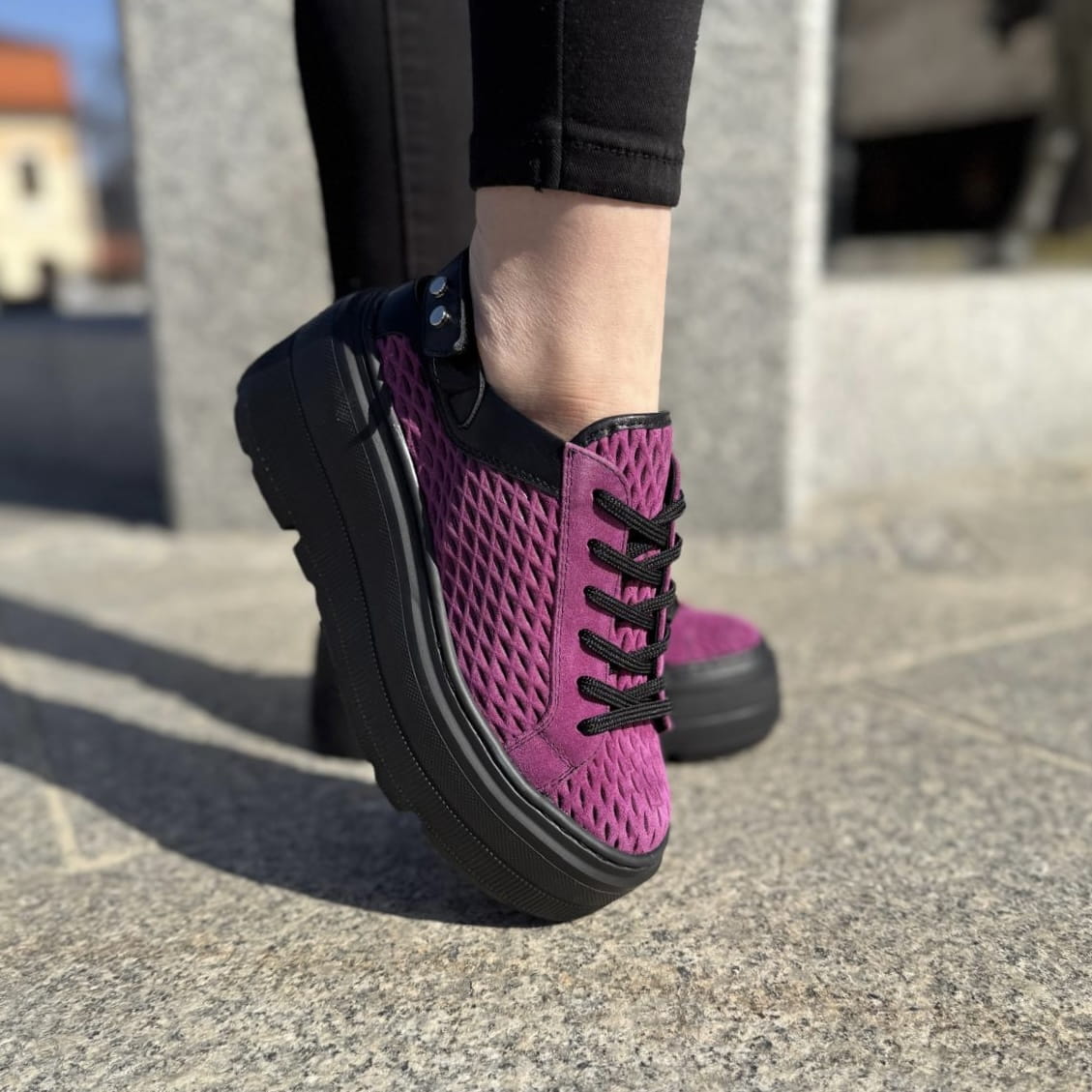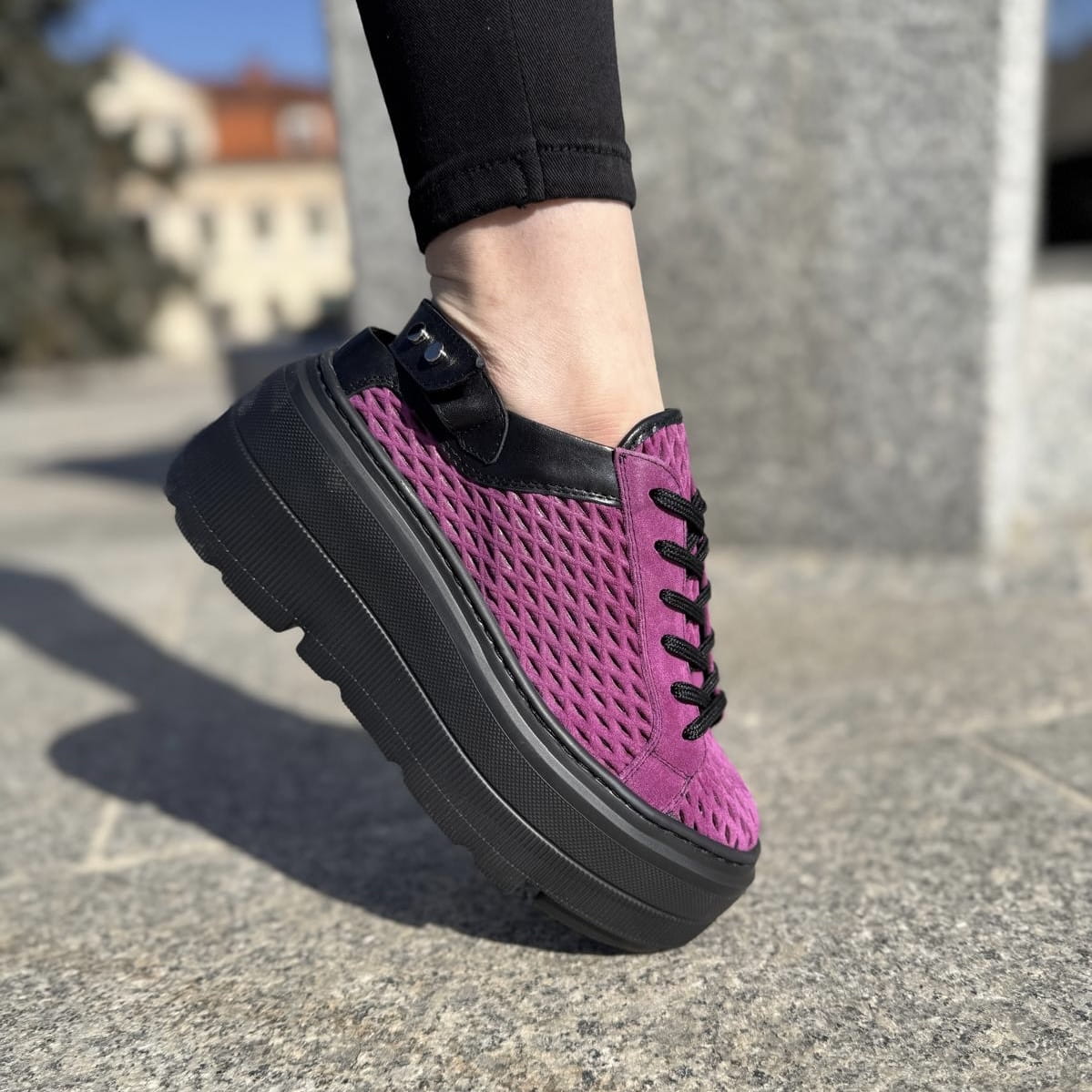 Fioletowe Letnie Sneakersy Damskie bez pięty na platformie model ULTEN PURPLE skóra naturalna