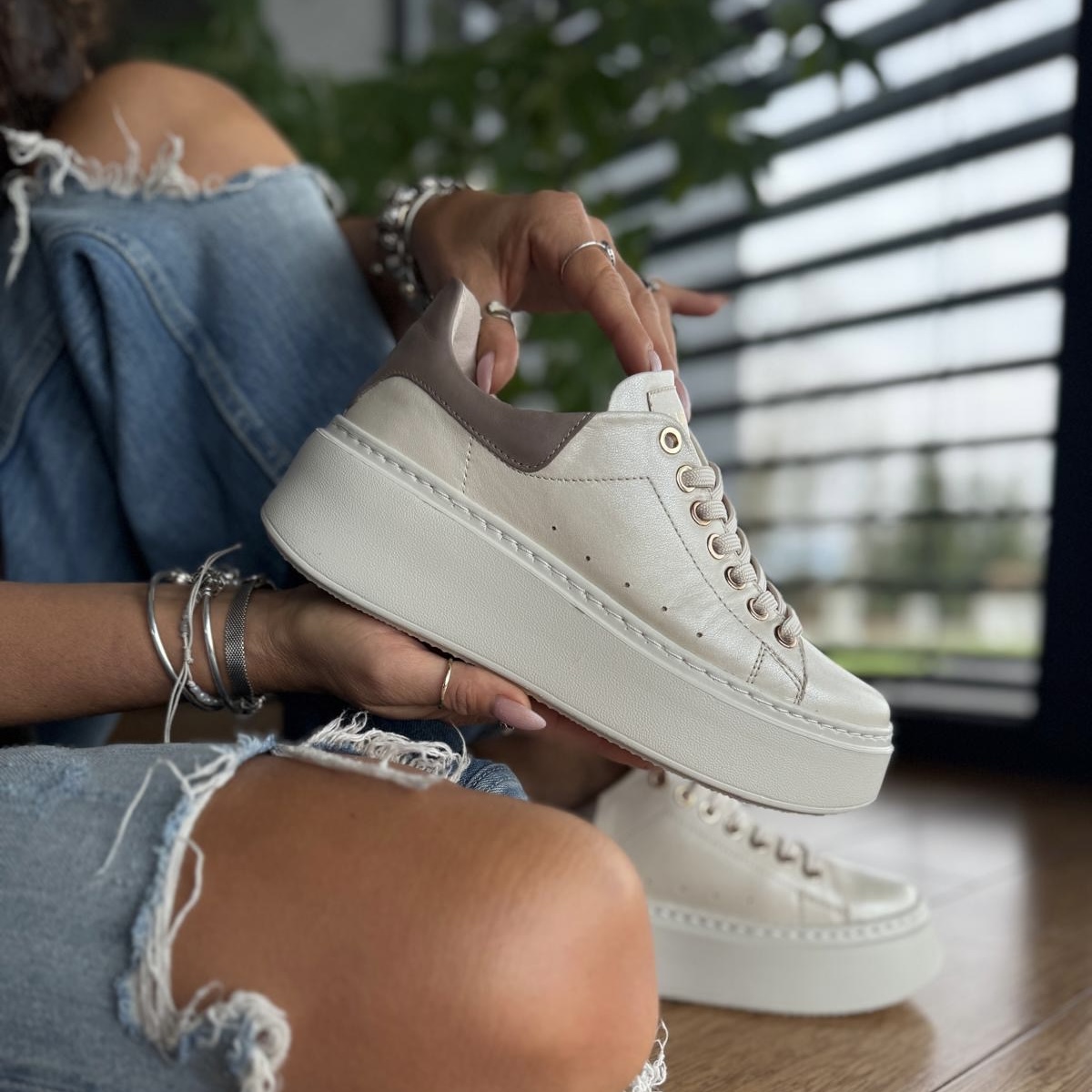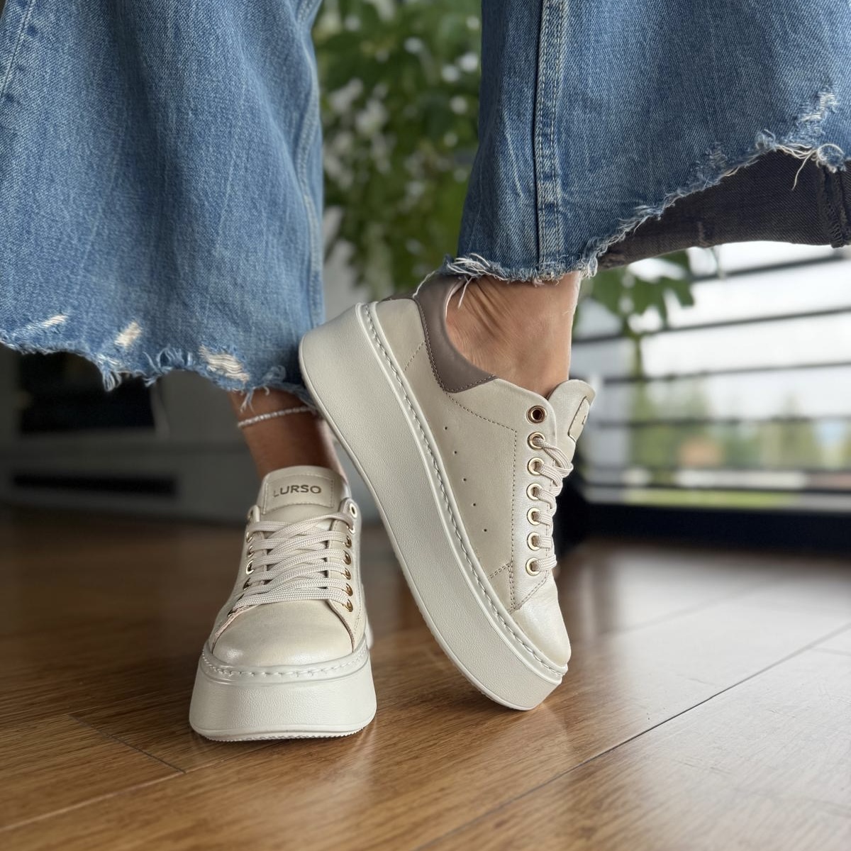 Jasnobeżowe perłowe Sneakersy Damskie LURSO model ARLETTE LIGHT BEIGE PEARL skóra naturalna