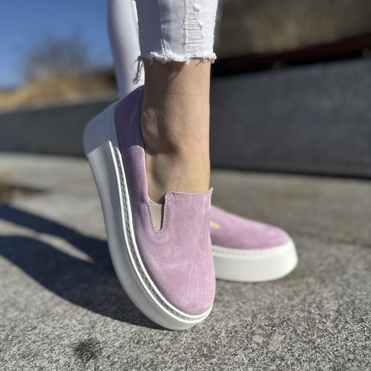 Jasnofiletowe Slipony Damskie LURSO na podwyższonej podeszwie model ELINI LIGHT PURPLE skóra naturalna