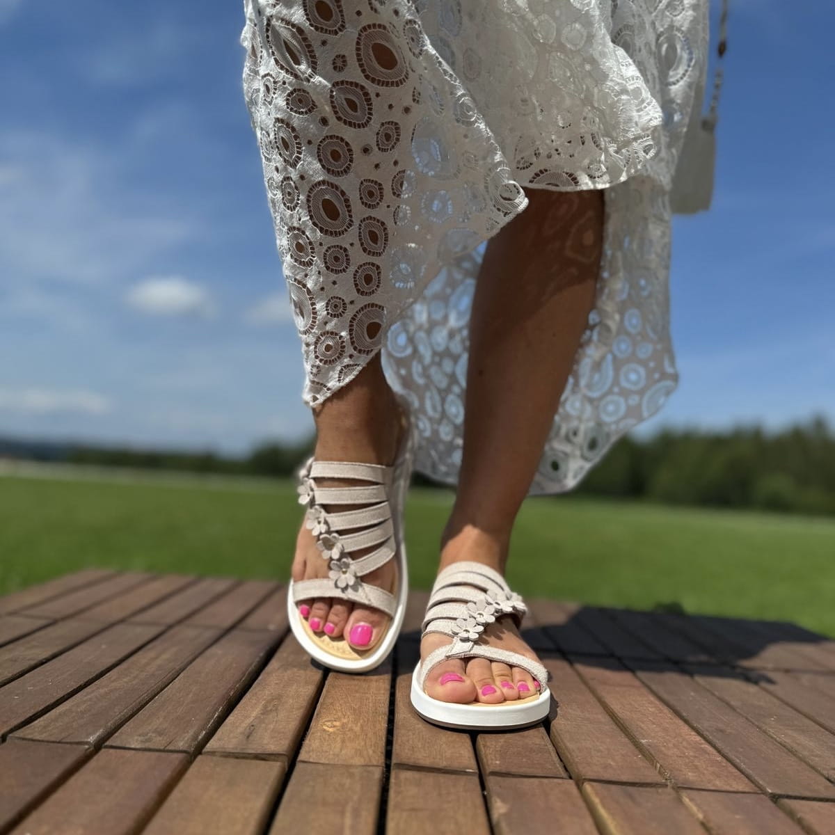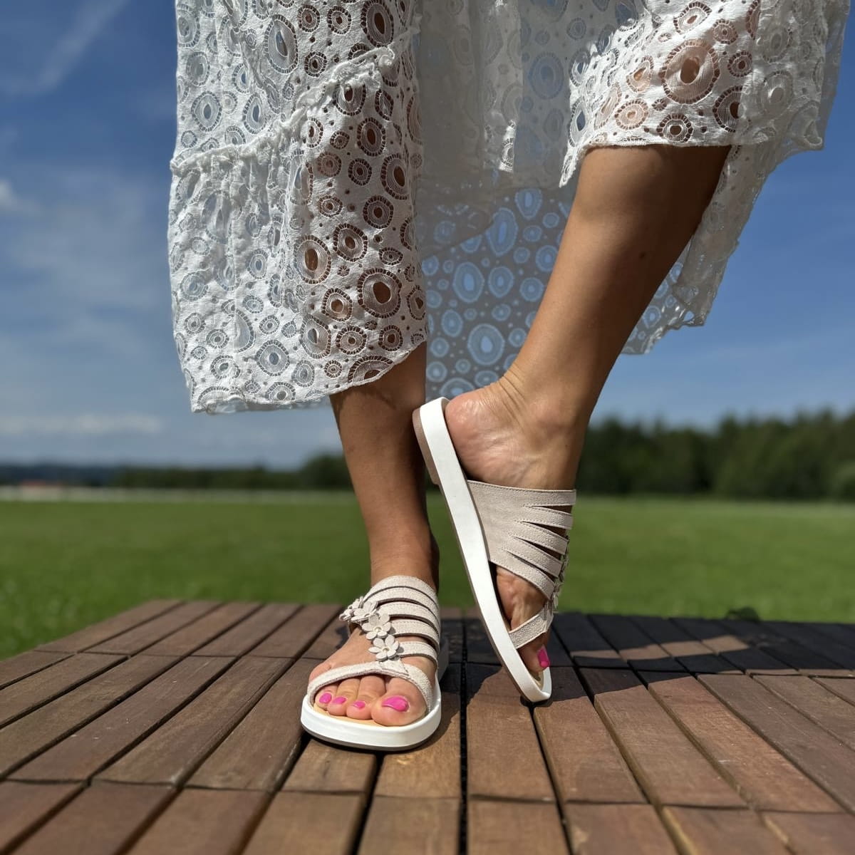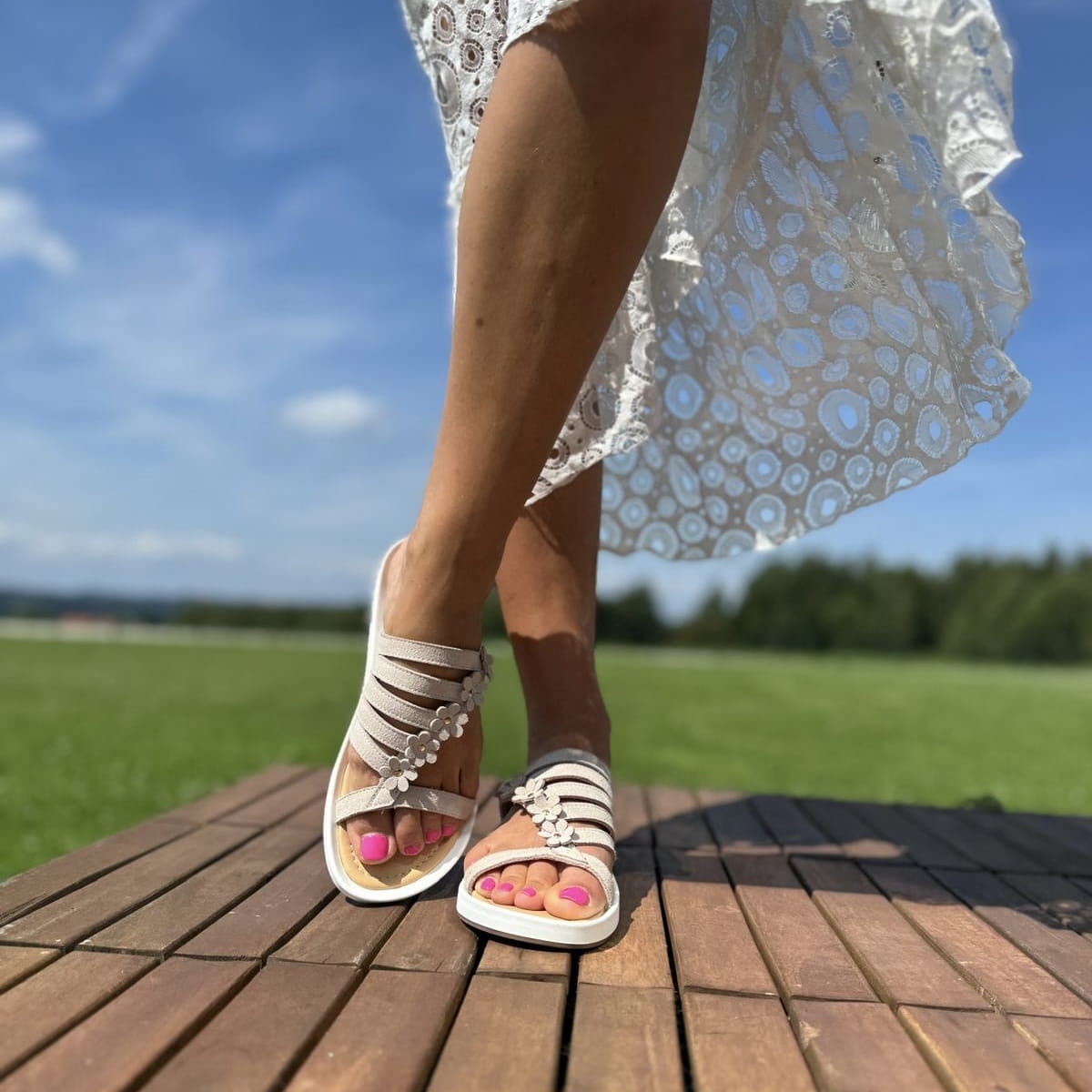 DALMINE to cudowne klapki. Bardzo ciekawie skrojona cholewka, dodatkowo została ozdobiona skórzanymi kwiatami. Model jest bardzo lekki. Wykonany na wygodnej podeszwie gwarantuje komfort użytkowania a jego nietuzinkowy wygląd przyciągnie uwagę niejednej pary oczu.