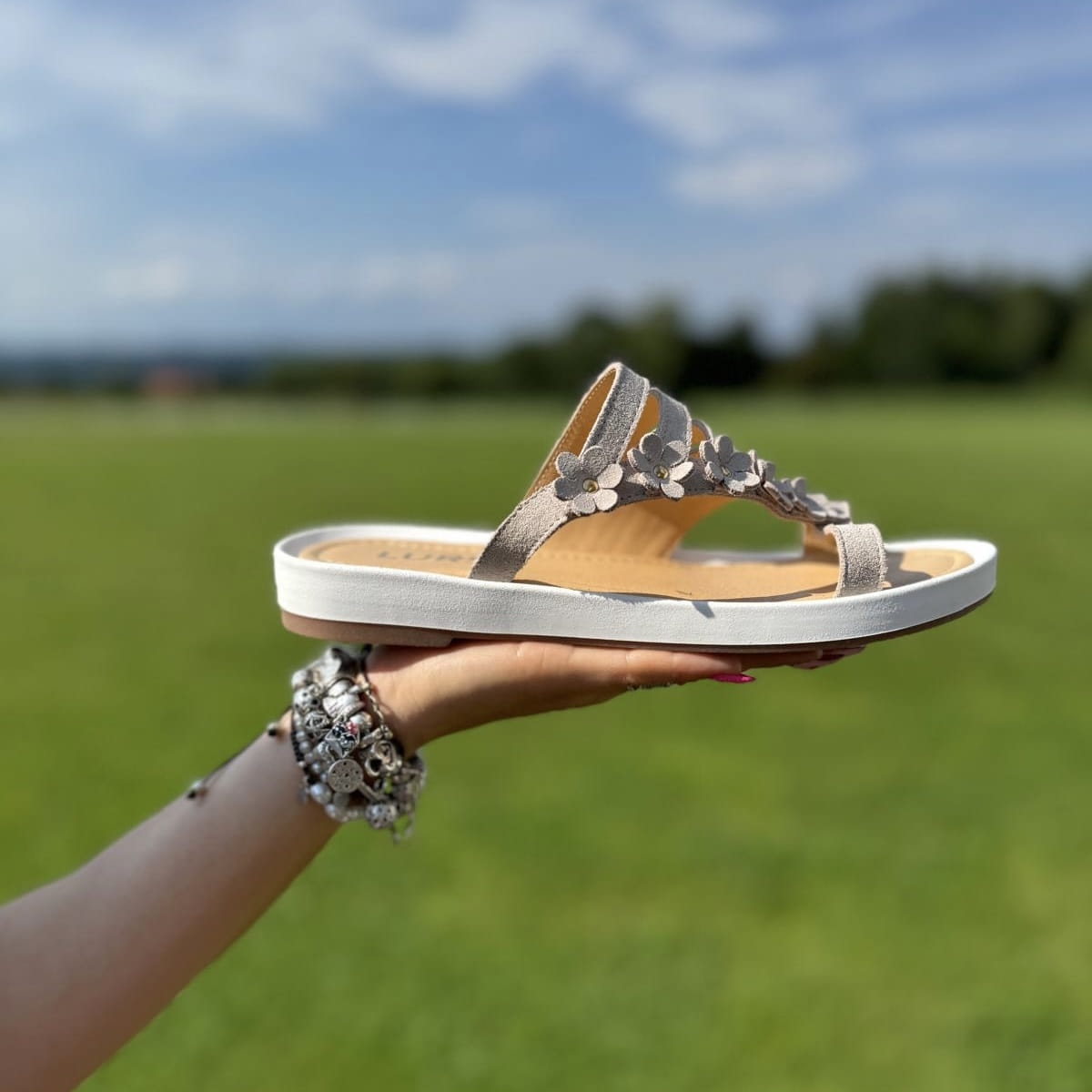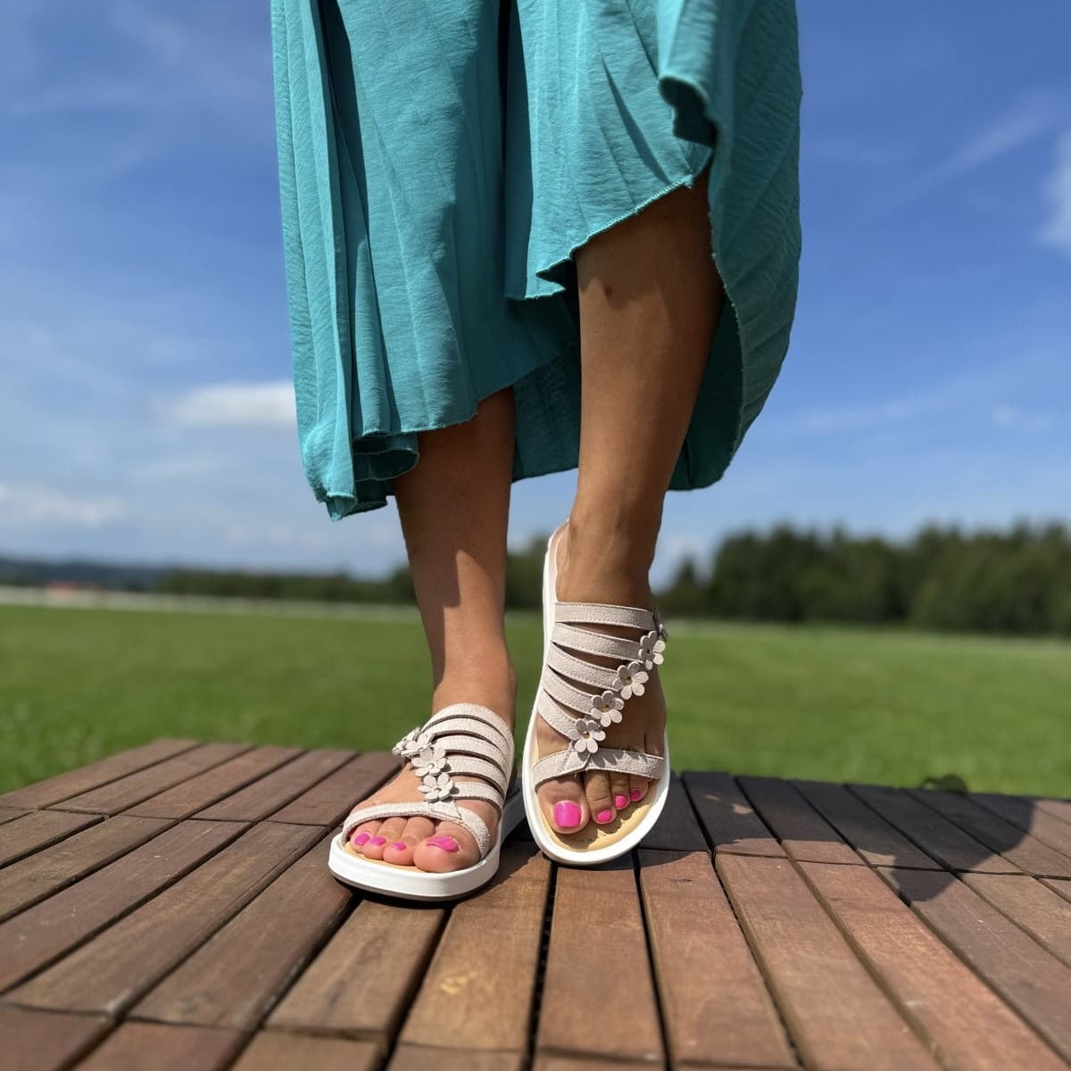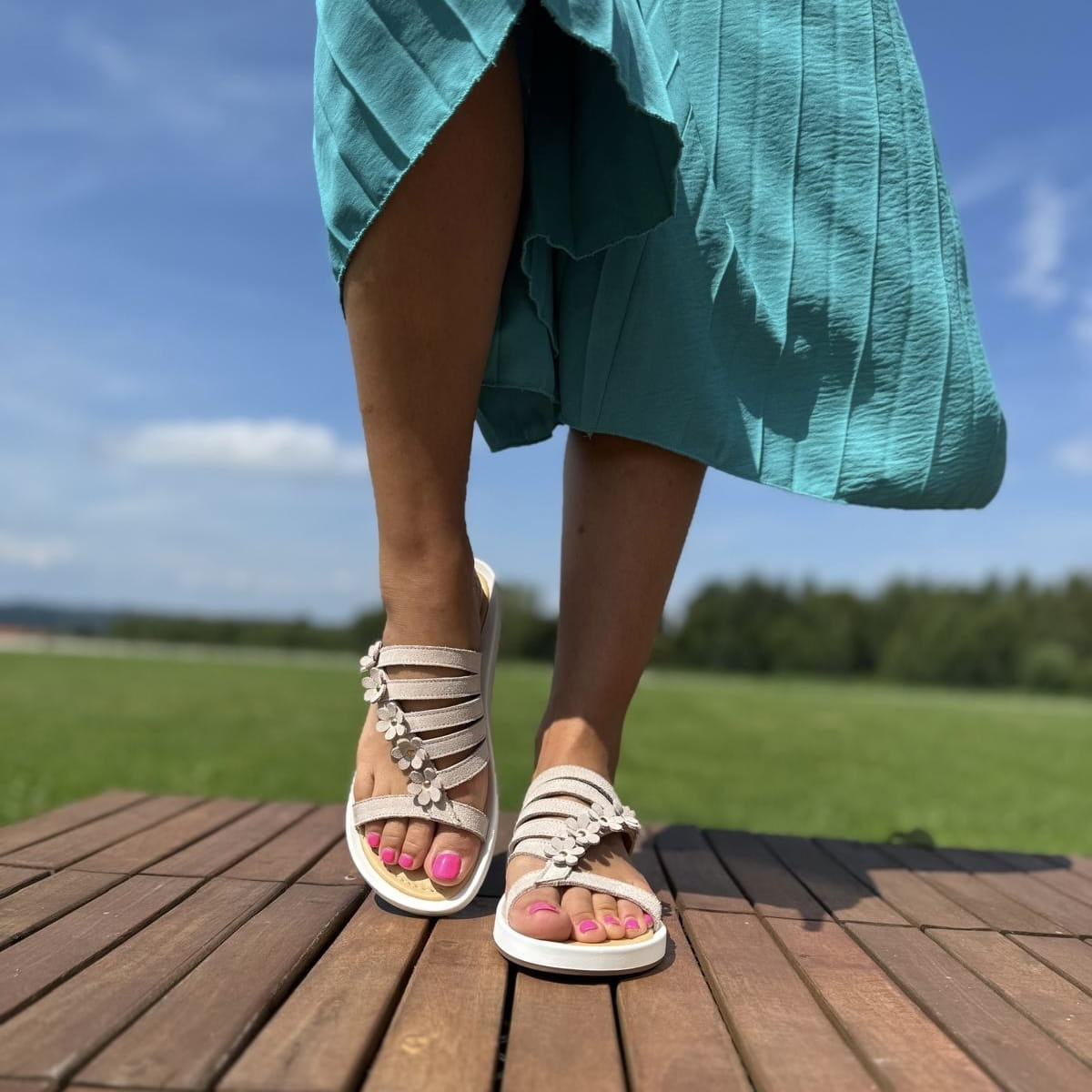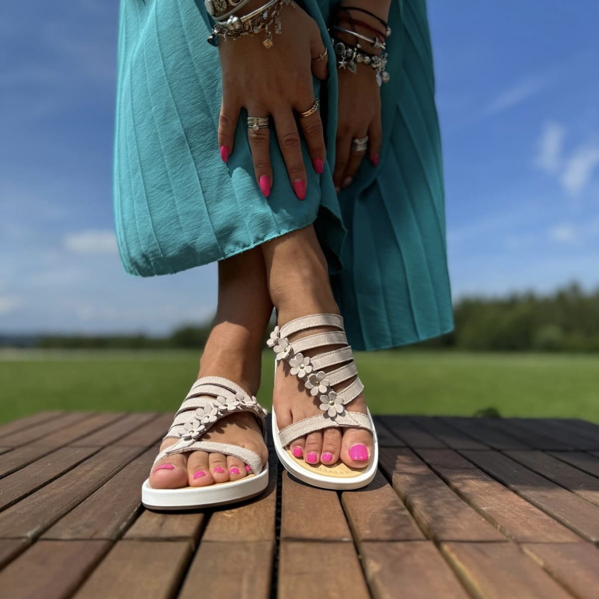 DALMINE to cudowne klapki. Bardzo ciekawie skrojona cholewka, dodatkowo została ozdobiona skórzanymi kwiatami. Model jest bardzo lekki. Wykonany na wygodnej podeszwie gwarantuje komfort użytkowania a jego nietuzinkowy wygląd przyciągnie uwagę niejednej pary oczu.