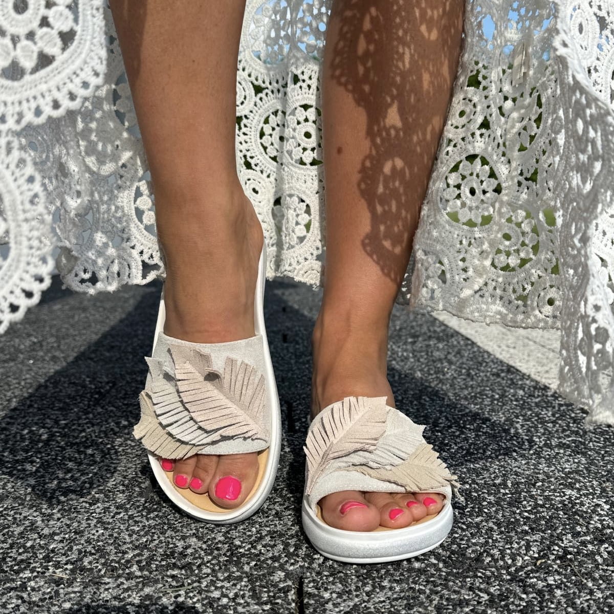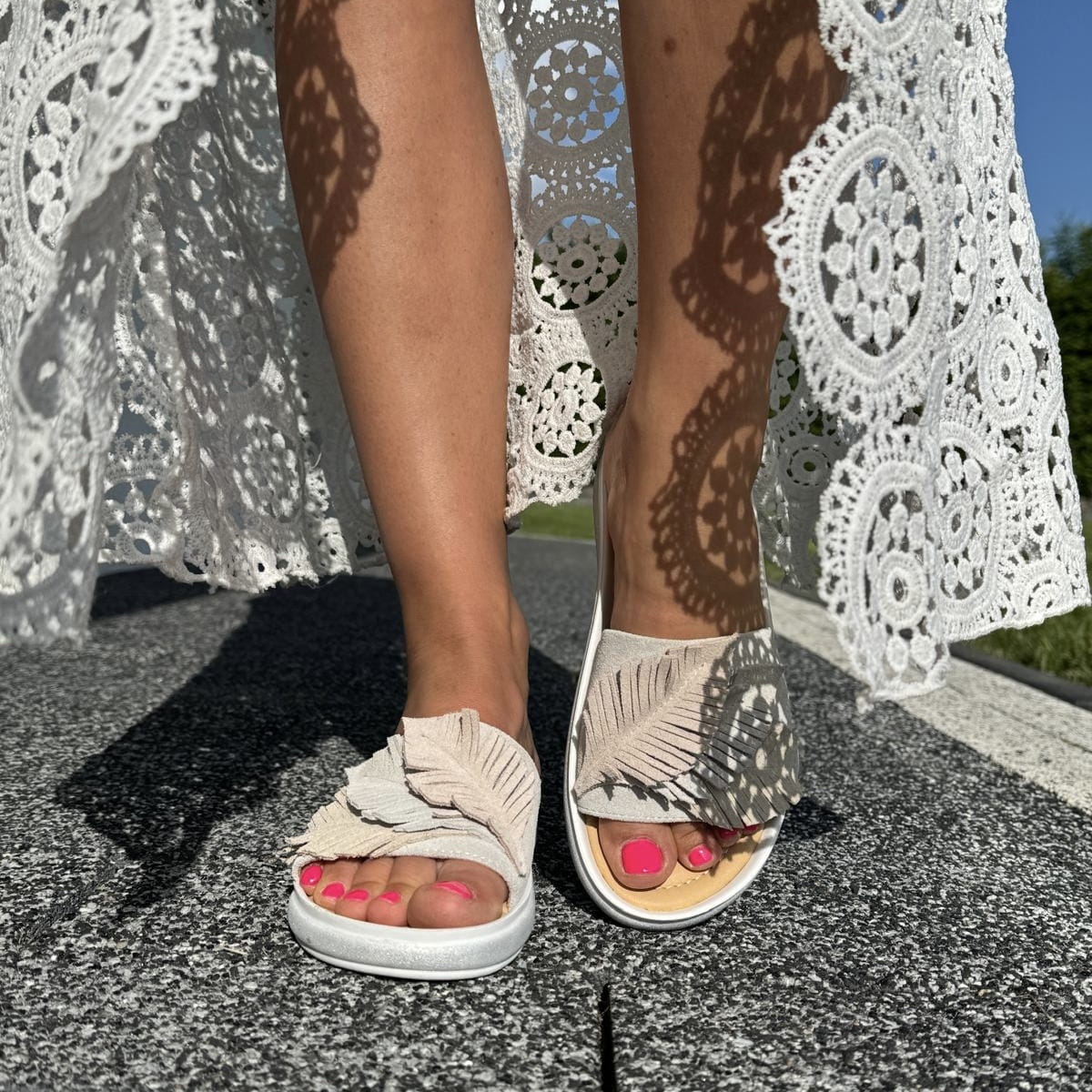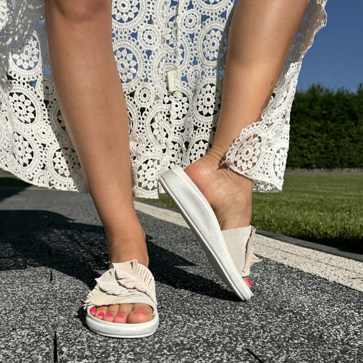Cudowne klapki - model LIVORNO. Klasyczna cholewka ozdobiona została wykonanymi ze skóry liśćmi. Model został położony na modnej delikatnie podwyższonej podeszwie. Piękne malowanie tej podeszwy również zwraca uwagę.