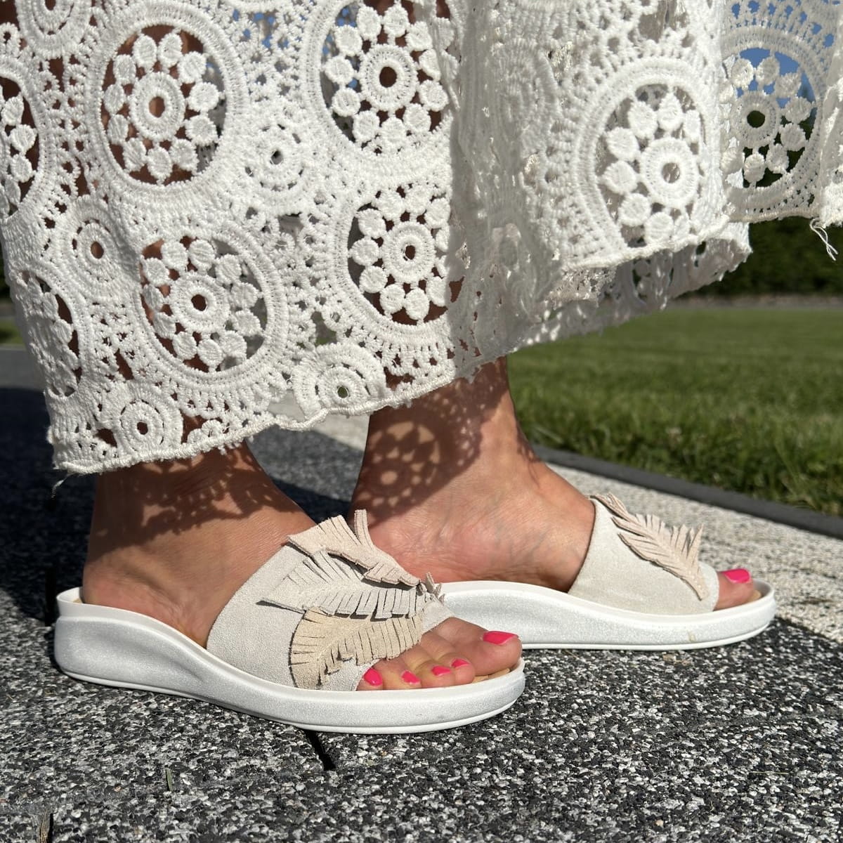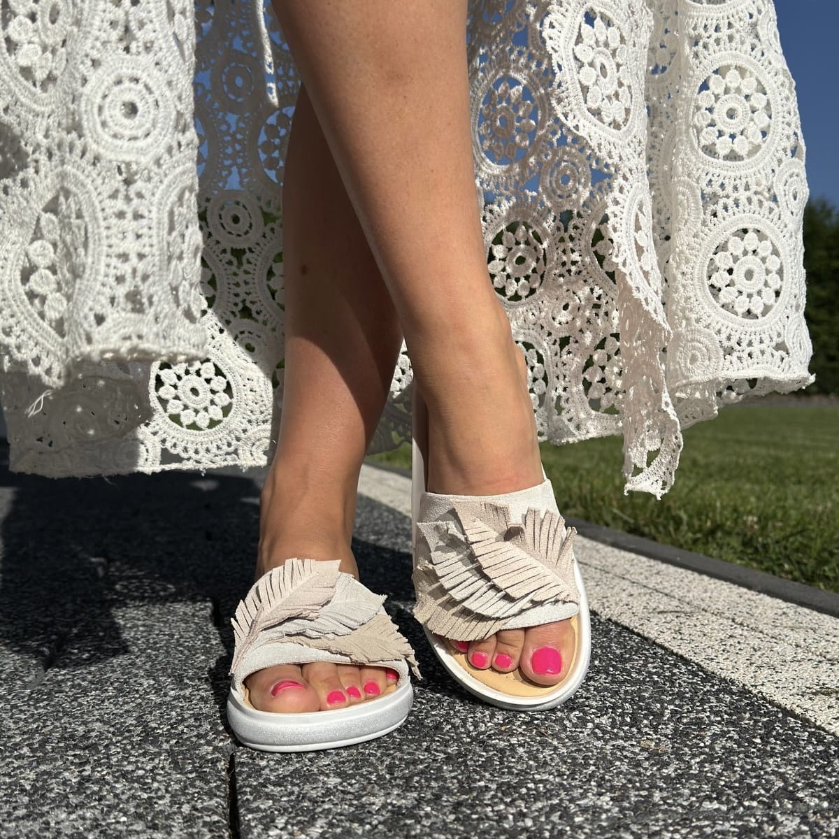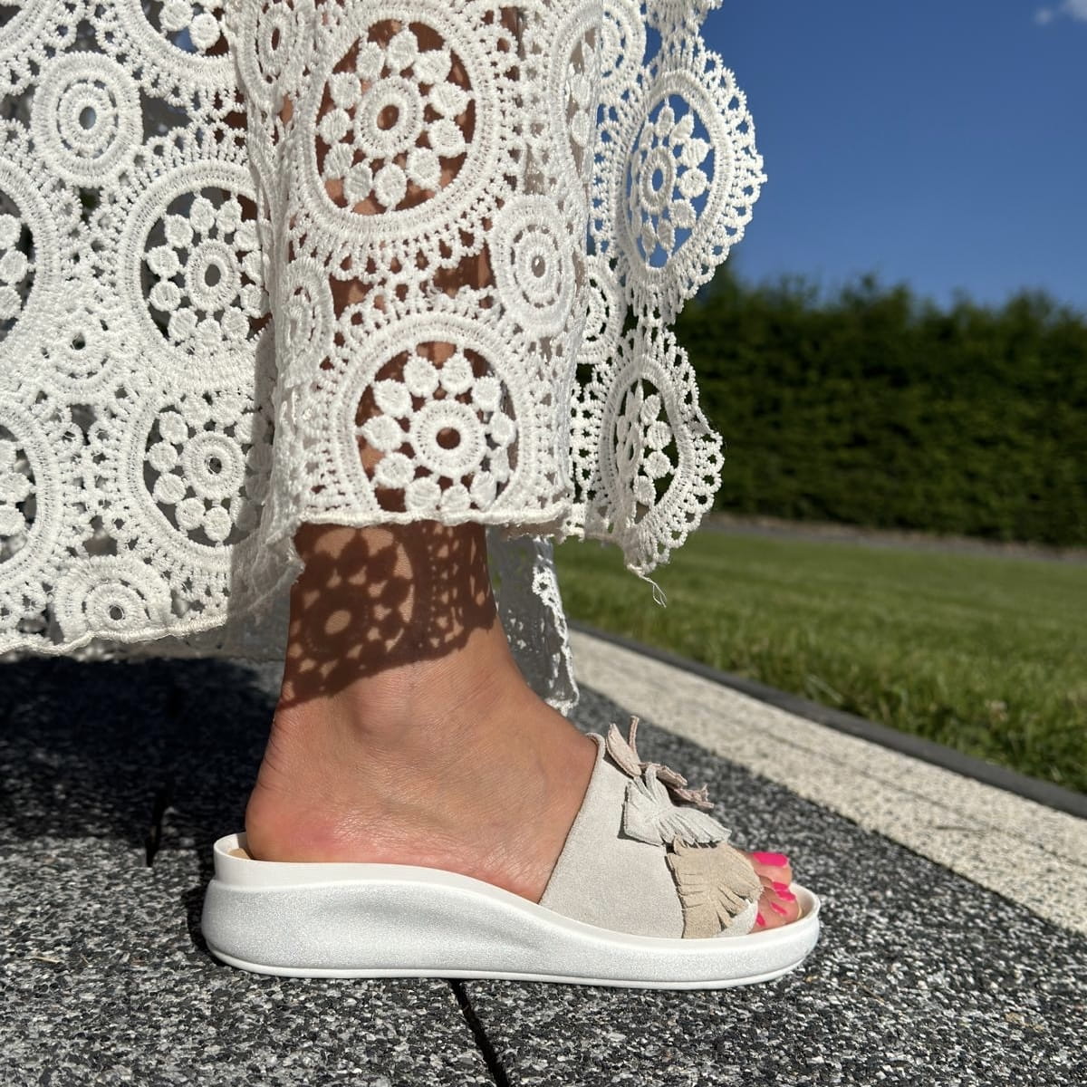 Cudowne klapki - model LIVORNO. Klasyczna cholewka ozdobiona została wykonanymi ze skóry liśćmi. Model został położony na modnej delikatnie podwyższonej podeszwie. Piękne malowanie tej podeszwy również zwraca uwagę.