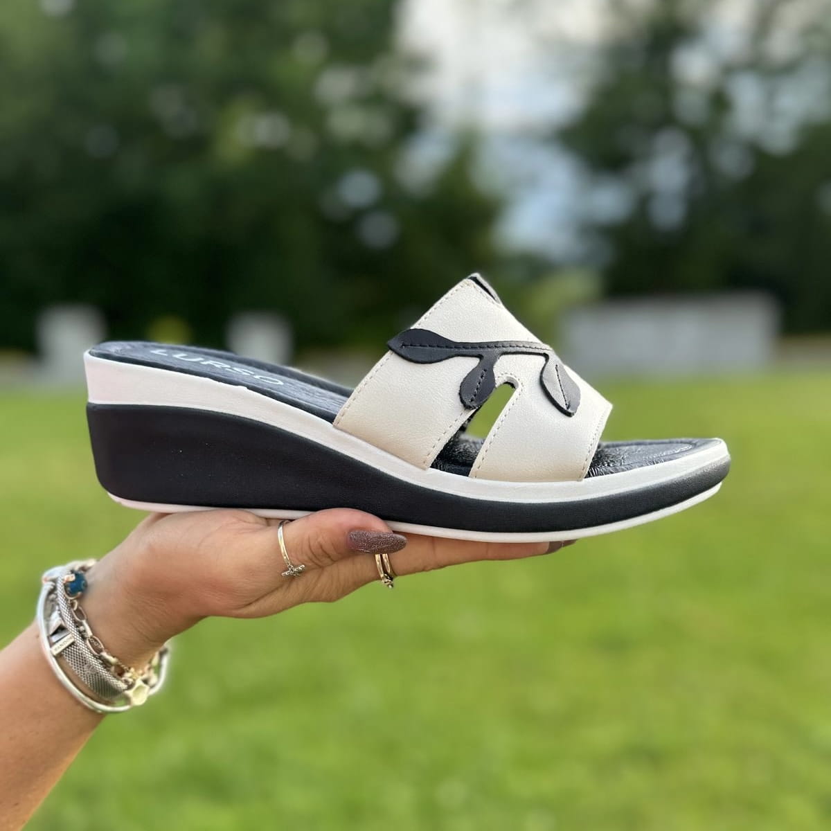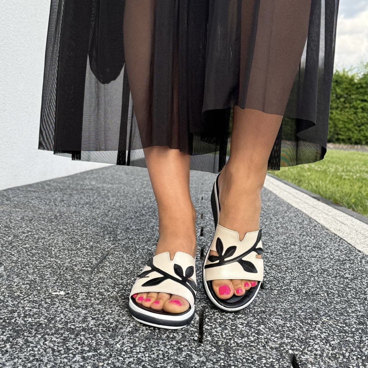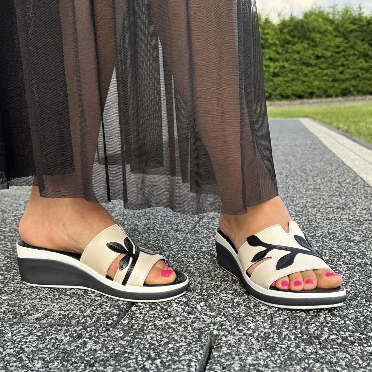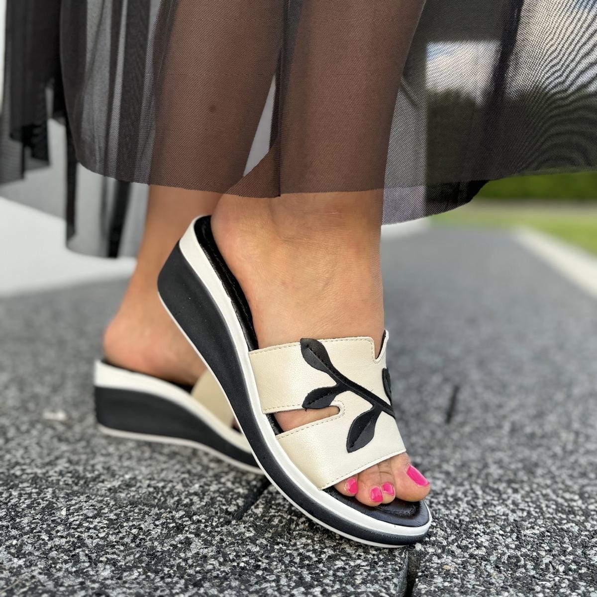 FABRIANO to bardzo piękny klapek. Modny wykrój cholewki został ozdobiony wykonaną ze skóry naturalnej gałązką liści. Cholewka została wykonana na podeszwie typu klin o nie za dużym uniesieniu.